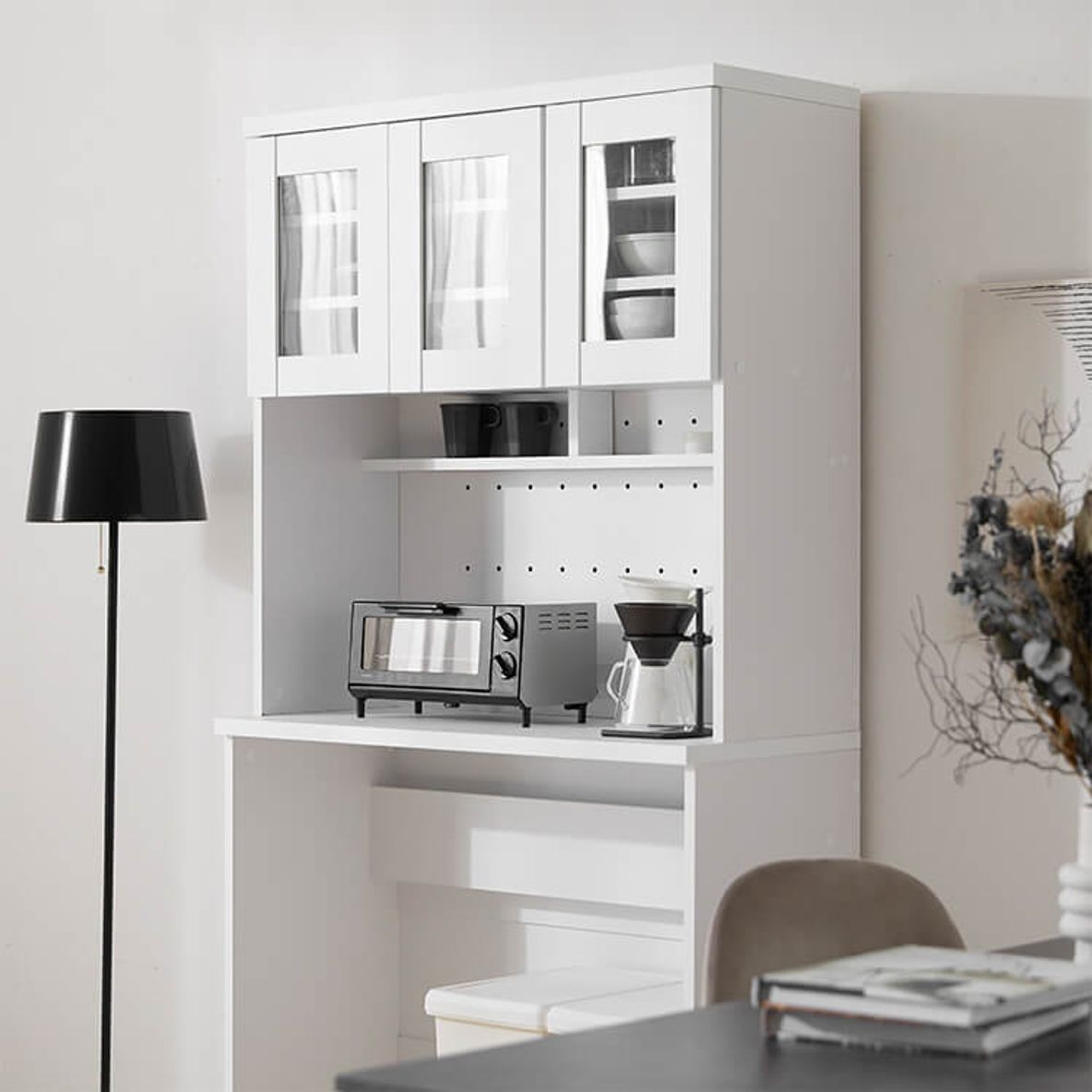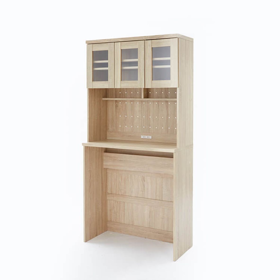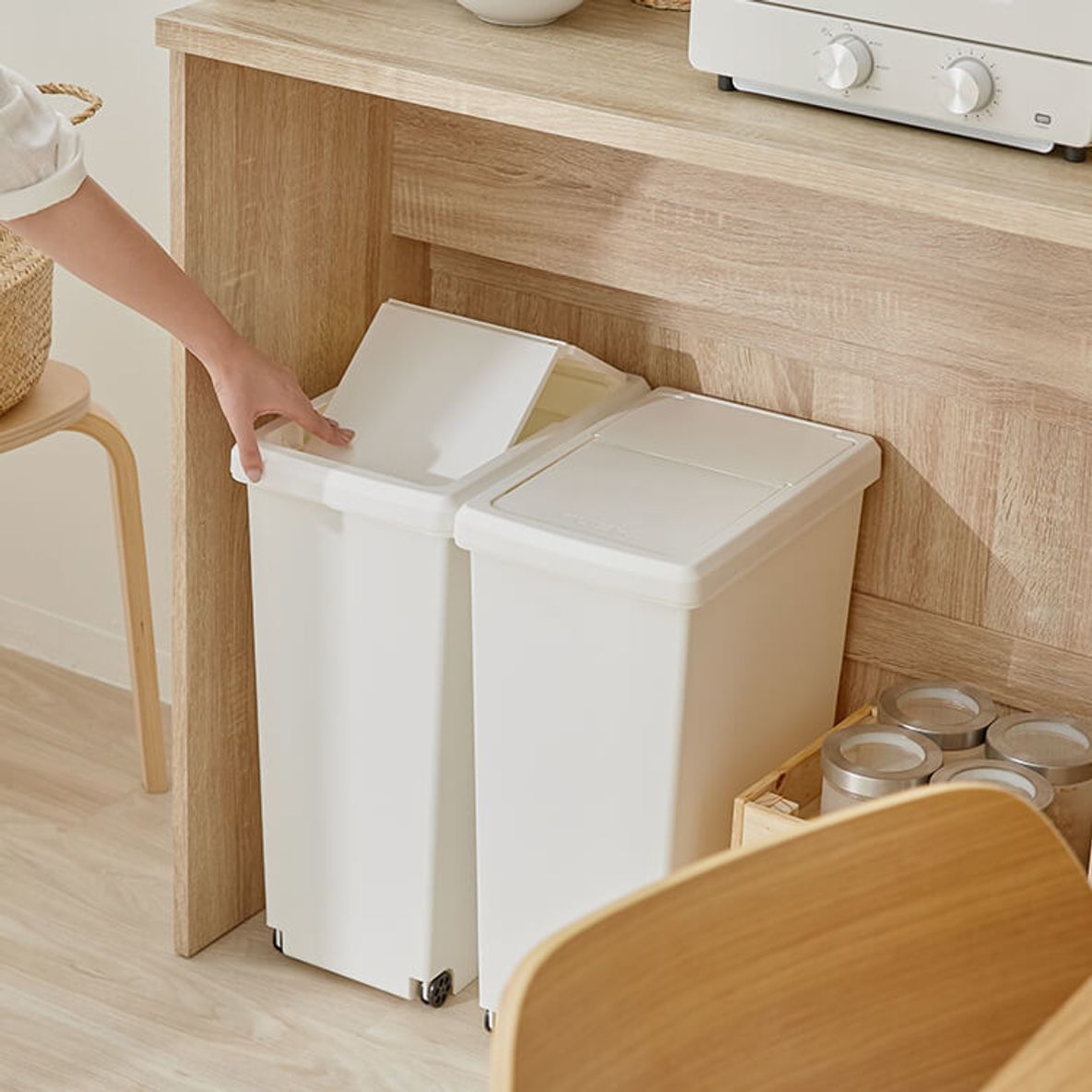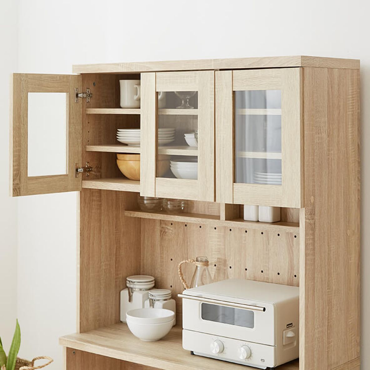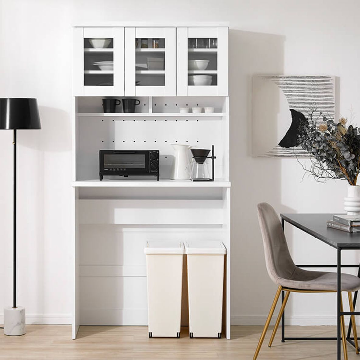 ダストボックスの上にできがちなデッドスペースを有効活用できるキッチンボード。限られたスペースを無駄なく使え、すっきりと片付いたキッチンスペースを作ります。ゴミ箱の上にできがちなもったいないスペース。この収納が使っていなかった空間の使い方を変え、お使いのキッチンスペースの可能性を広げます。ゆとりある高さ設計や、あると便利な袋収納ポケットなど、使い勝手を考えた機能が付いています。横幅は収納力をキープしつつも、スペースをとりすぎない90cm。1人暮らしでもファミリーでもお使いいただける賢いサイズ感です。奥行も約41cmと導線を妨げないスリム設計で、横から見てもシンプルですっきりとした見た目です。飽きの来ないシンプルなデザインは、置くものを引き立たせてくれるので、自分らしい見せる収納を楽しむこともできます。