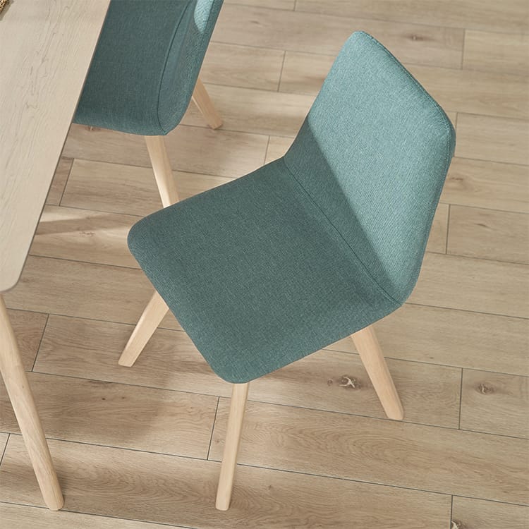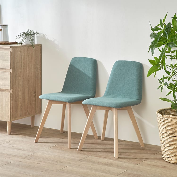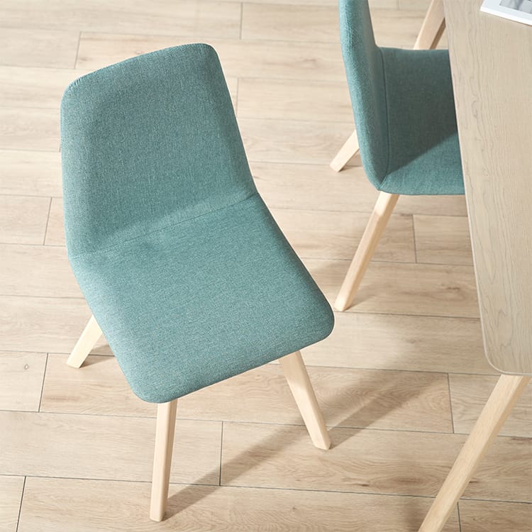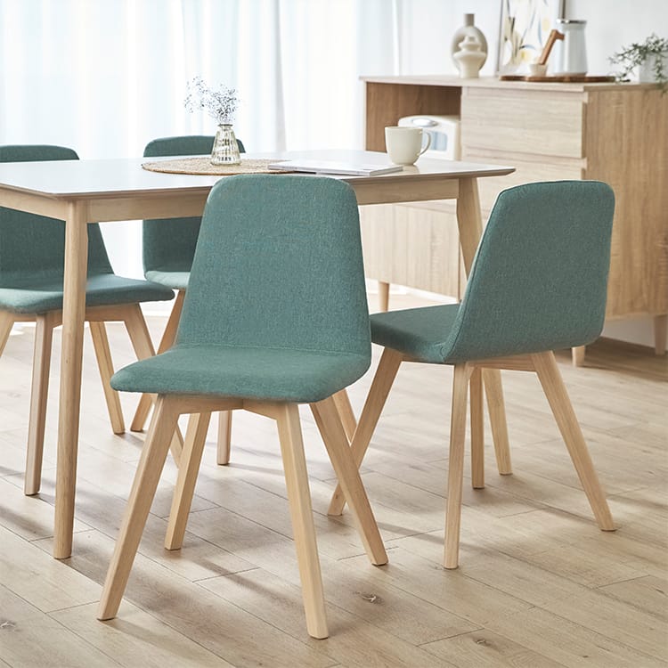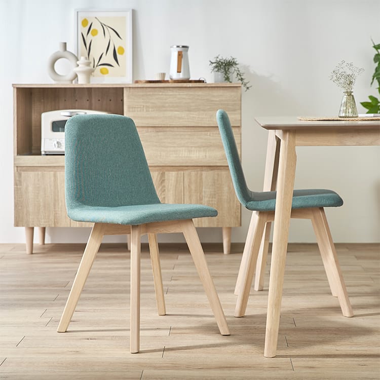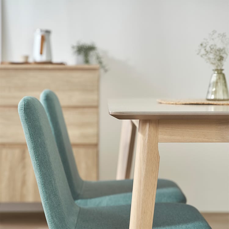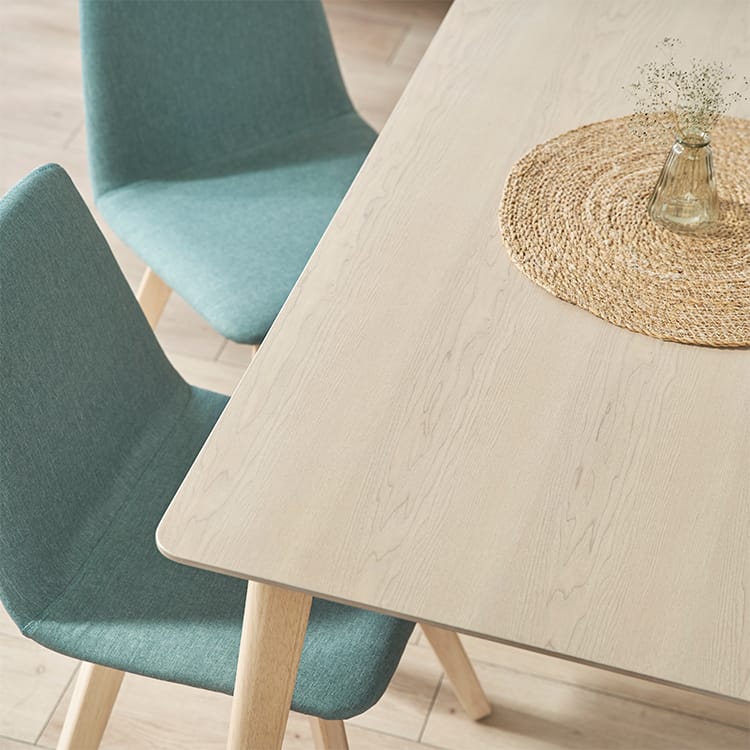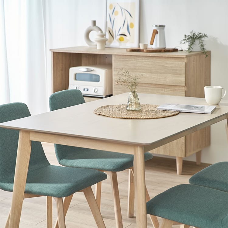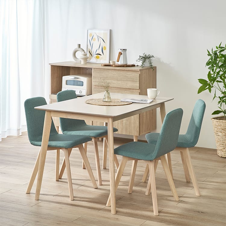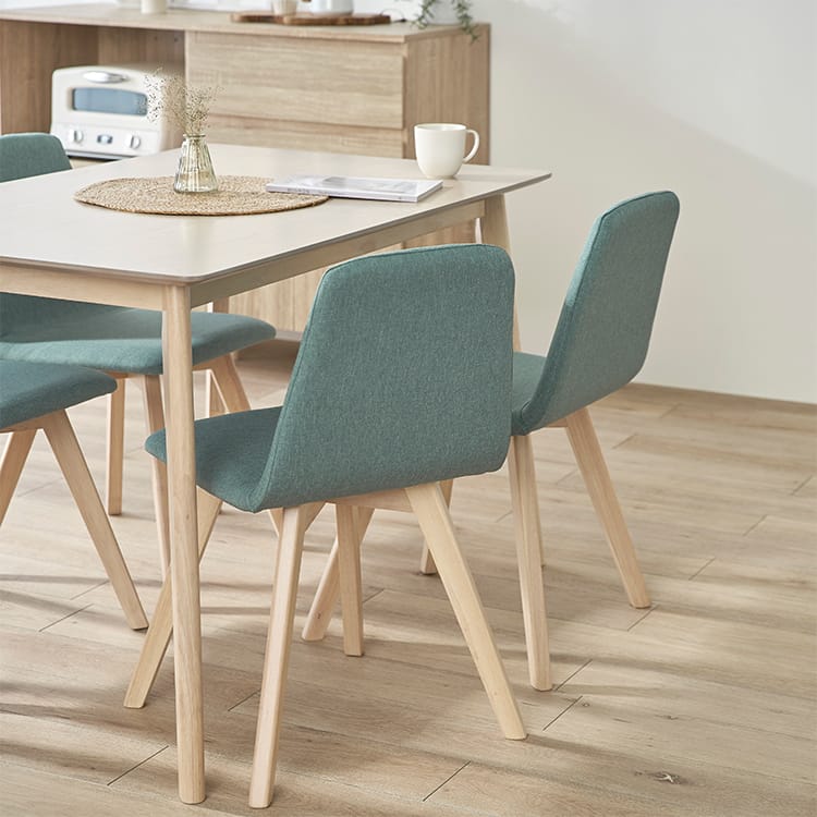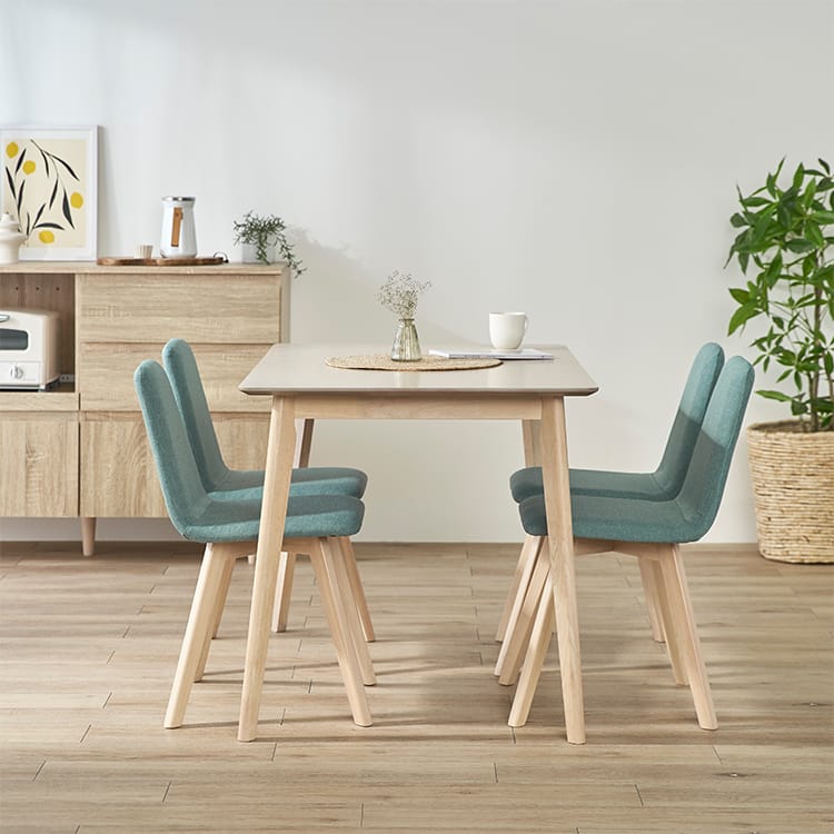 まるで北欧のオシャレなお家のリビングから持ってきたような、デザイン性の高いこのダイニングセット。カンタン組み立てで、たちまち北欧風ダイニング空間の完成!テーブル・チェアの脚部分を斜めにすることでデザイン性がグッとアップ。北欧テイストのお部屋にもピッタリ!デザイン性の高さを求める為に、チェアは当社スタッフがこだわりぬいたカラーを採用。ナチュラルさと大人っぽさのある絶妙な色合いを目指しました。張地は複数の色の糸を組み合わせて編んだファブリックを使用。一色の糸だけで編んだものよりも高級感がある仕上がりです。また、合皮などの座面に比べてベタつかず、冬のヒヤッと感も無いので、一年中爽やかにお使いいただけます。