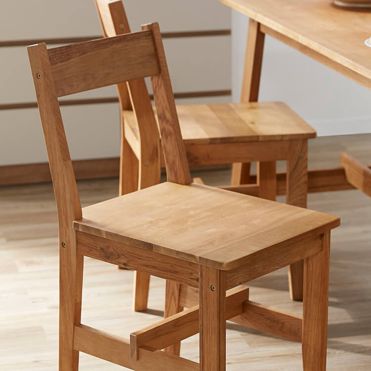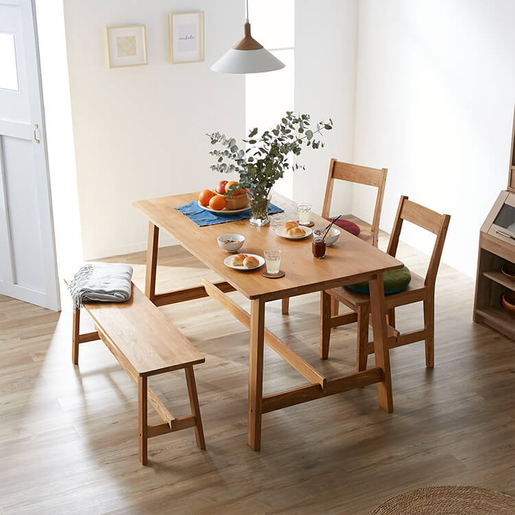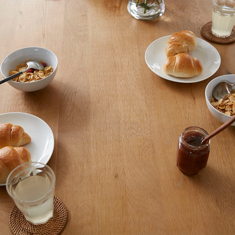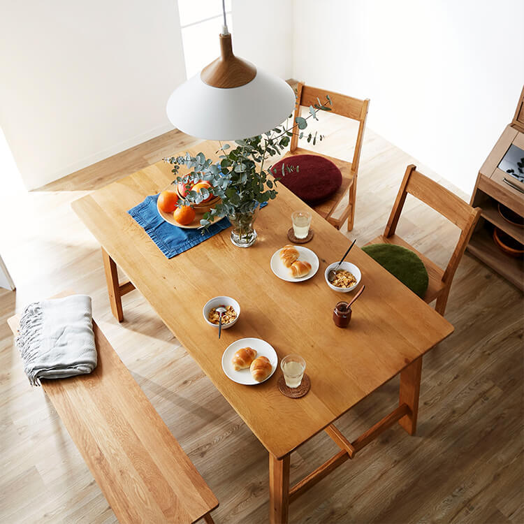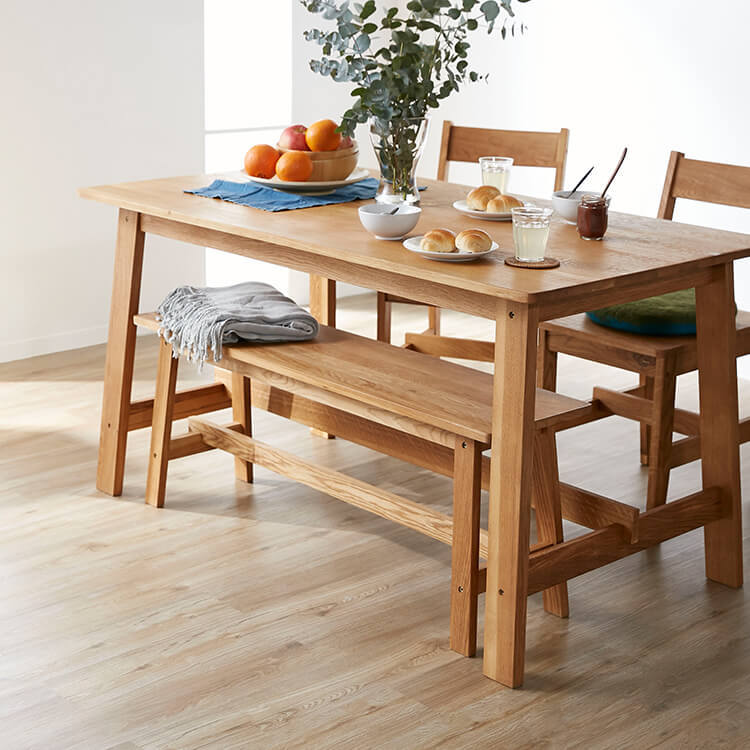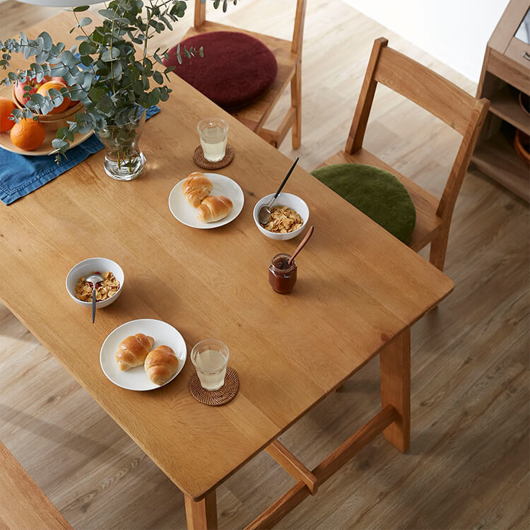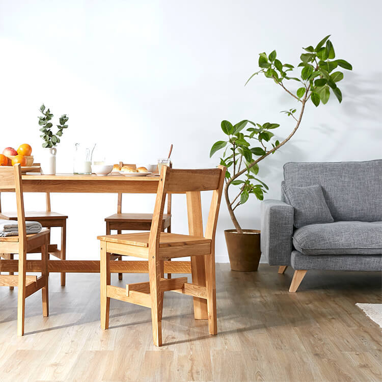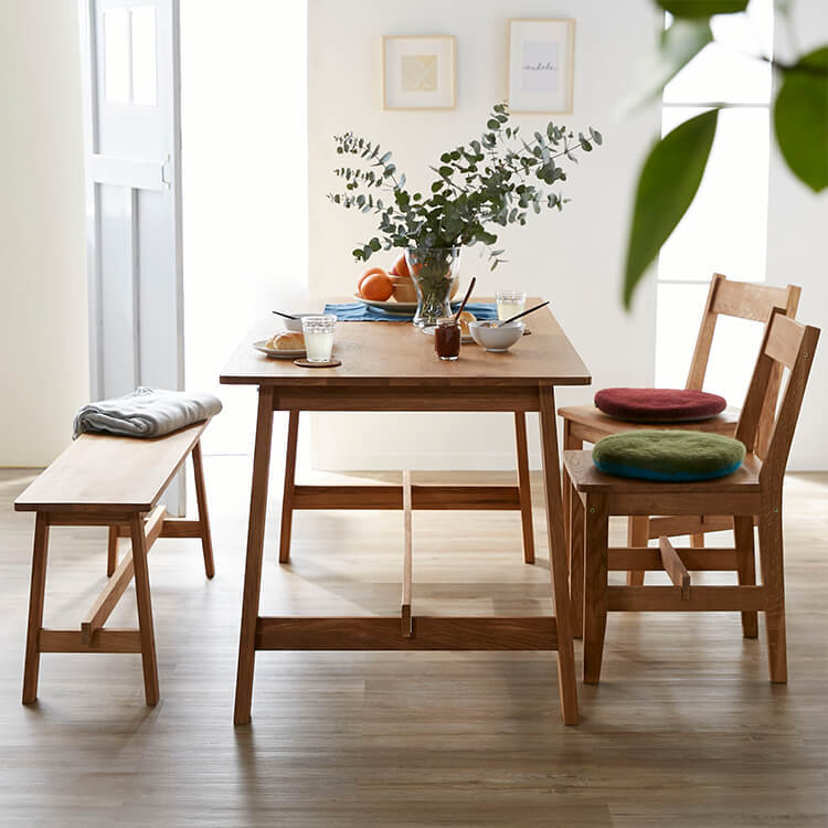 シンプルで飽きのこないデザイン。ほっとする本物の木のぬくもり。みんなが集まるダイニングで、憩いの時間をやさしく演出します。流行に左右されず、長くお使いいただけるように出来るだけシンプルな形にしました。テイストを選ばないので、どんなインテリアにも合わせることができます。贅沢に全てオーク無垢材で仕上げました。無垢材とは、原木から角材を切り出したもの。年数が経つにしたがって独特の味わいを醸し出し、愛着を持ってお使いいただくことができます。テーブルの天板サイズは140cm×75cm。大人4人で座ってもゆったりできるくつろぎサイズ感です。家族での普段の食事はもちろん、ちょっとしたホームパーティーにもピッタリ。