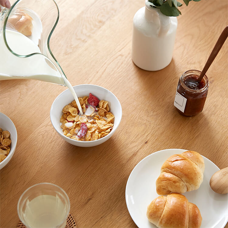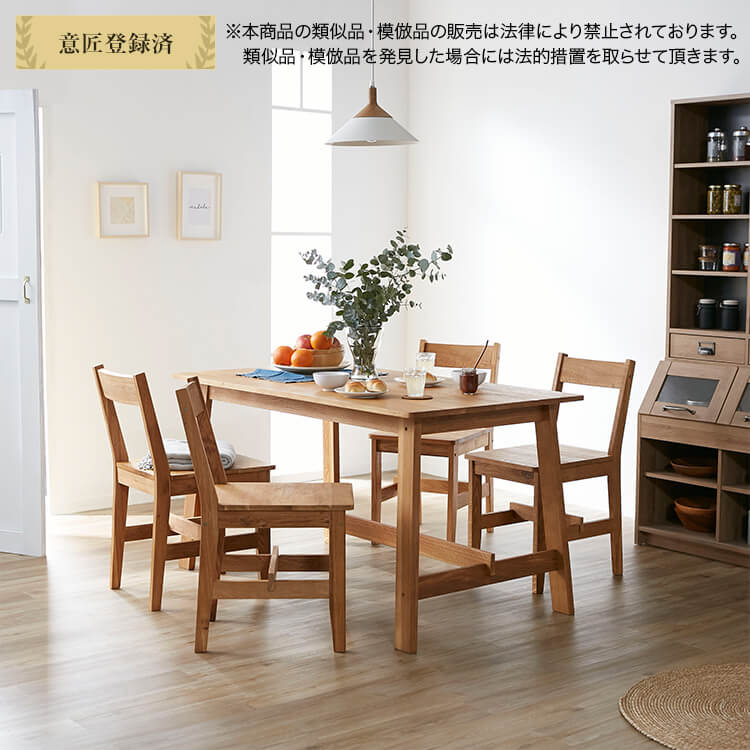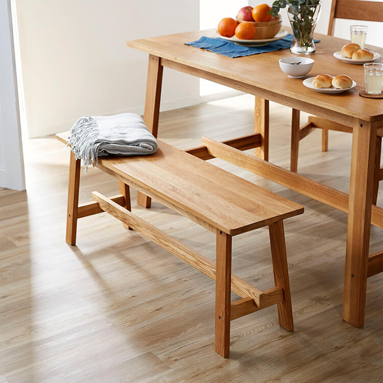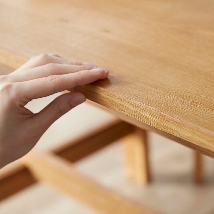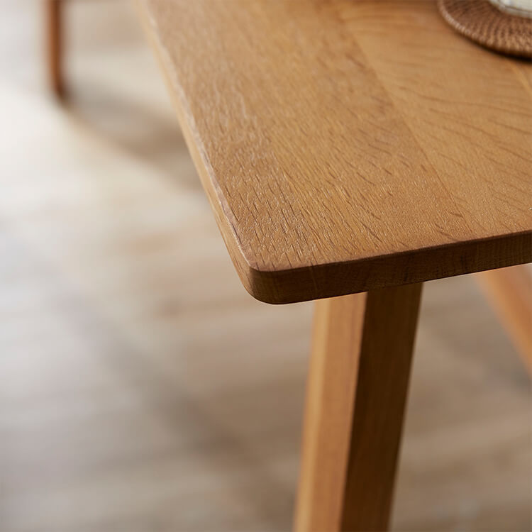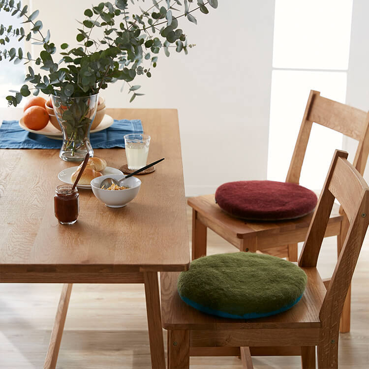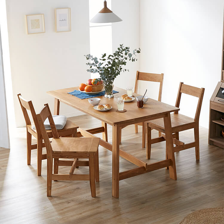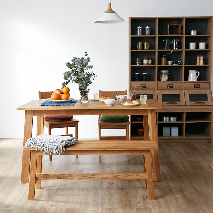 シンプルで飽きのこないデザイン。ほっとする本物の木のぬくもり。みんなが集まるダイニングで、憩いの時間をやさしく演出します。流行に左右されず、長くお使いいただけるように出来るだけシンプルな形にしました。テイストを選ばないので、どんなインテリアにも合わせることができます。贅沢に全てオーク無垢材で仕上げました。無垢材とは、原木から角材を切り出したもの。年数が経つにしたがって独特の味わいを醸し出し、愛着を持ってお使いいただくことができます。テーブルの天板サイズは140cm×75cm。大人4人で座ってもゆったりできるくつろぎサイズ感です。家族での普段の食事はもちろん、ちょっとしたホームパーティーにもピッタリ。