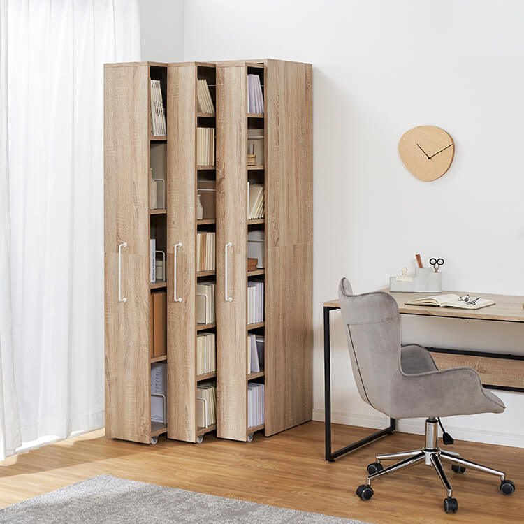 すきま本棚 大容量隙間収納 可動棚 隠しキャスター付き 木目調 スチール取っ手 子供部屋