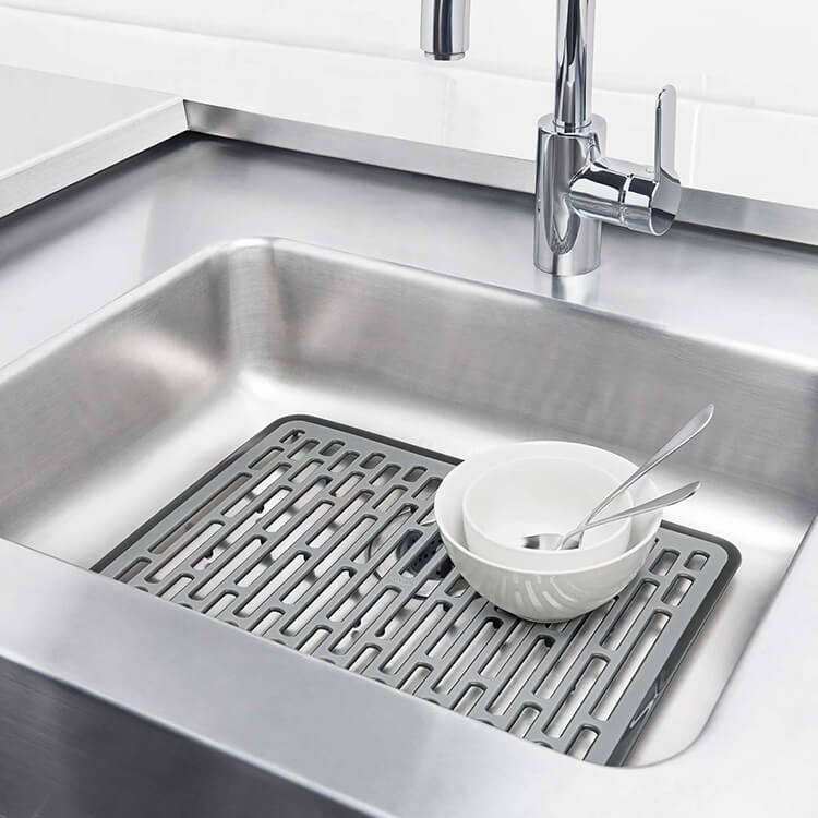 食器やグラスを衝撃から守り、シンクの傷つきを防ぐシンクマットです。「より多くの人にとって使いやすいデザイン」を意味するユニバーサルデザイン。男女問わず、お年寄りから子供まで、右利きでも左利きでも簡単に使える製品を作るアメリカのブランドです。水切れの良さと通気性を確保する穴の開いた形状と、高さのあるアシ部分で水はけ良く、いつでも清潔にお使いいただけます。キッチンになじむ落ち着いたシンプルなデザインです。
