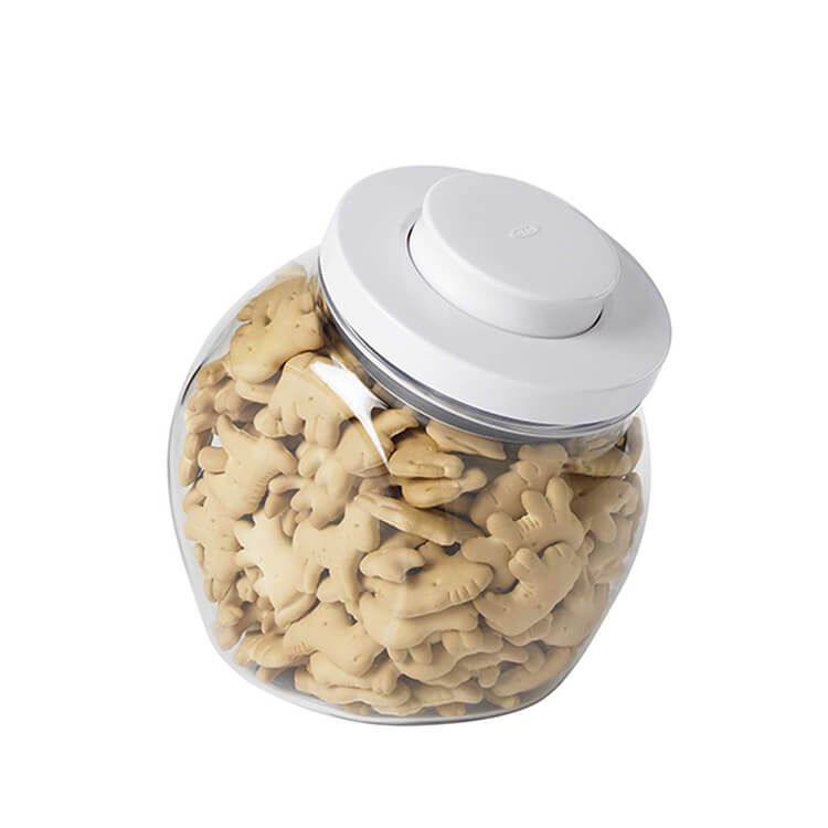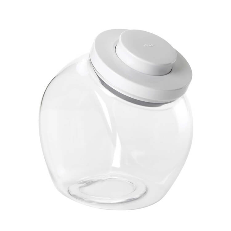 コロンとした形のかわいいジャータイプの保存容器です。片手でボタンを押すだけの簡単開閉でしっかり密閉できます。「より多くの人にとって使いやすいデザイン」を意味するユニバーサルデザイン。男女問わず、お年寄りから子供まで、右利きでも左利きでも簡単に使える製品を作るアメリカのブランドです。ジャータイプの容器にビスケットやスナック、ドライフードを入れて置けばキッチンカウンターも素敵にディスプレイできます。