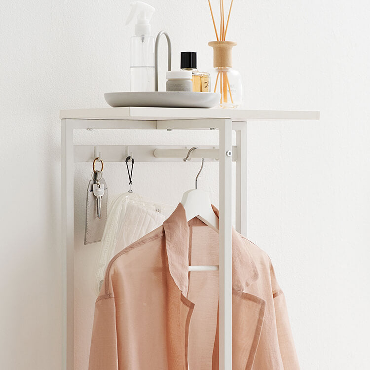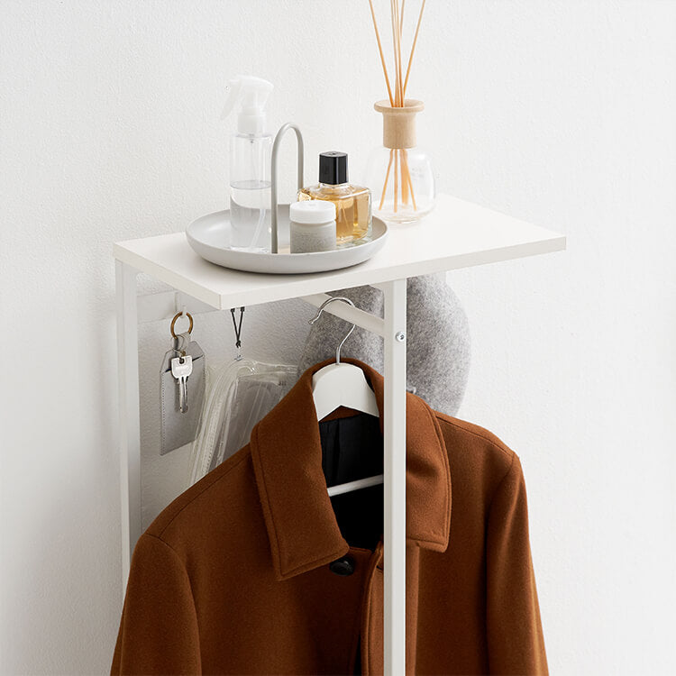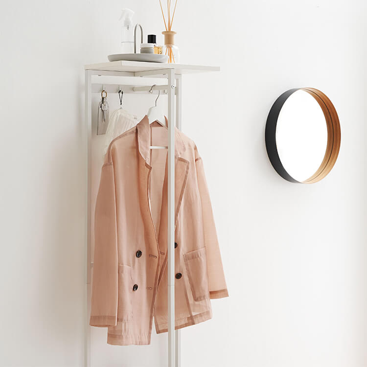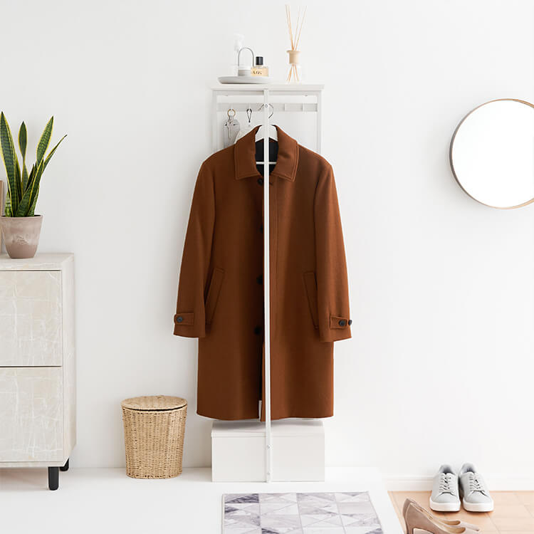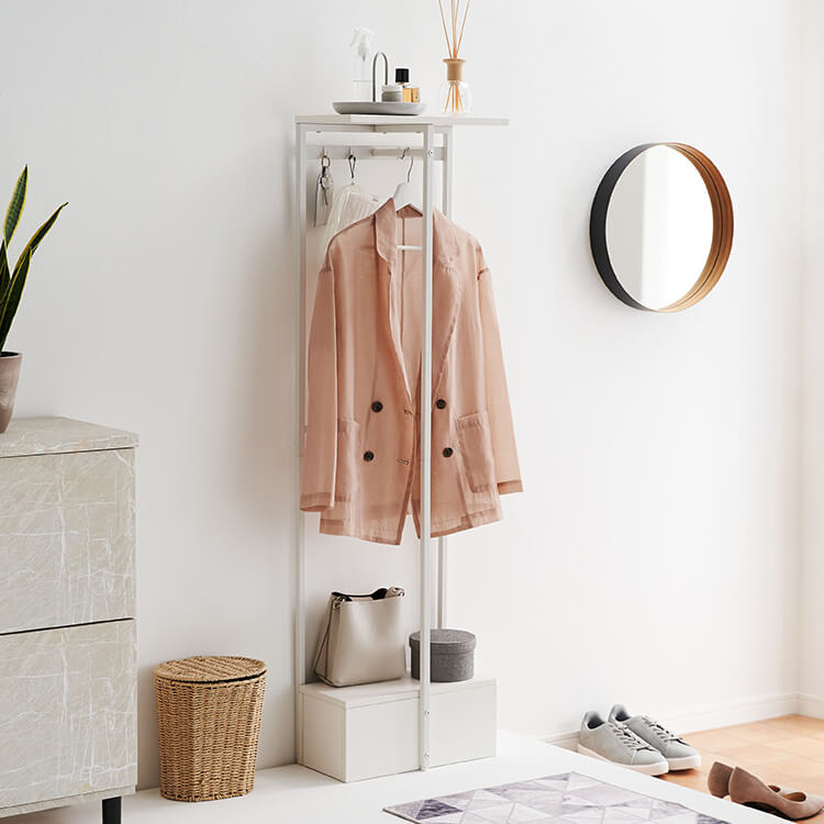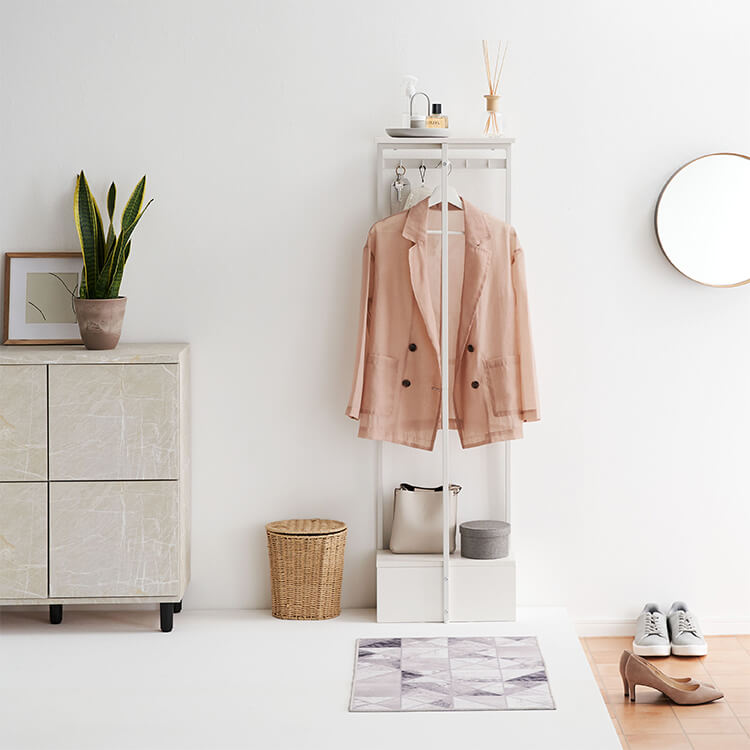 外から帰ってきたらすぐに花粉やウイルス対策をしたい……。そんな時に活躍してくれる、一人暮らしにも取り入れやすいコンパクトサイズのハンガーラックです。ハイタイプでもお部屋に圧迫感を与えにくい、抜け感のあるスチールフレームを採用。スリムかつコンパクトなサイズ感で場所を取らずに置くことができます。オールホワイトで清潔感があり、どんなお部屋にも合わせやすいシンプルデザインに仕上げました。魅せる収納と隠す収納を活かして、お気に入りの空間づくりを。充実した収納スペースで、ごちゃつきやすい玄関回りもすっきり片付きます。
