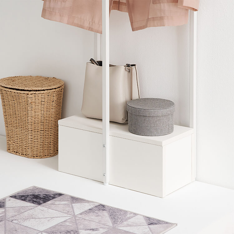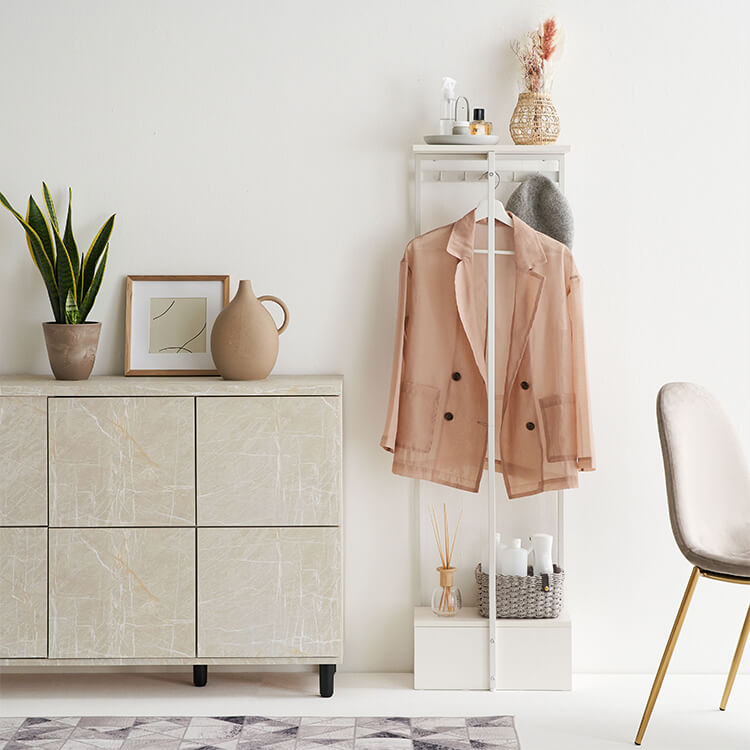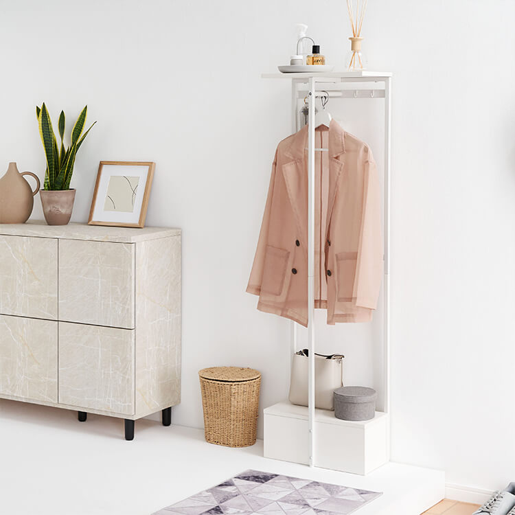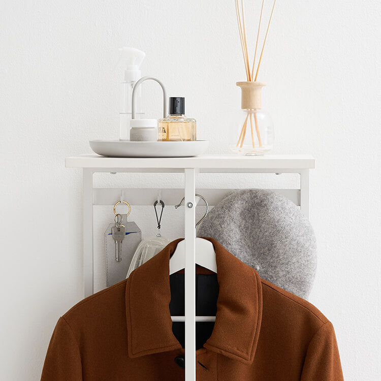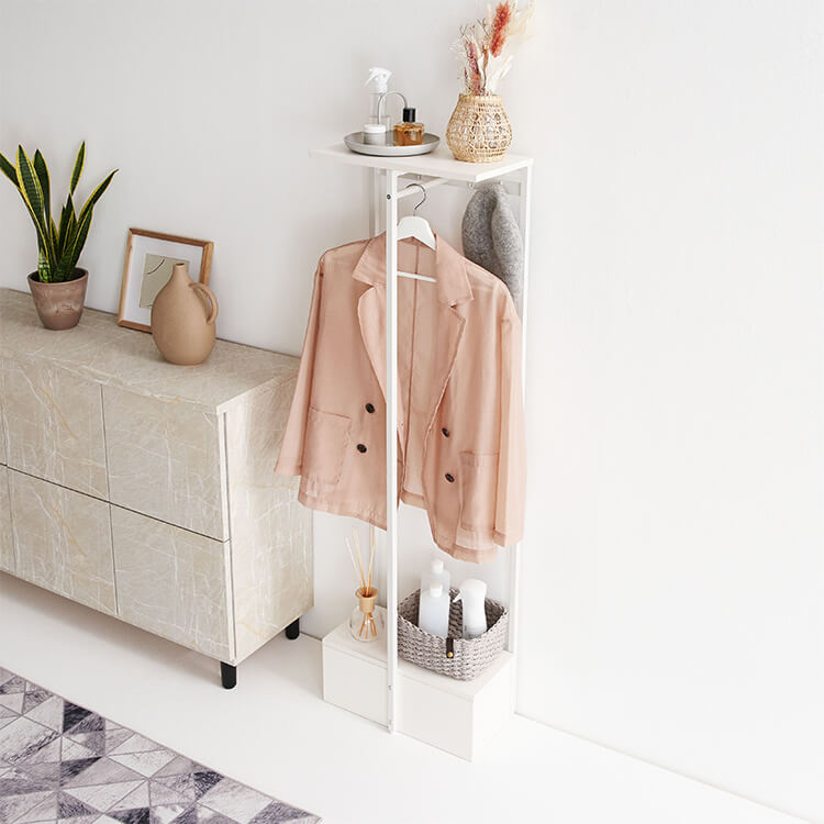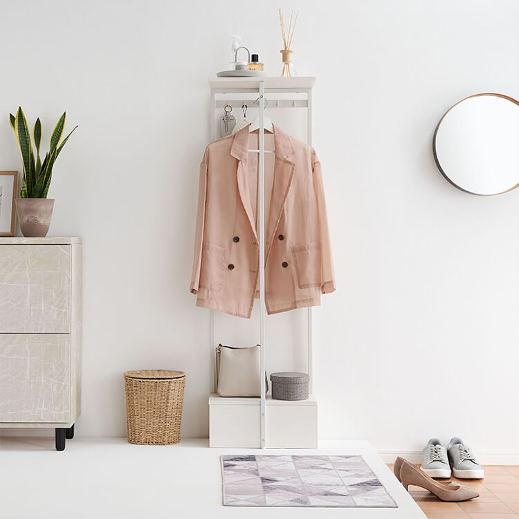 外から帰ってきたらすぐに花粉やウイルス対策をしたい……。そんな時に活躍してくれる、一人暮らしにも取り入れやすいコンパクトサイズのハンガーラックです。ハイタイプでもお部屋に圧迫感を与えにくい、抜け感のあるスチールフレームを採用。スリムかつコンパクトなサイズ感で場所を取らずに置くことができます。オールホワイトで清潔感があり、どんなお部屋にも合わせやすいシンプルデザインに仕上げました。魅せる収納と隠す収納を活かして、お気に入りの空間づくりを。充実した収納スペースで、ごちゃつきやすい玄関回りもすっきり片付きます。