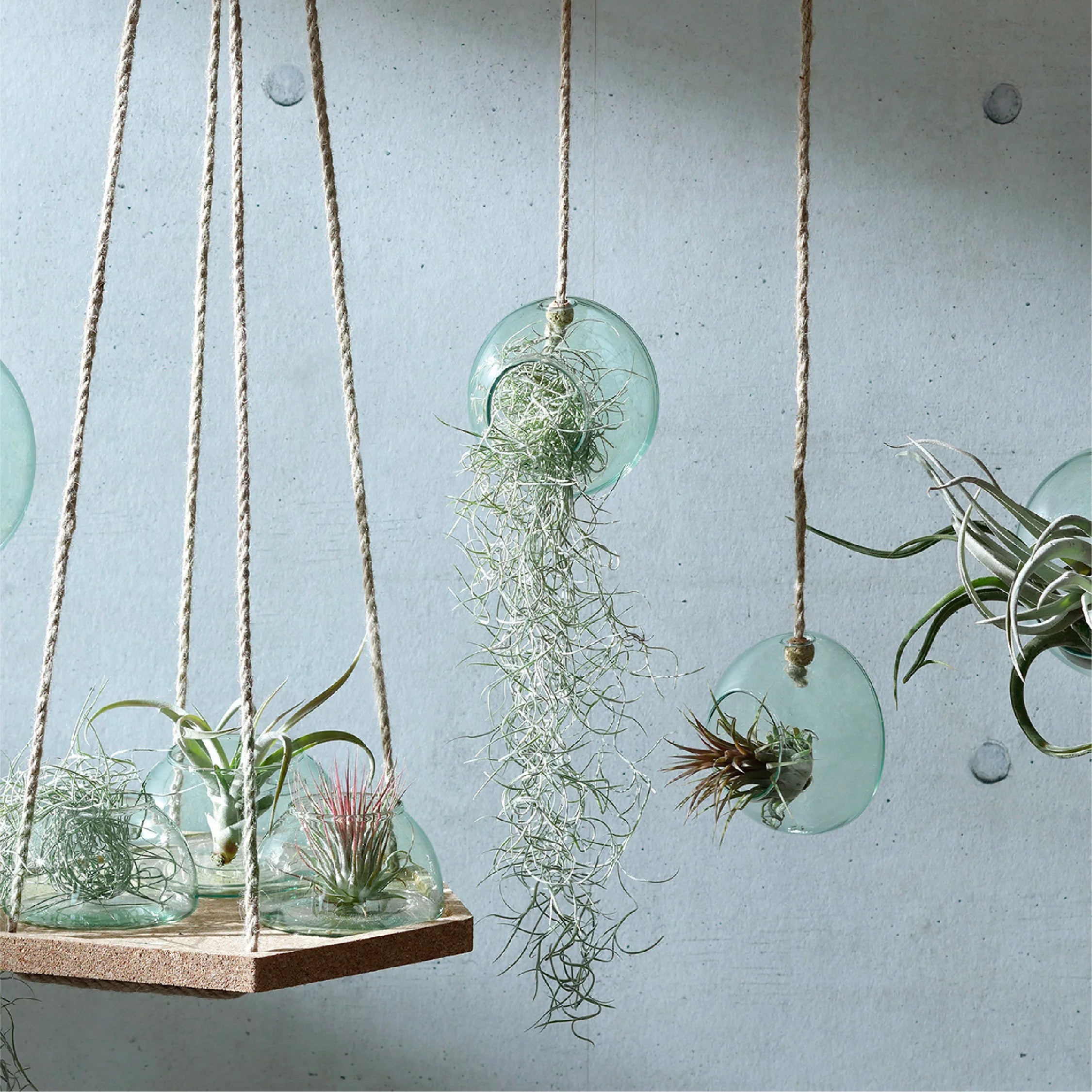 リサイクルガラスを使用したハンドメイドのハンギングミニプランター自然との共生を目指し持続可能的試みを行う英国エデン・プロジェクトとの協力によって誕生しました。エデン・プロジェクトを象徴する、コーンウォール州の巨大植物園に着想を得ています。100%再資源化可能なリサイクルガラスを使用しているサステナブルな吊り下げタイプのドーム型ミニプランターで、2021年にグリーン・グッド・デザイン賞を受賞しています。地域で回収した透明ガラス瓶を仕分け、粉砕して溶解します。熟練のガラス職人が溶けたガラス種を巻き取って形を整え、表面に大まかな表情を与えてから木型に押し当て、息を吹き込みながら成形していきます。繊細な薄グリーンの色合いで、ガラスに気泡が細かく入っているのは100%リサイクル資源を使用してハンドメイドしたことの証です。また、パッケージも、オーガニックインクで印刷した、再資源化可能なリサイクル素材を使用し、環境に配慮している商品です。エアプランツ用にデザインしました。