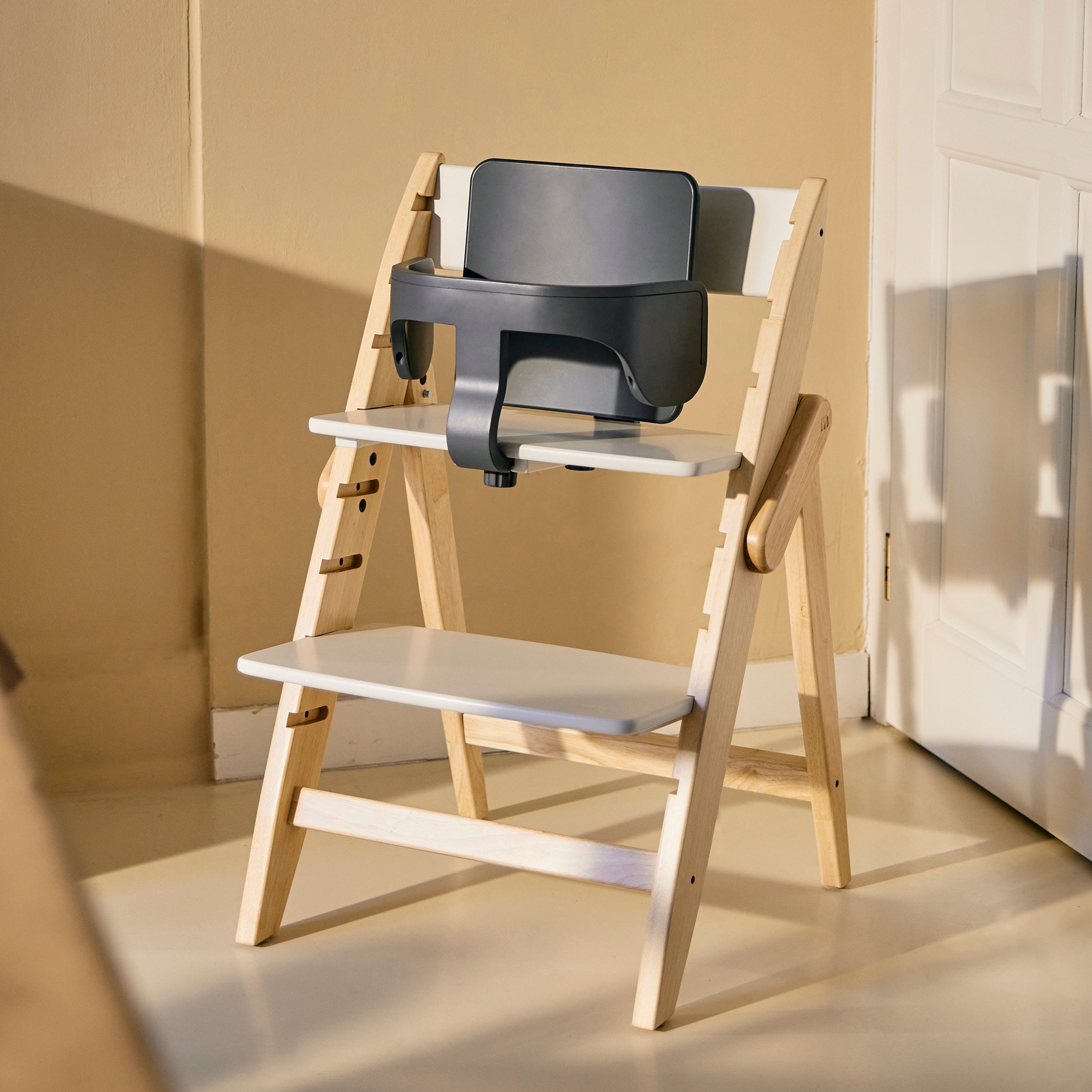 腰がすわる生後6か月頃から3歳までのご使用に必要なアイテムが2点セットになった、スターター・セット。 バックレストとバンパーバーで、小さなお子さまが安全に、そして正しい姿勢でイッピーにすわることができるようサポートします。バックレストの位置はお子さまの成長に応じて微調整も。 シートへの固定も付属のパーツで取り付けるだけの簡単設計で、着脱に時間はかからずお手入れもラクなプラスチック製です。また、スターター・セットを取り付けた状態のまま、座面シートの高さ変更や折りたたみ・自立も可能です。