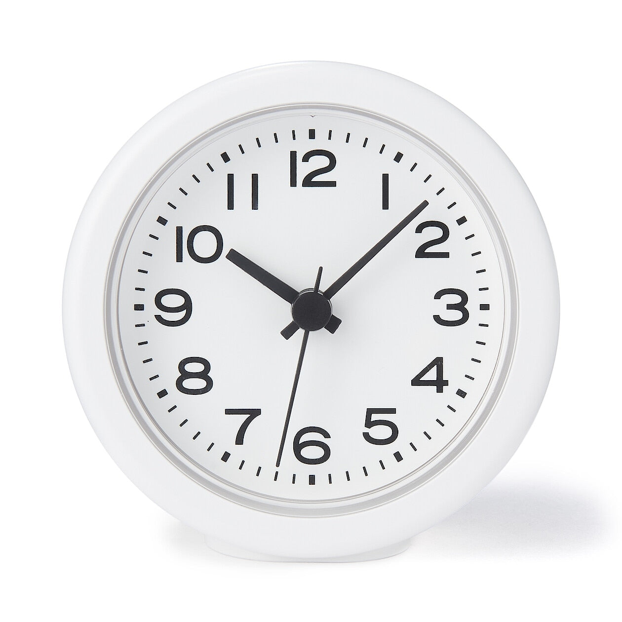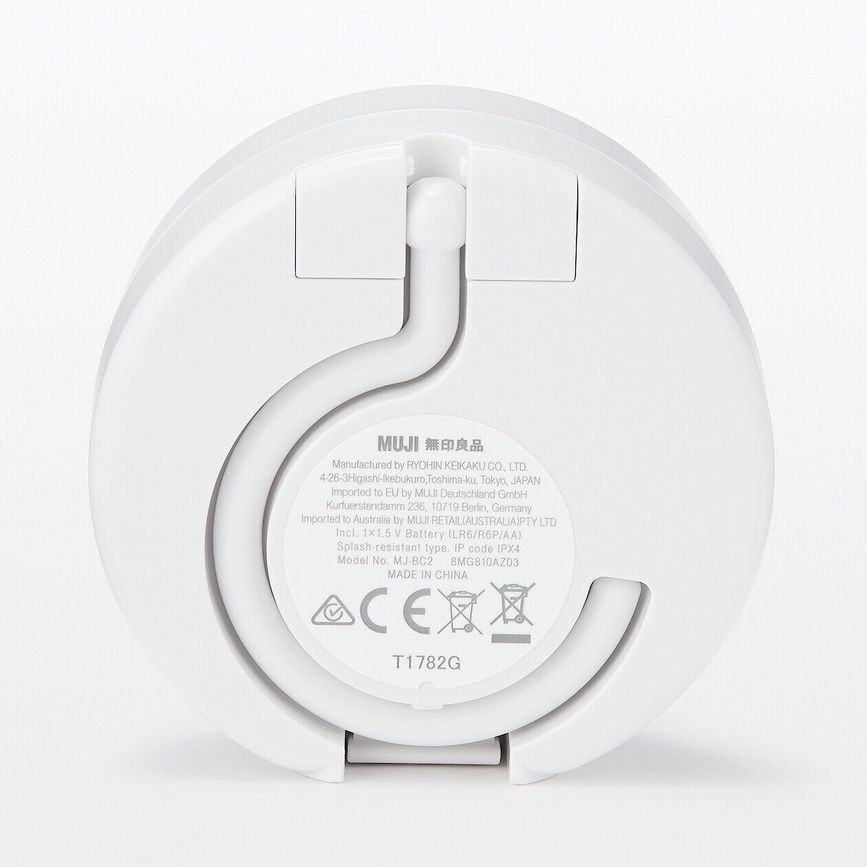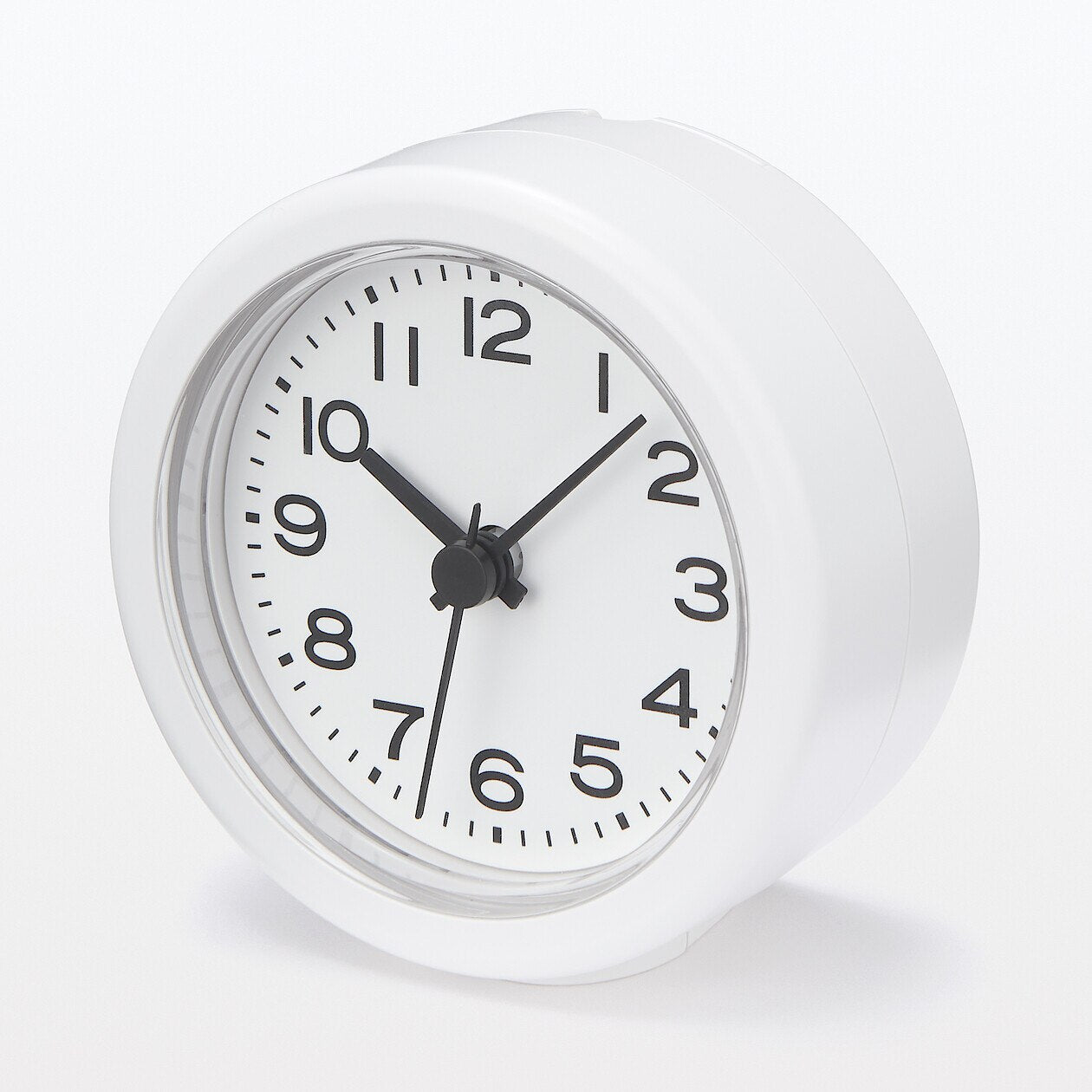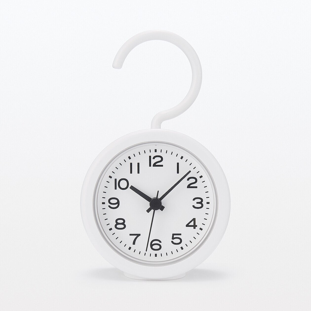 浴室のドアノブやハンガーに掛けられる防沫型クロックです。自立もするので置いて使用することもできます。裏面に吊り下げ用のフック付き。