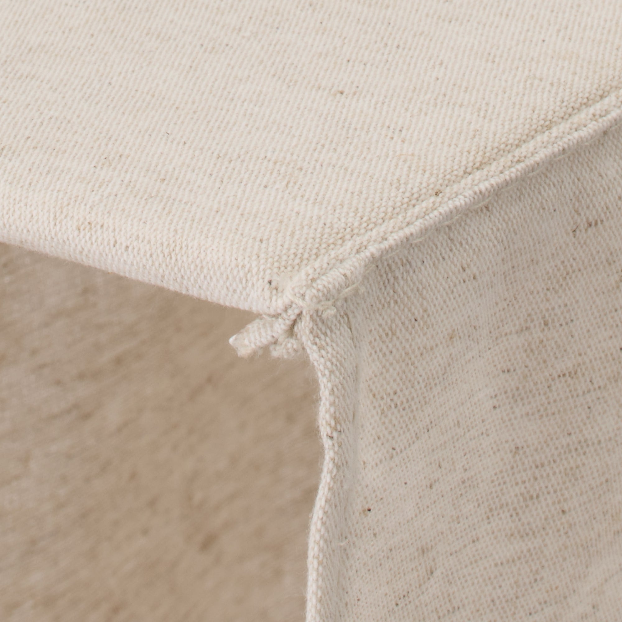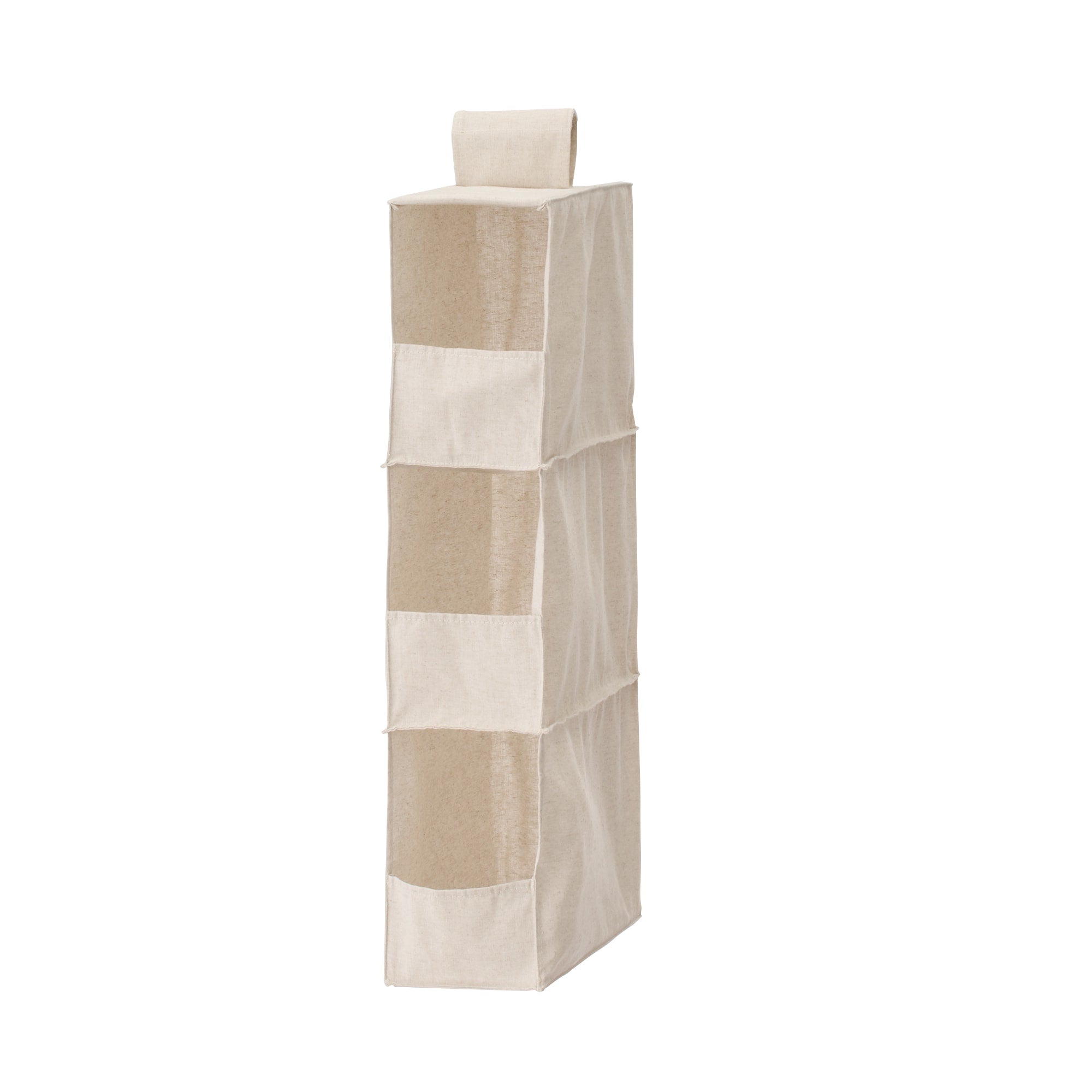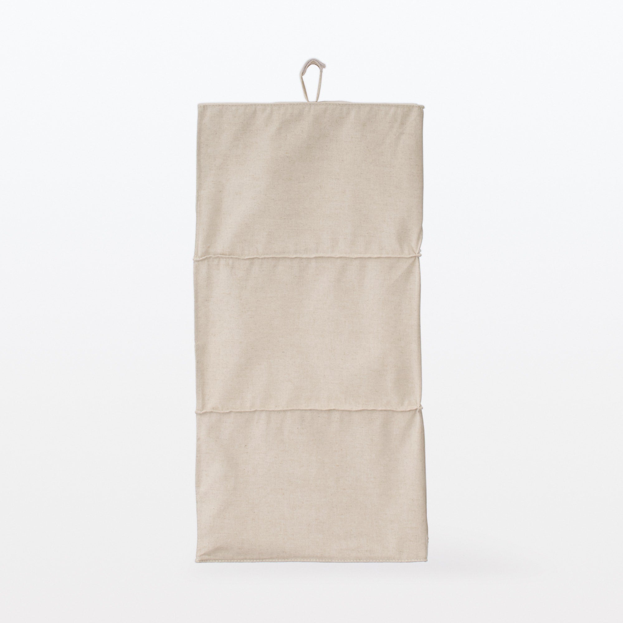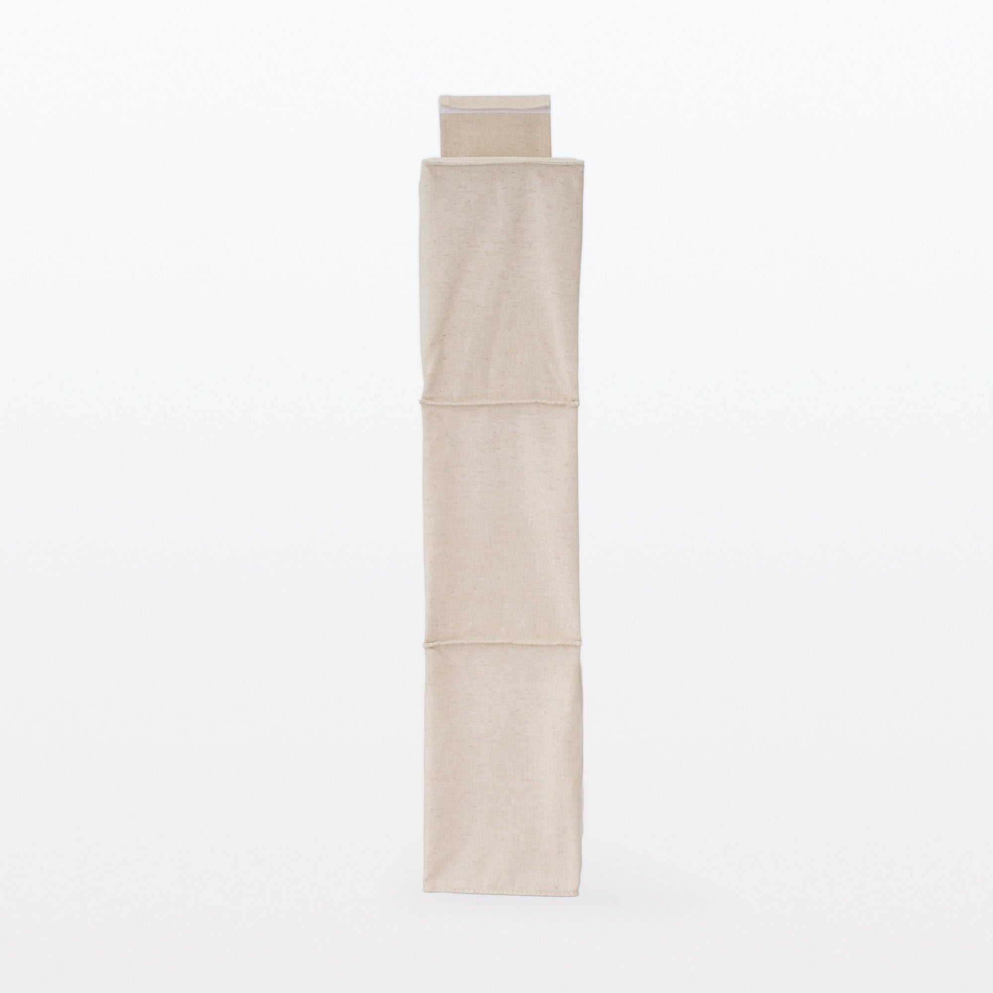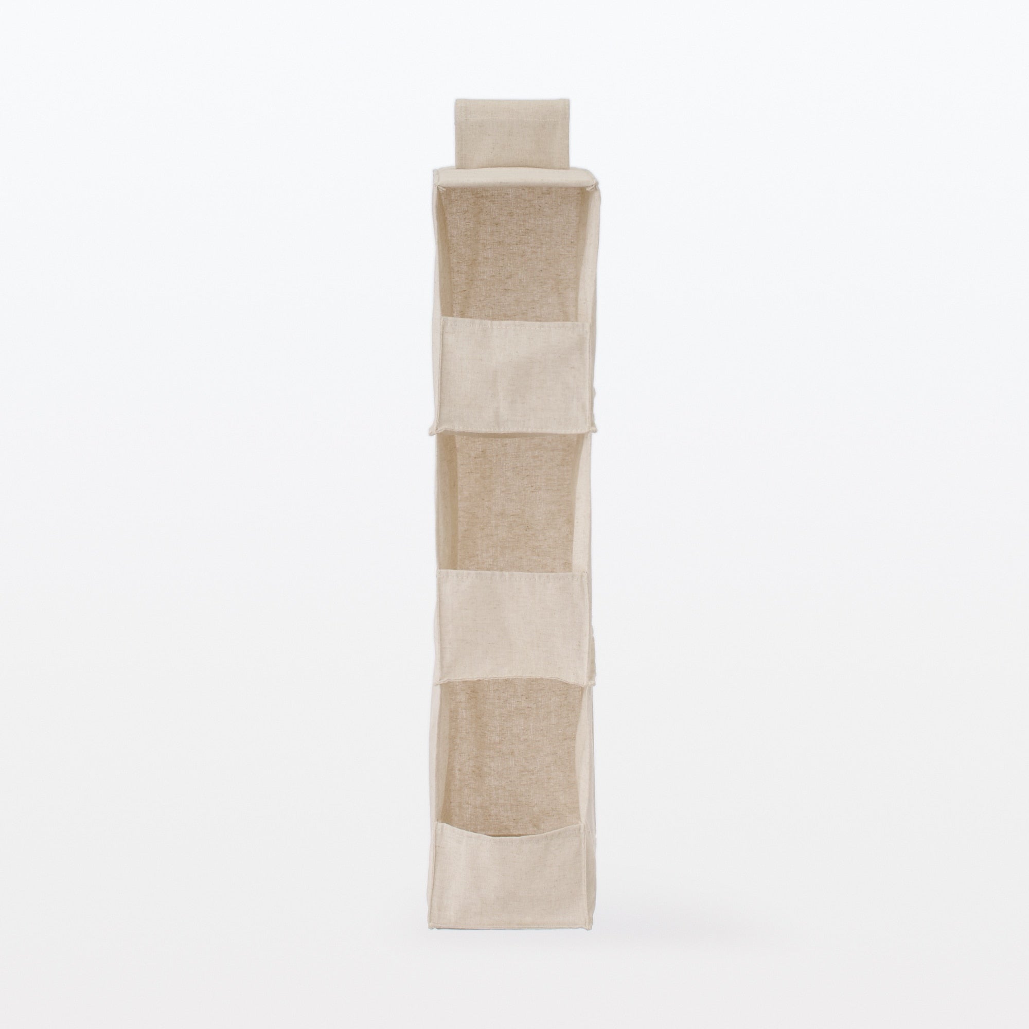 麻の風合いとポリエステルの丈夫さを生かしました。靴下やハンカチなどの小物をきれいに収納できるように棚を箱型にしました。1段あたり約1.3kgが使用目安です。
