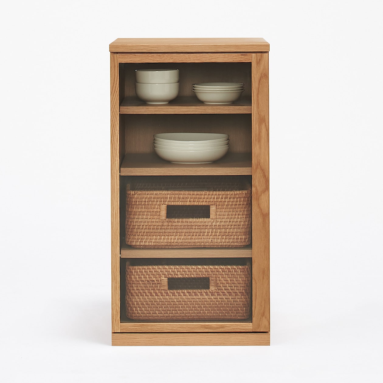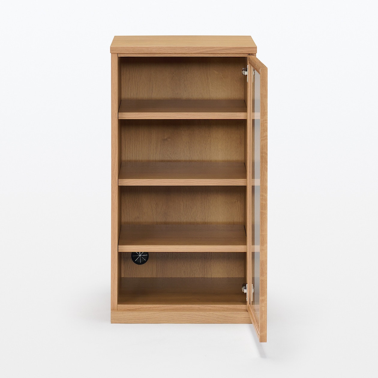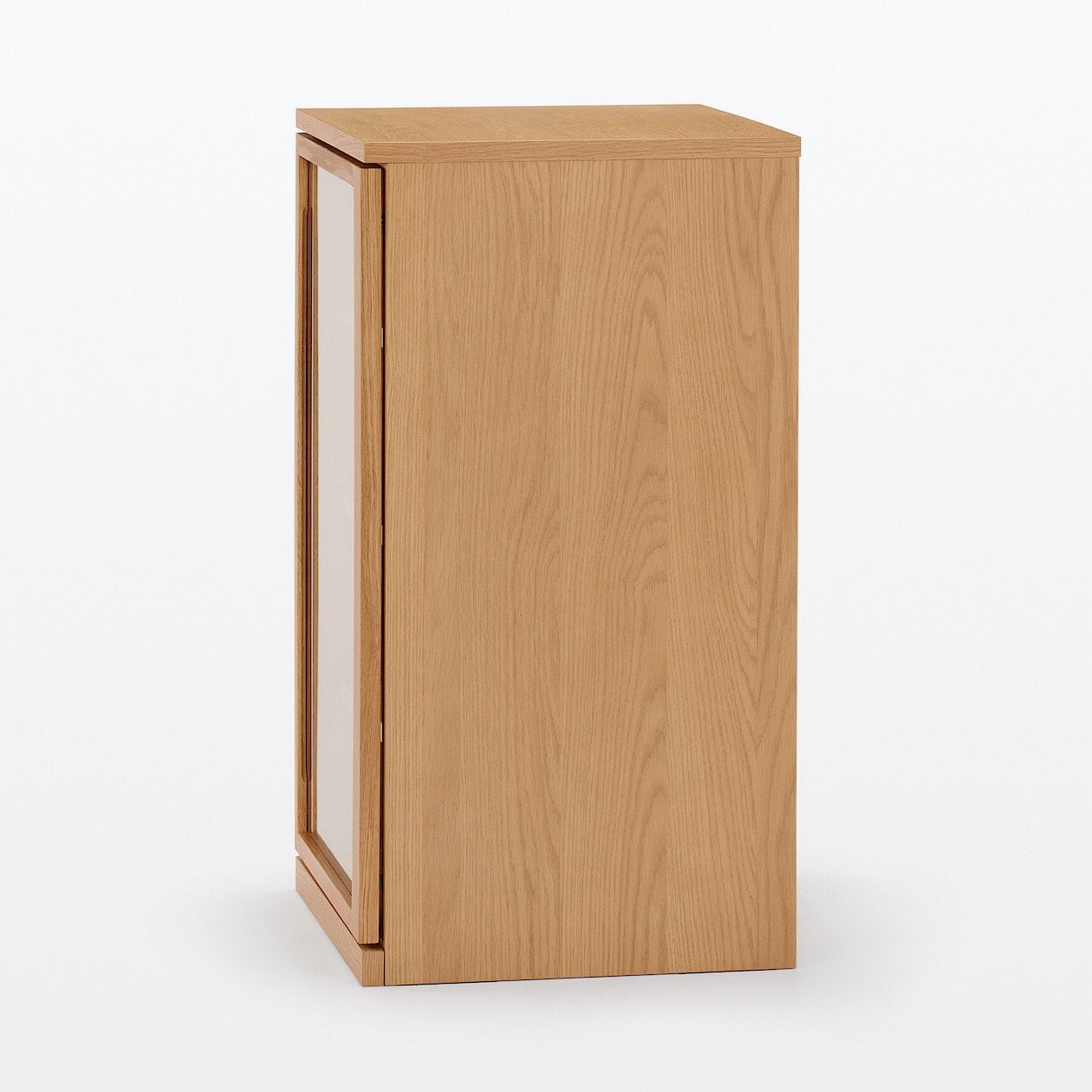 ベーシックなデザインの木製収納です。扉付なので、ほこりを気にせず収納できます。扉内には収納用品がぴったりと収まります。扉は、左右どちらにも取付られます。台輪式で、商品下にほこりがたまらず掃除が楽です。