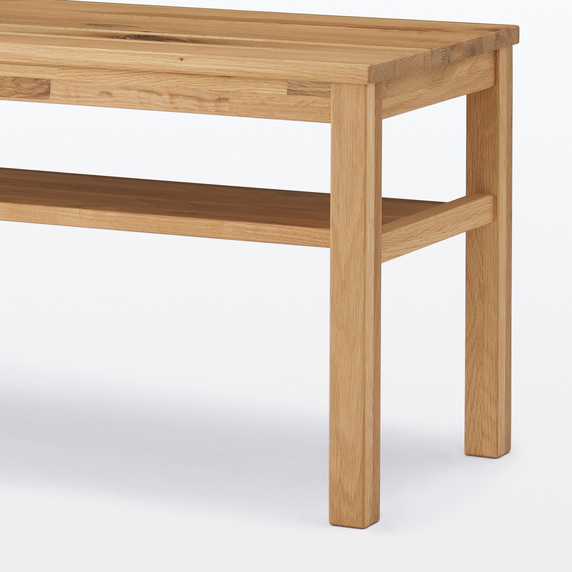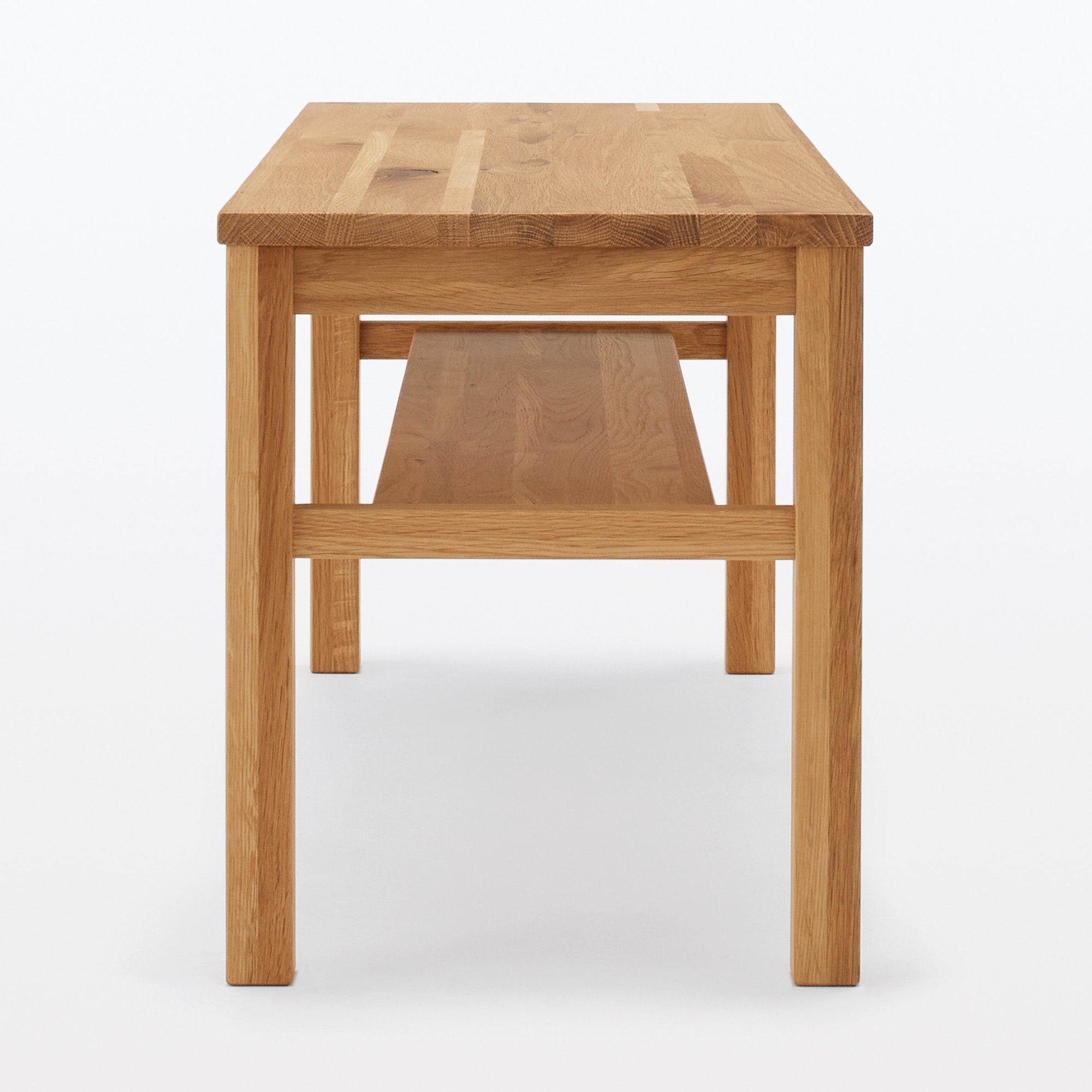 節や木目が目立つ部分も無駄なく使って収納棚付きのベンチを作りました。自然素材である「木」は、同じ種類の木であっても、人間と同じようにそれぞれ異なる特徴を持っています。節や木目は、木特有の表情であり、木が成長、修復を繰り返してきた証でもあります。本商品はそのような木の表情を無駄なく使用しており、一点として同じ商品はありません。