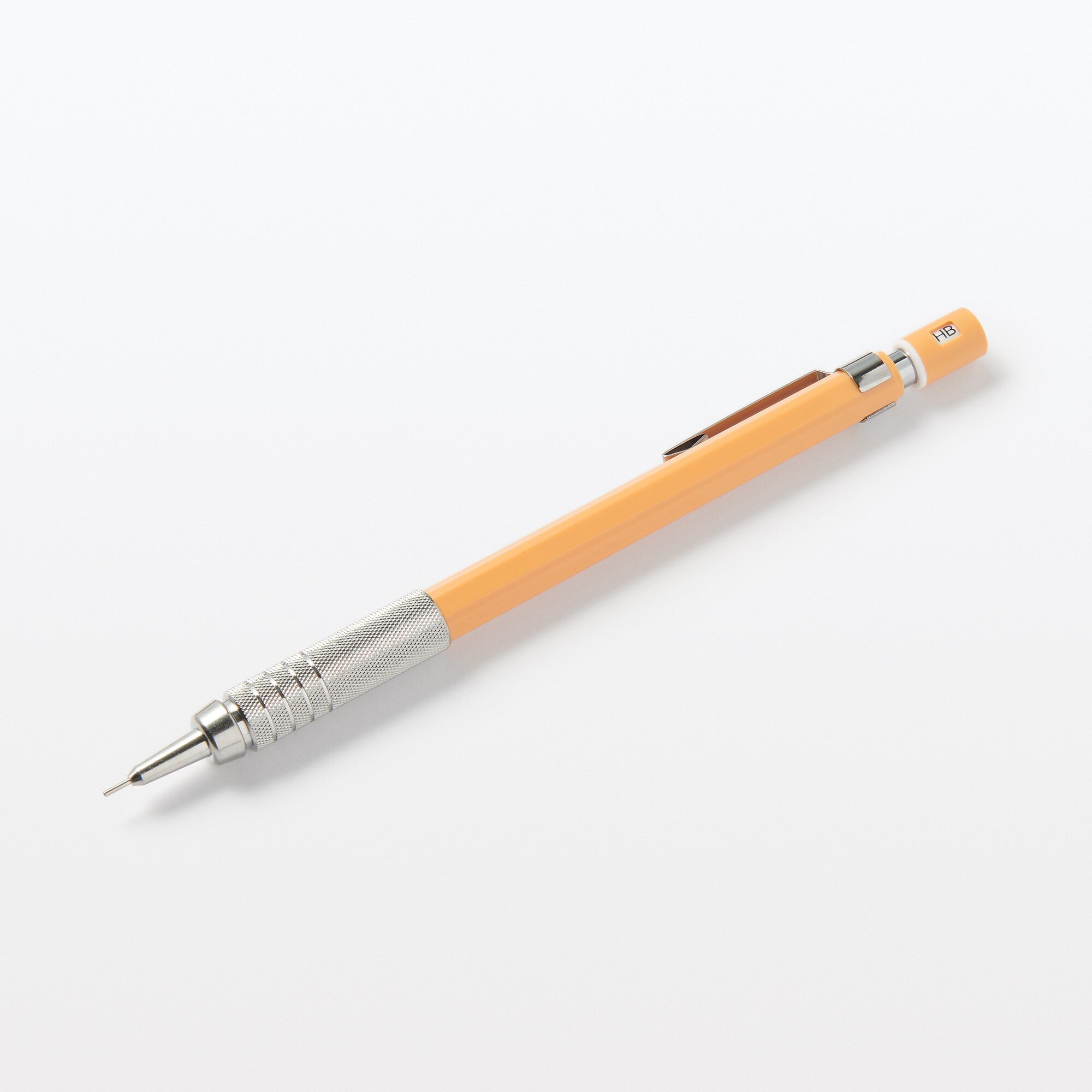 安定した筆記ができる、低重心設計のシャープペンです。グリップにはすべりを防ぐ加工をしています。芯の硬度(HB,B,3H,2H,H,F)が使い分けできる表示窓が付いています。