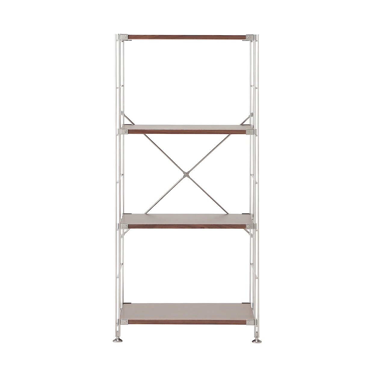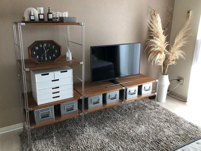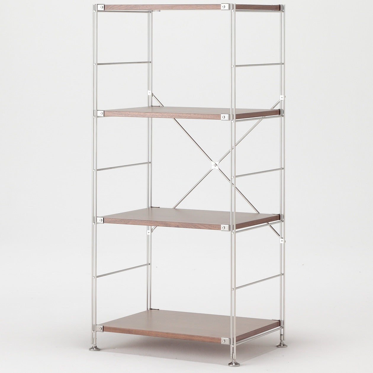 ステンレスとウォールナット材を組み合わせたオープンシェルフです。ユニット式なので、くらしの変化や好みに合わせて、帆立、棚、ワードローブバーなどオプションパーツの組み換えができます。