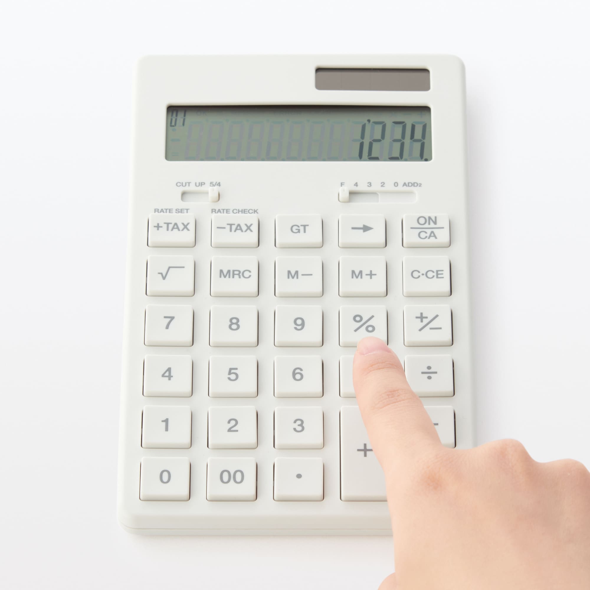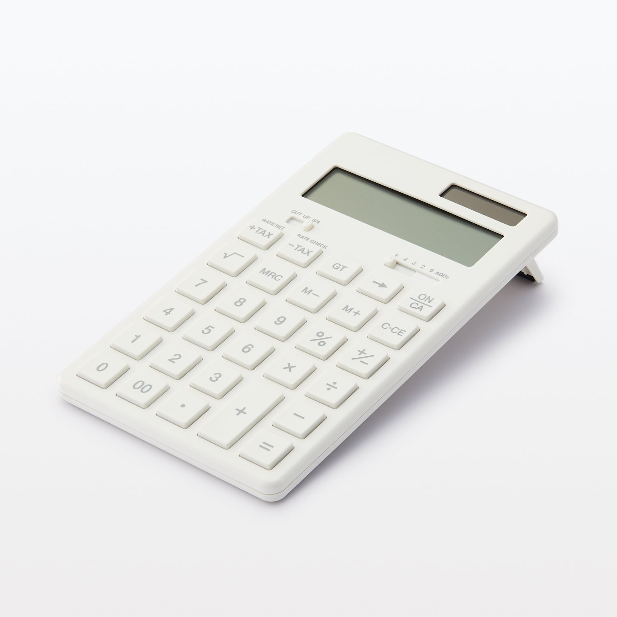 機能もデザインもシンプルにこだわりました。ABS素材を使用した12桁表示の電卓です。ボタン電池と太陽電池のツインパワーなので、明るい場所では太陽電池で稼働します。高さを変えられるスタンド付き。