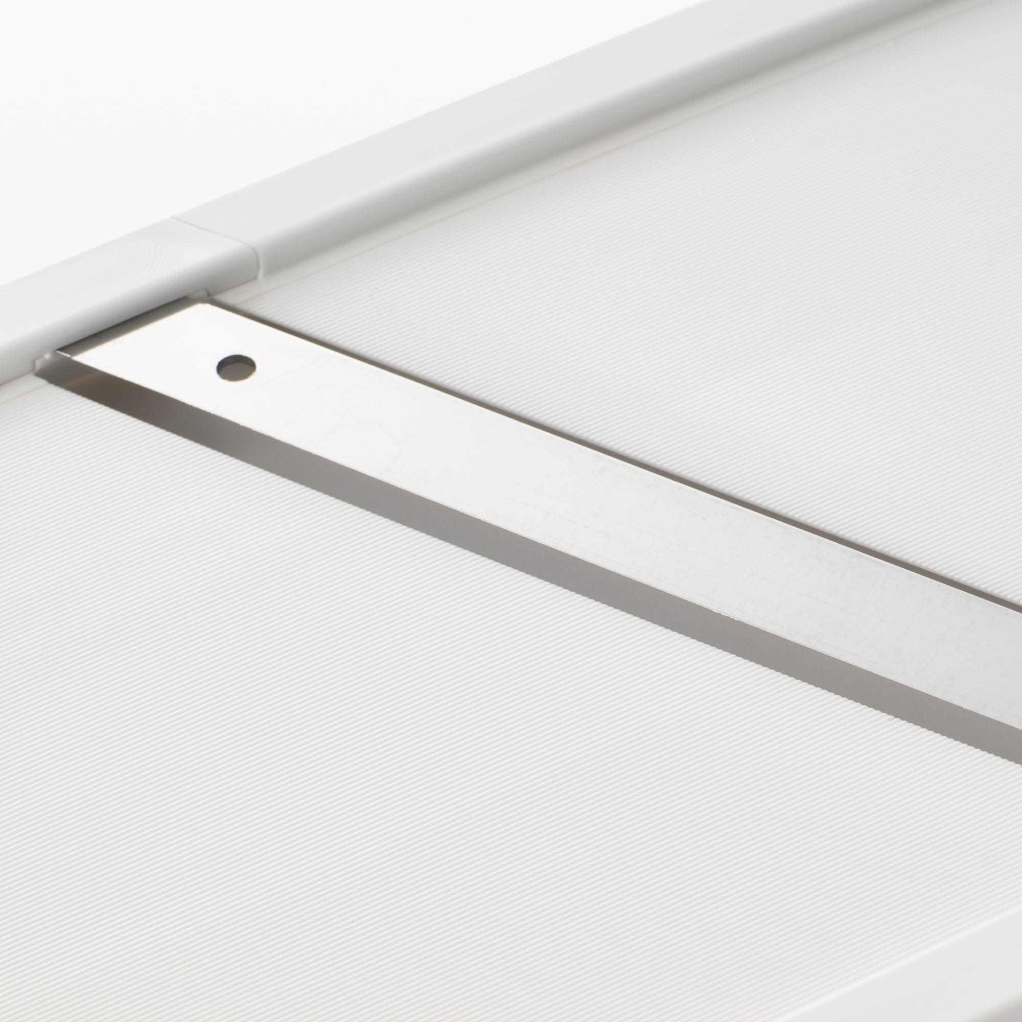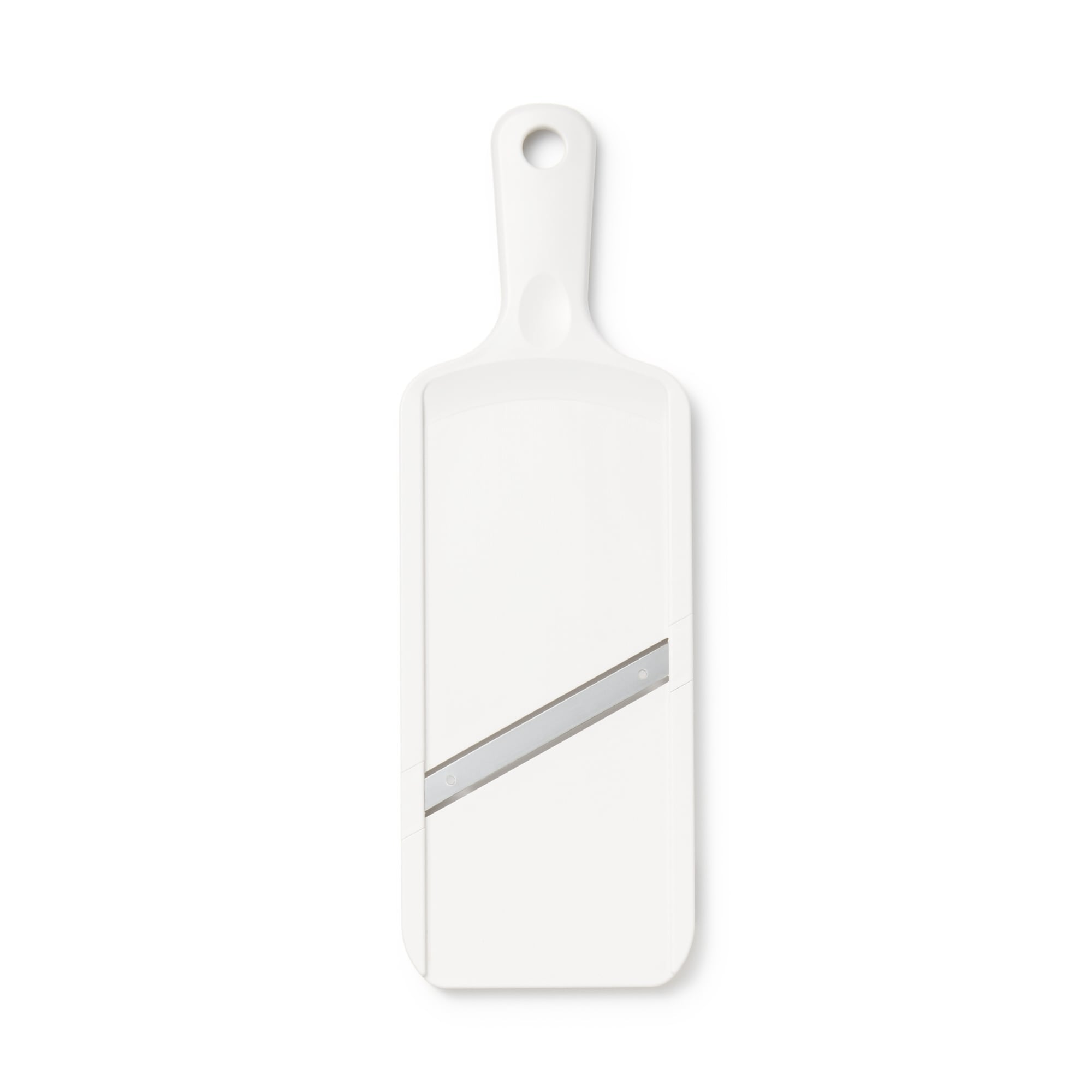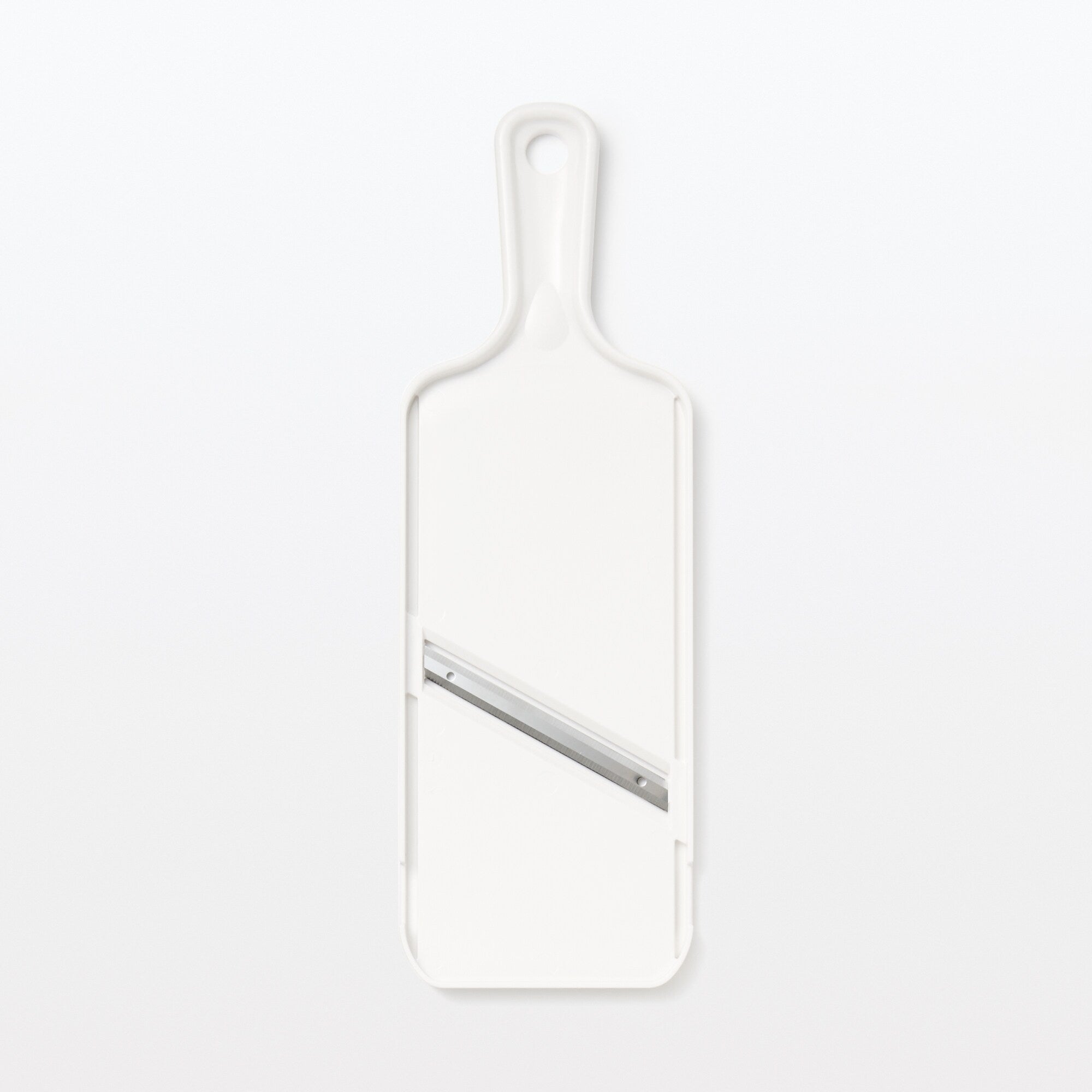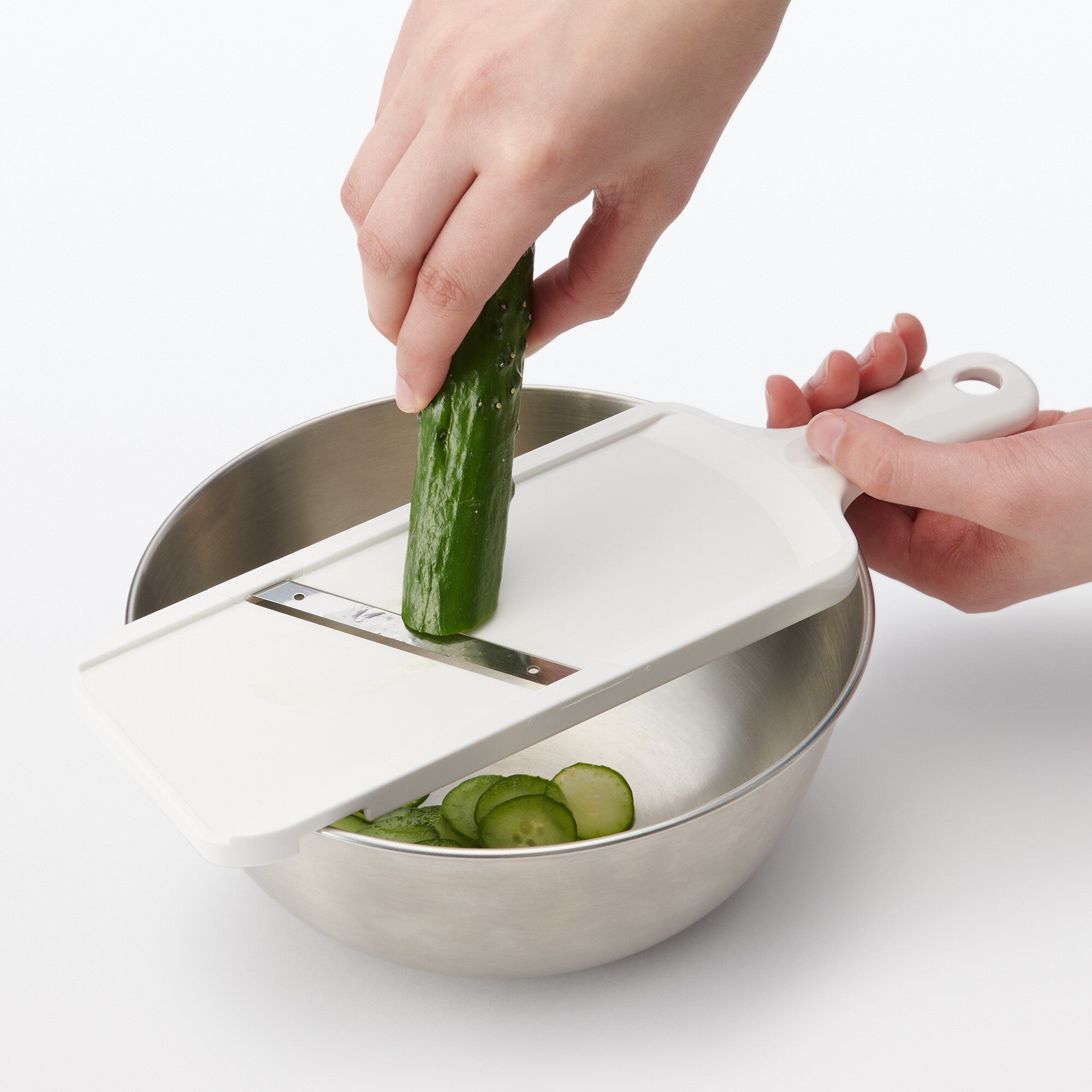 押しても引いてもカットできるよう両刃に仕立てたので、楽に素早くスライスできます。お手持ちのボールなどに、スライサーの先端の溝を引っかけるとずれにくく使いやすいです。別売りの軽い力でおろせるおろし器の受け皿をセットしてご利用いただけます。