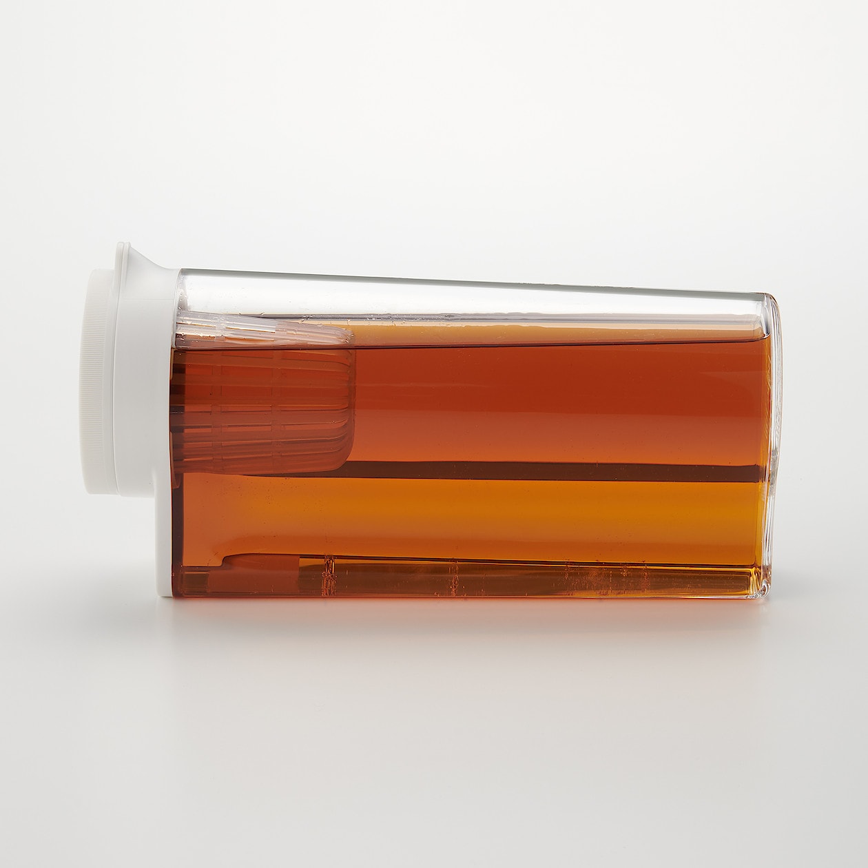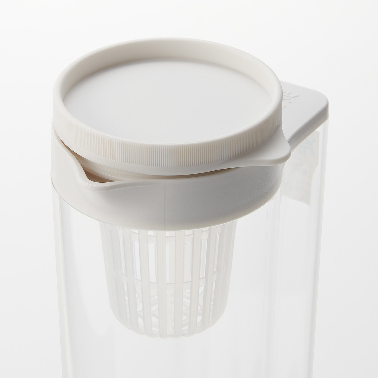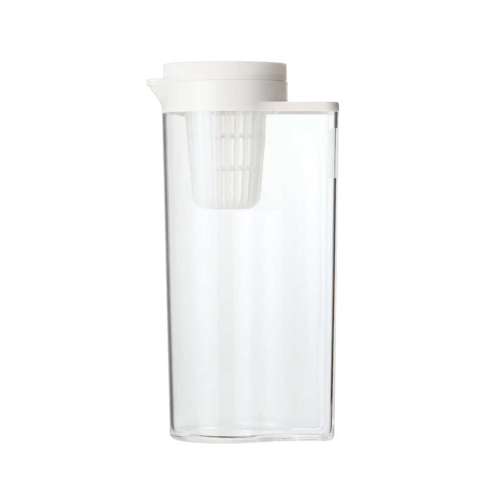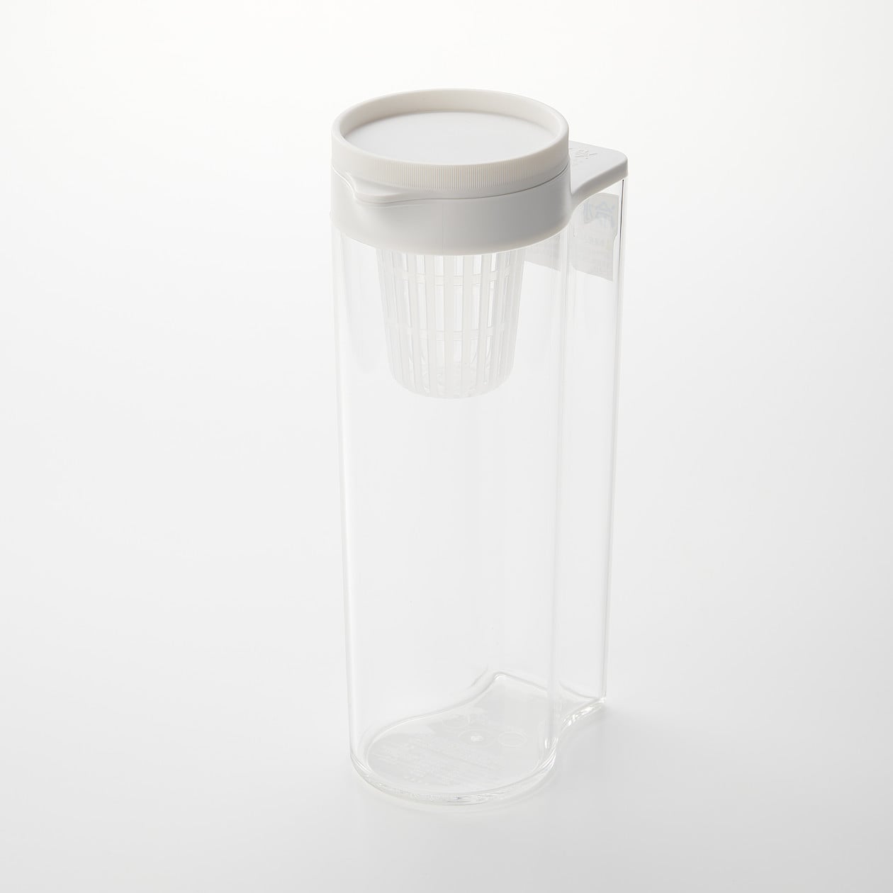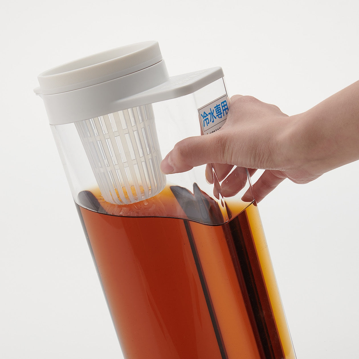 シンプルなデザインで2L入る大容量のジャグです。ねじ式で取外し簡単な水出しお茶パック入れ付です。たて置き・よこ置きができ、口が大きいので中が洗いやすい仕様になっています。