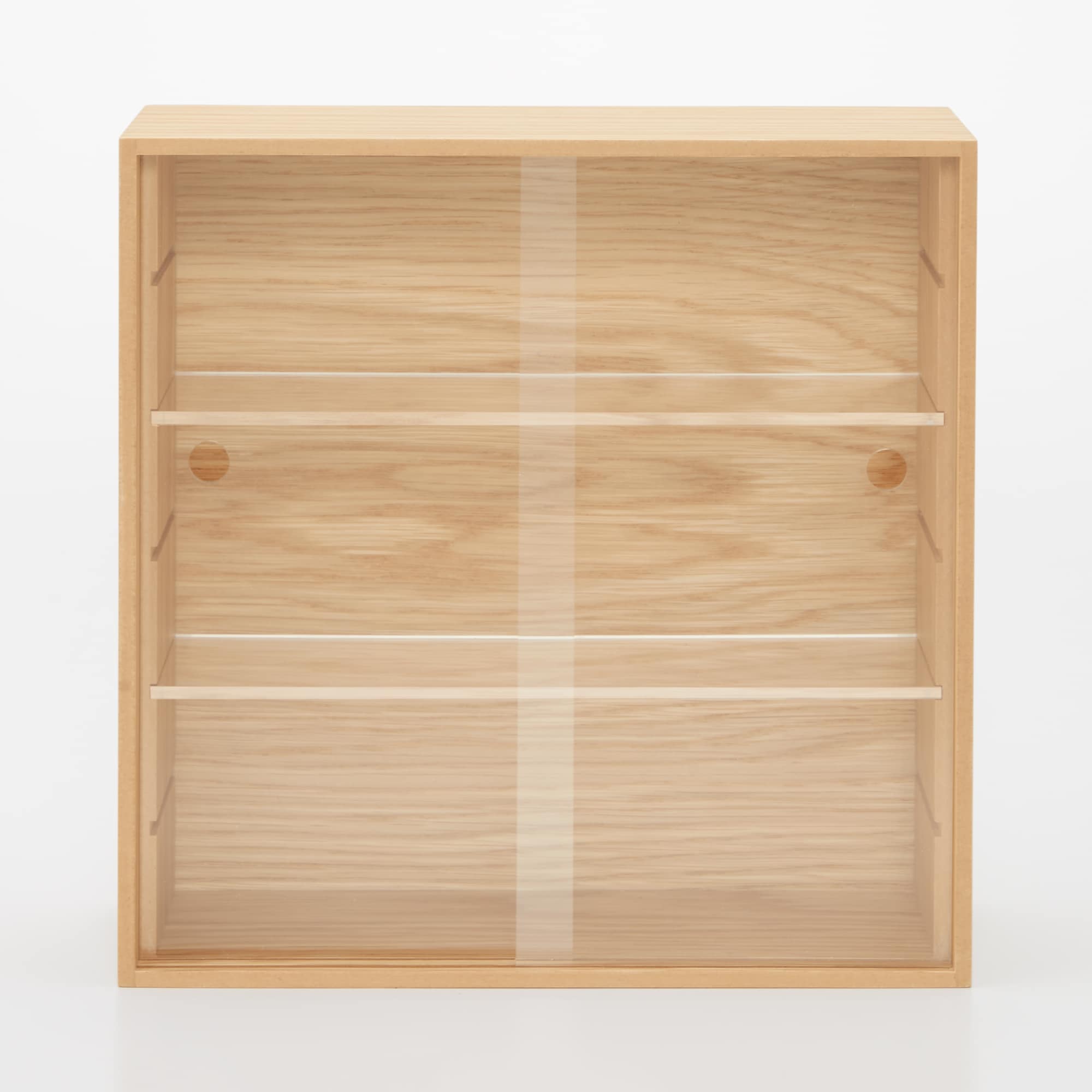 飾りながら収納できるよう、自然な風合いの木製ケースの扉に透明度の高い素材を使いました。2枚付いている仕切り棚は、可動式で高さを調整できます。※仕切り棚は追加できます。別売り:【パーツ】木製コレクションスタンド用アクリル仕切り棚(12013440)