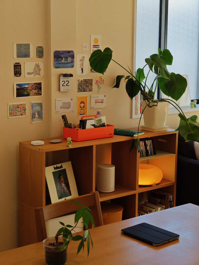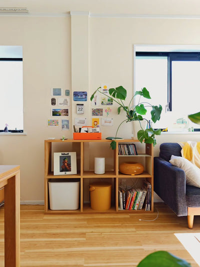 使い勝手に合わせて、縦にも横にも広げられるスタッキングシェルフです。本棚、飾り棚だけでなく、間仕切り棚としても使用できます。暮らしに合わせてパーツの追加や組換えも可能です。