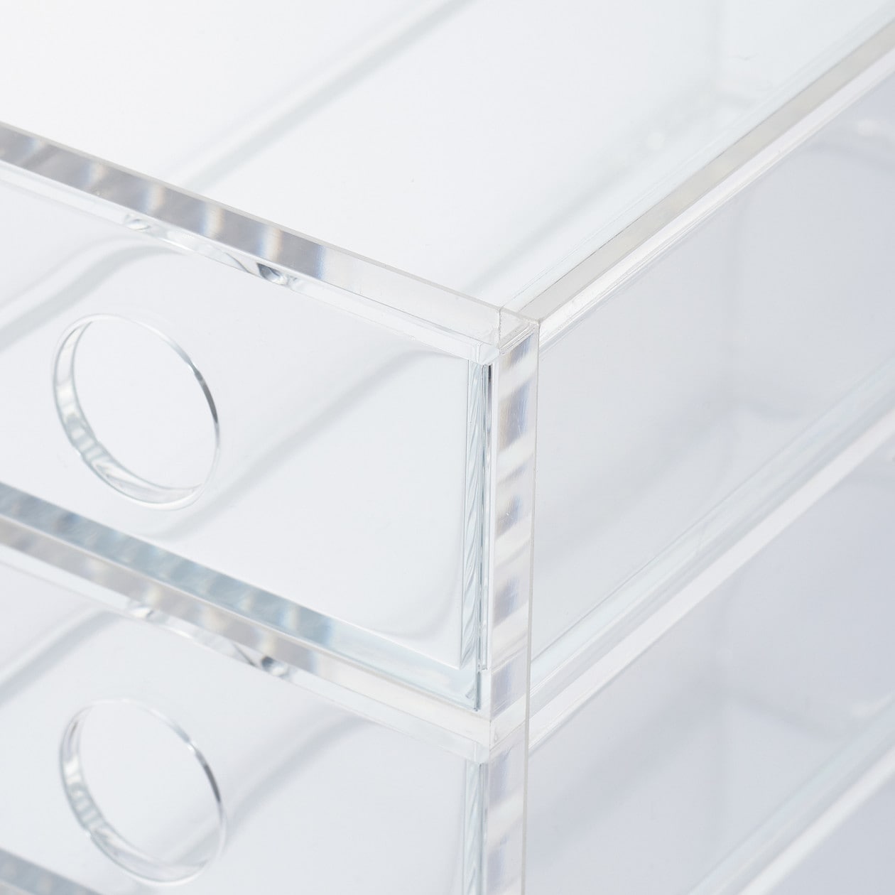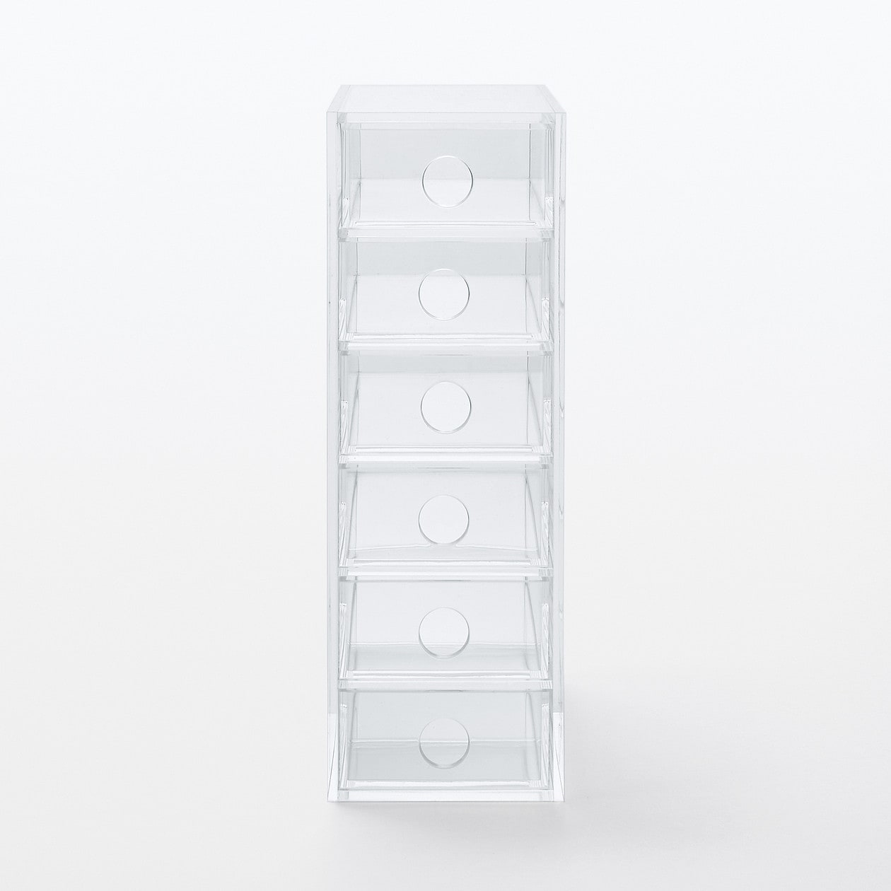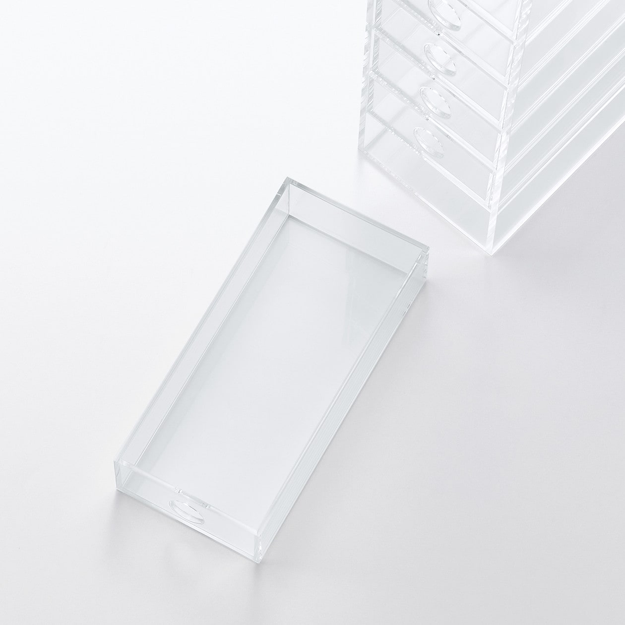 見える収納に便利なアクリル素材です。mDFボックスや収納ボックス3段と並べて置けるよう、高さを同じにしました。