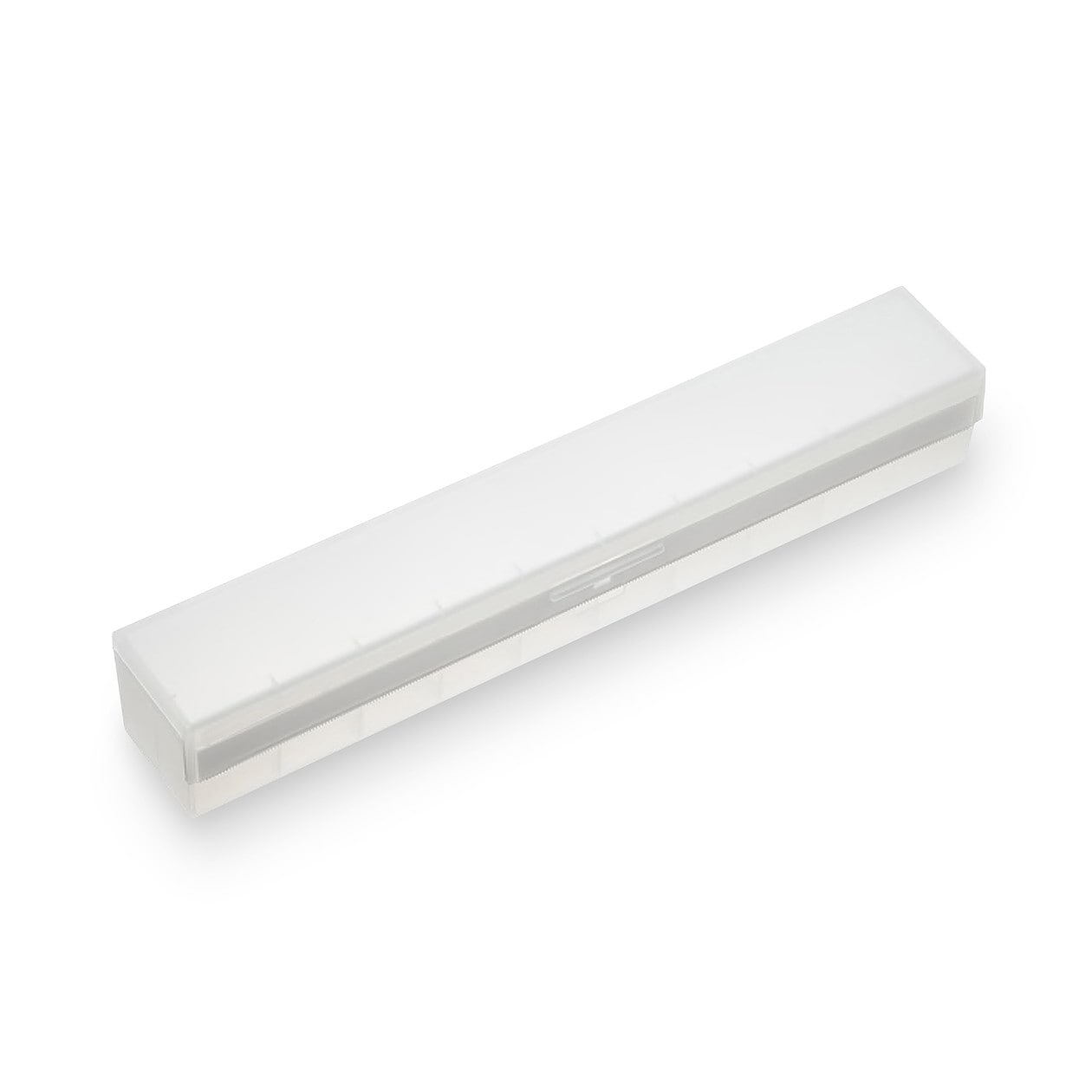軽くて耐久性のあるポリプロピレン素材を無着色のまま使用している食品包装ラップ用のケースです。ラップの巻き戻りや飛び出しを防ぐために、本体下側を高くし滑り止め部分を長くしています。別売りのマグネットを付けると冷蔵庫など磁性のある壁面に貼り付けられます。