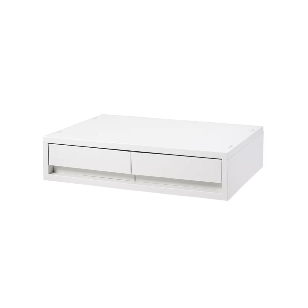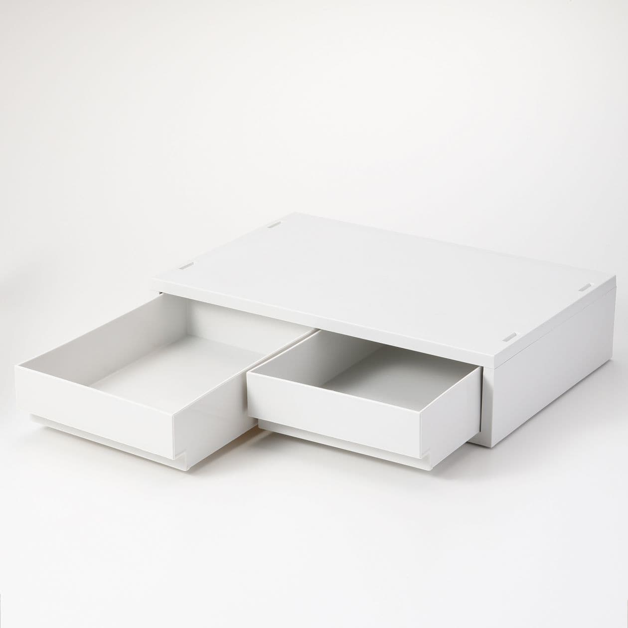 場所や用途に合わせてサイズを選び自由に組み合わせられる収納ケースです。2つの引き出し付きで、書類などを分けて収納することができます。