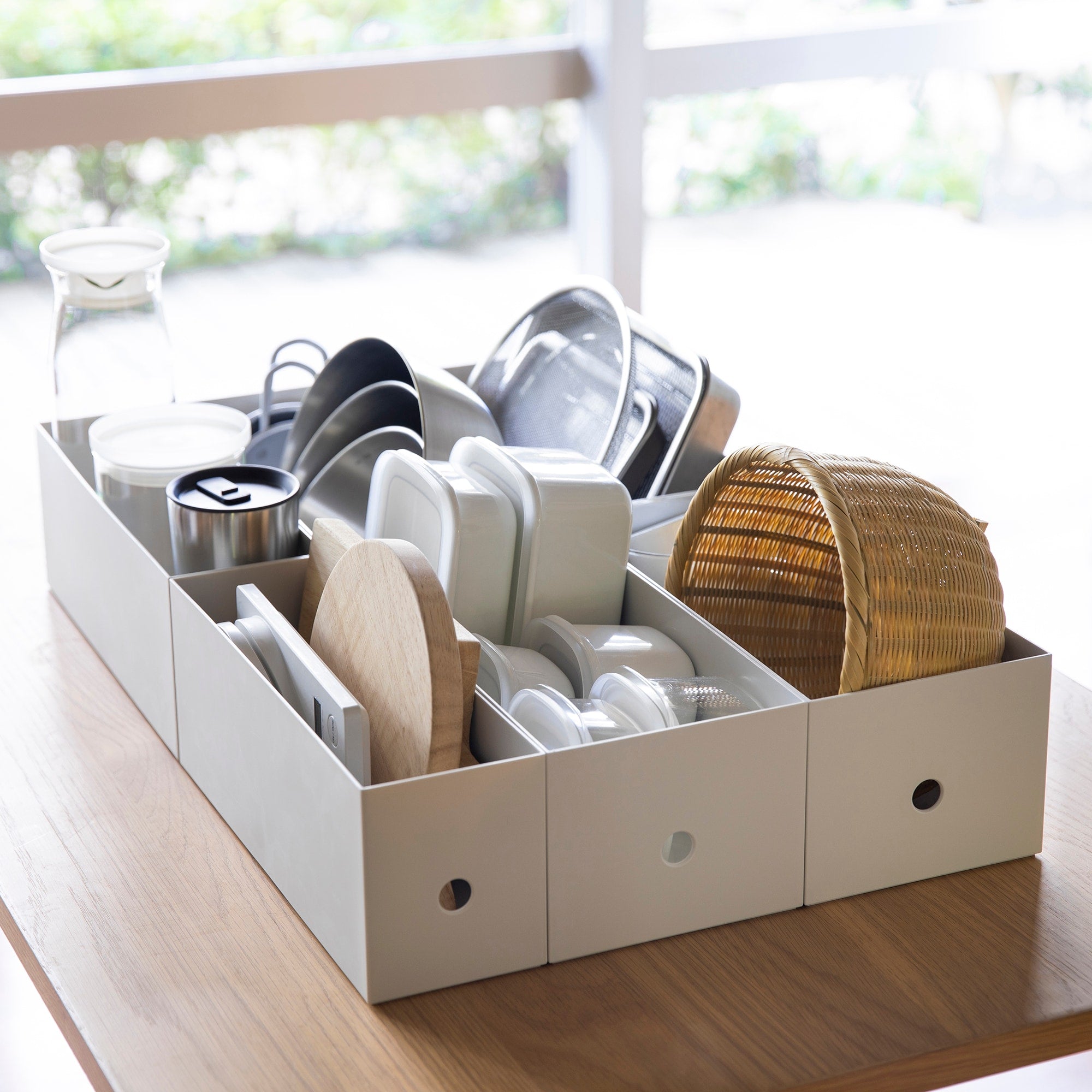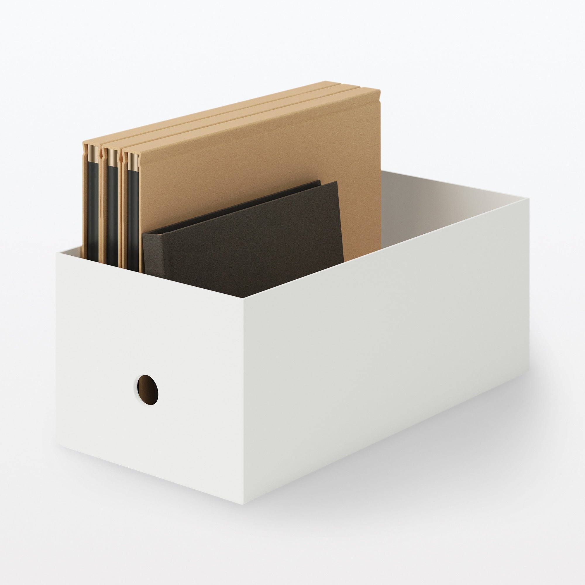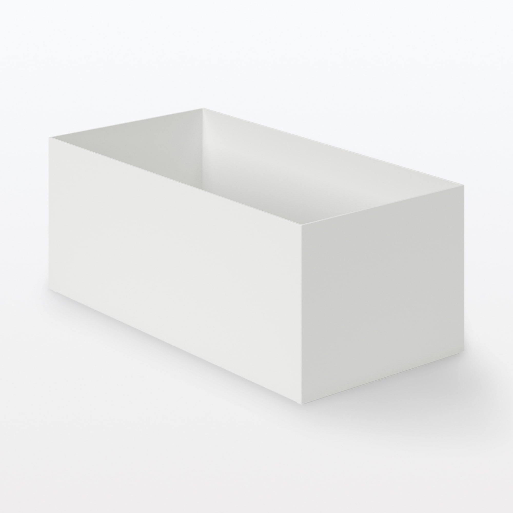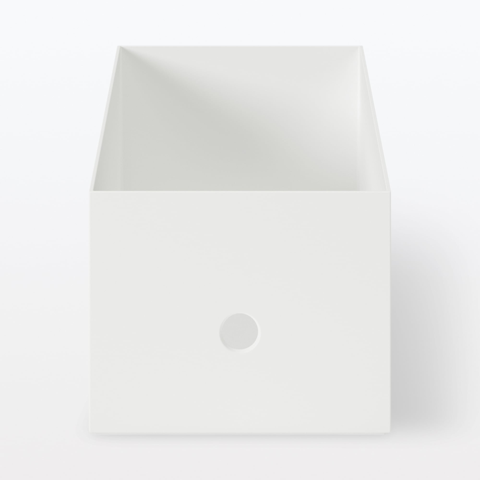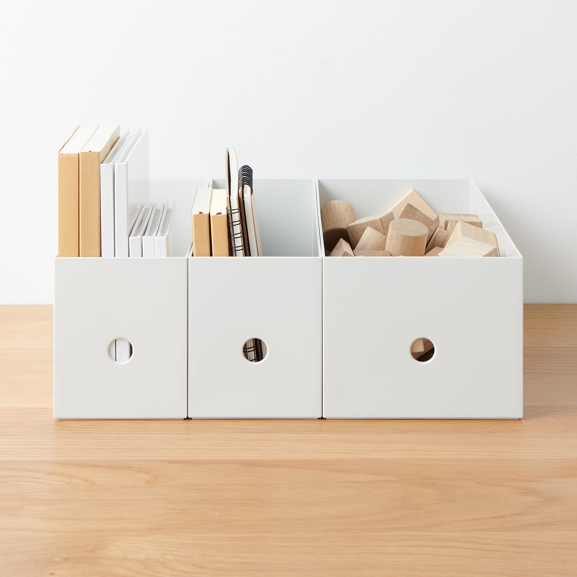 ファイルボックススタンダードワイド幅15cmタイプの高さ1/2サイズです。3段まで積み重ねて使用できます(耐荷重:約5kg)。別売りのフタをつけて、ご使用いただくことも可能です。