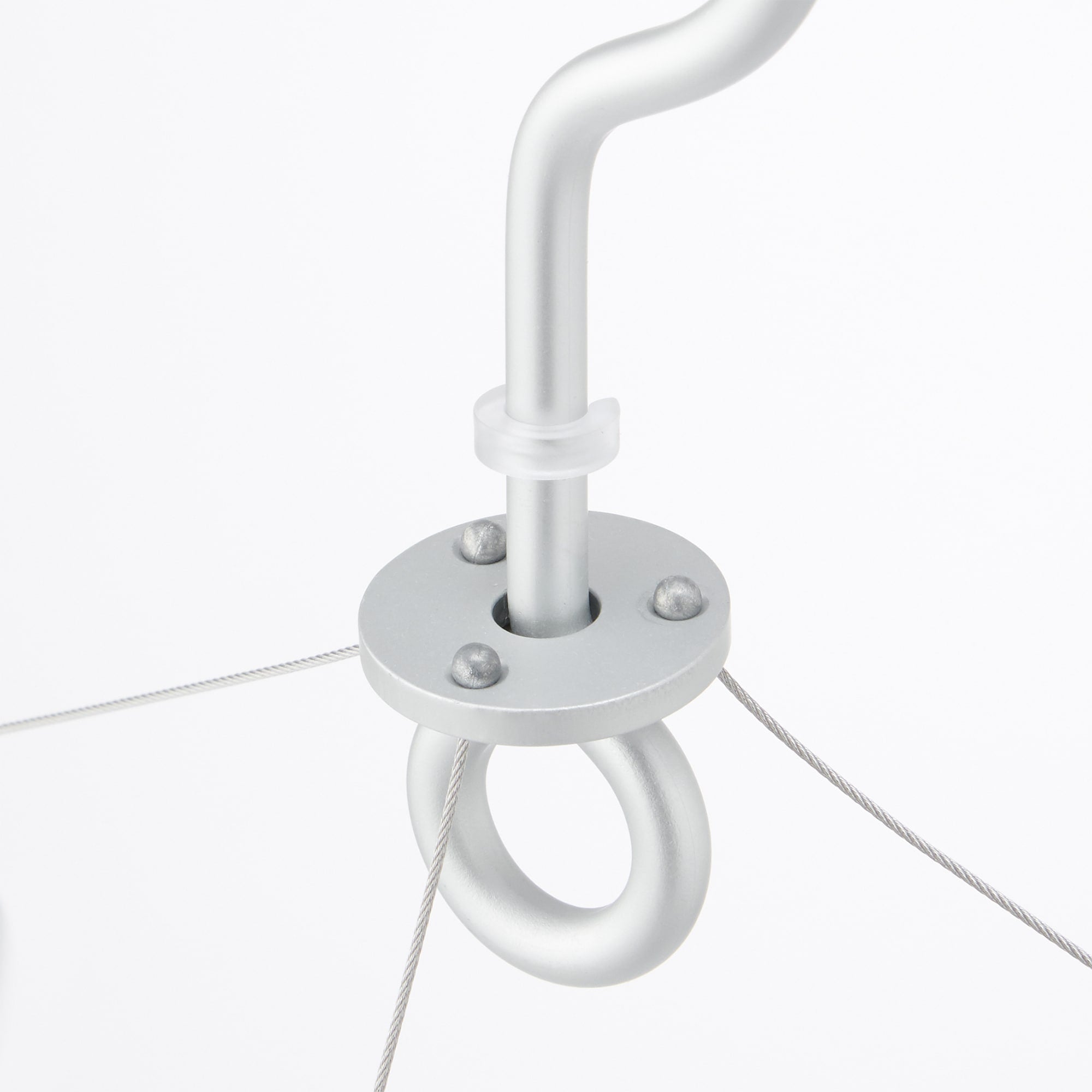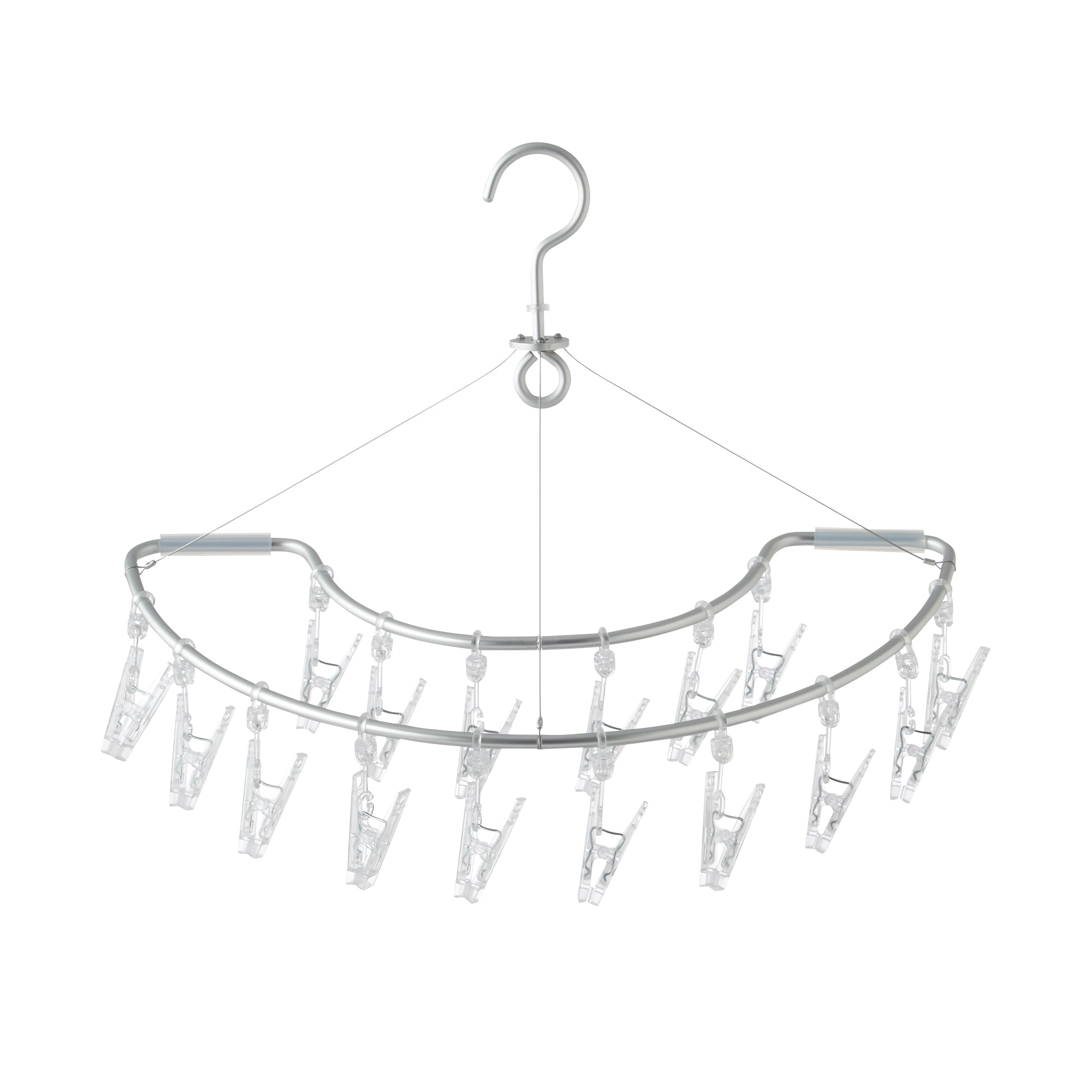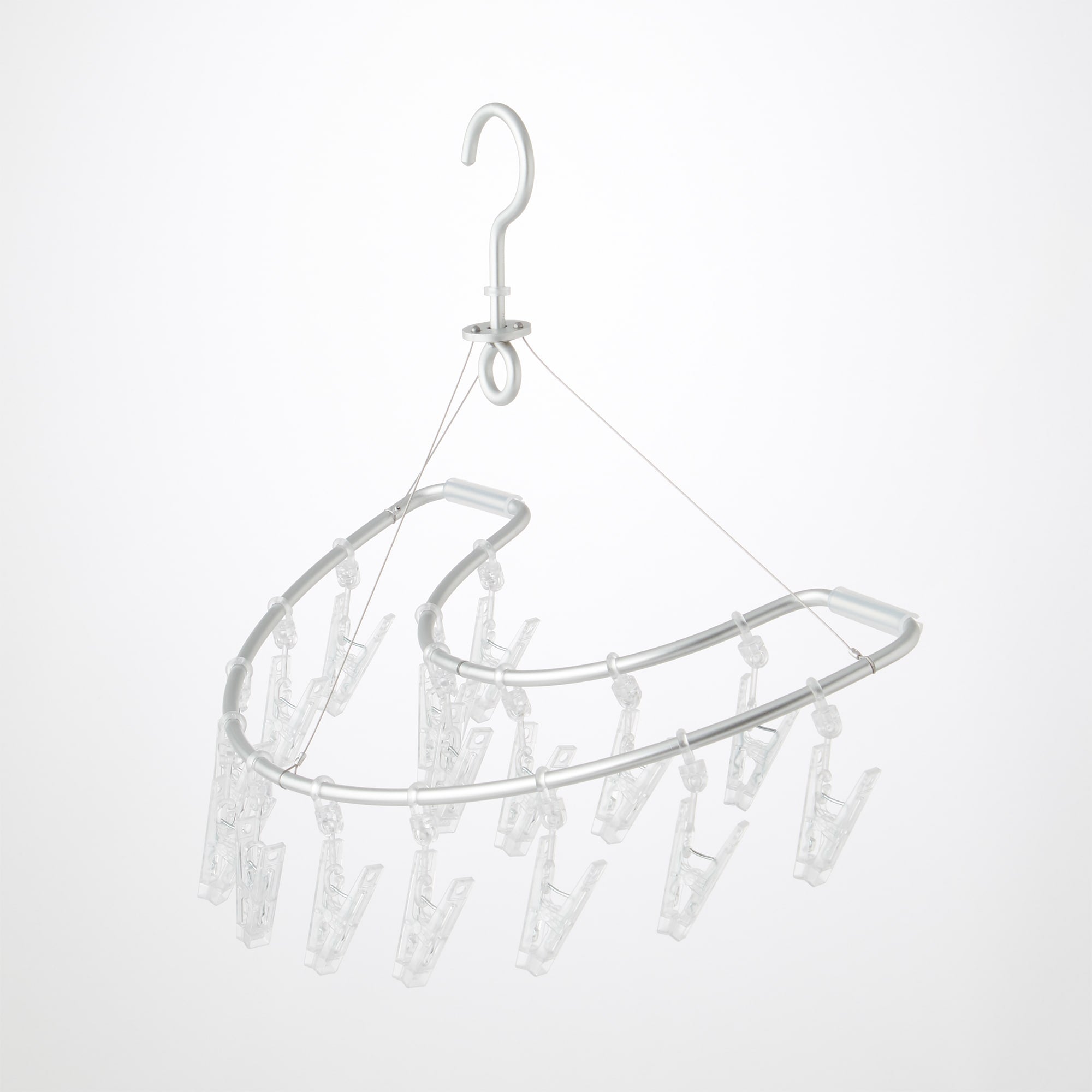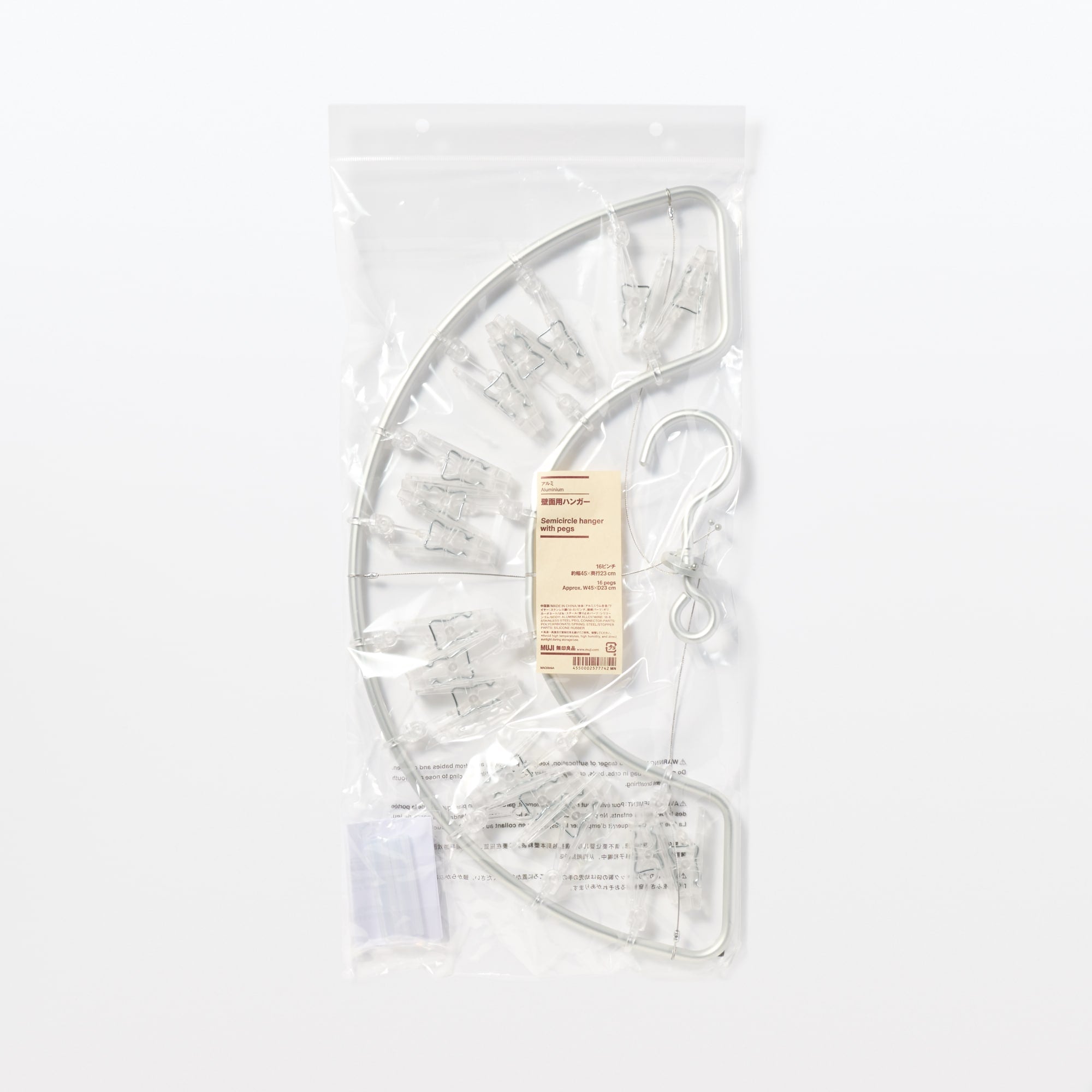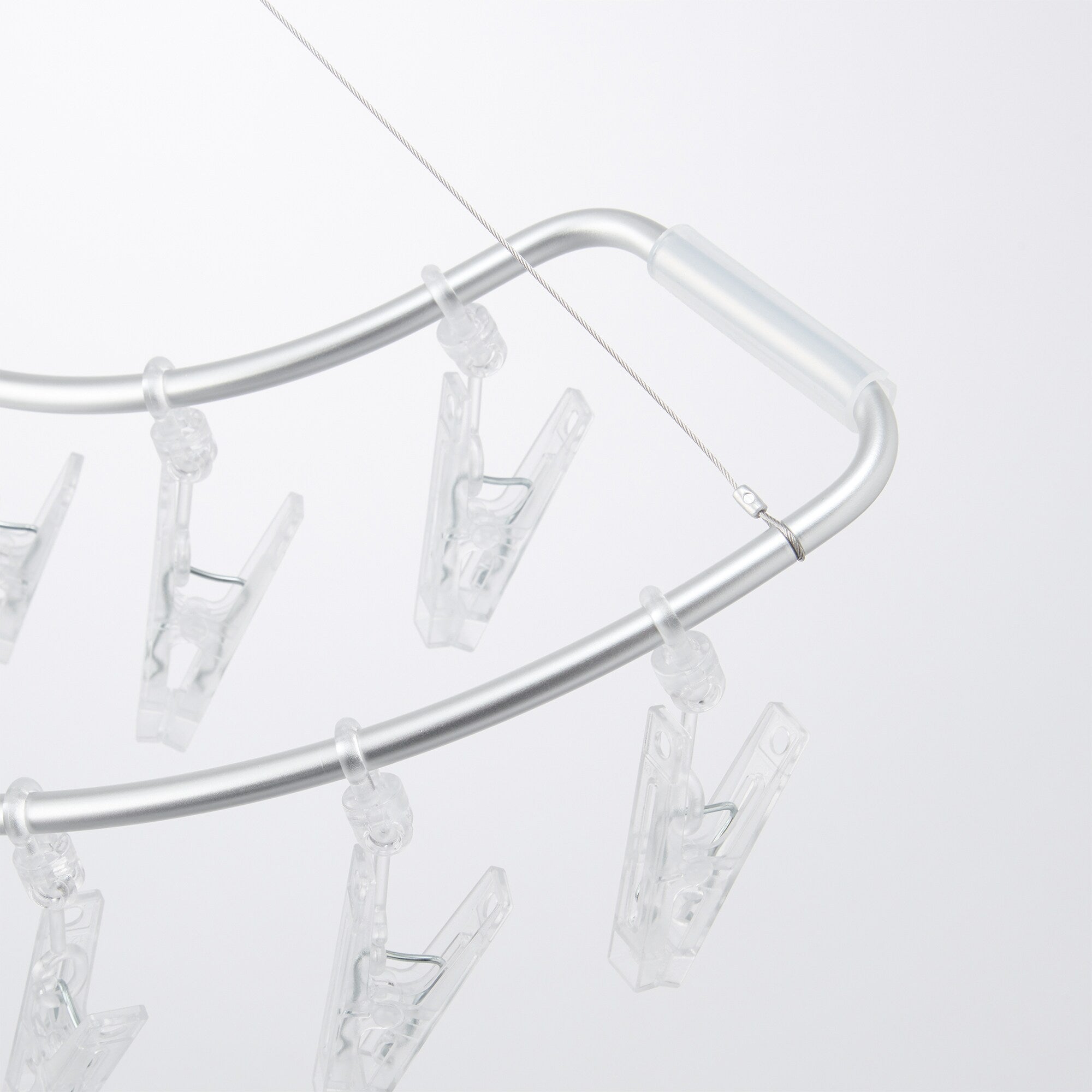 半円形で壁面に掛けた時に斜めになりにくい形状のハンガーです。フレームはアルミ製のパイプで軽く、ピンチは衝撃に強いポリカーボネートを使用しています。ピンチが劣化した場合は別売のピンチに取り換えが可能です。付属のシリコーン製のパイプは壁面に接する面に装着し緩衝材としてお使いください。