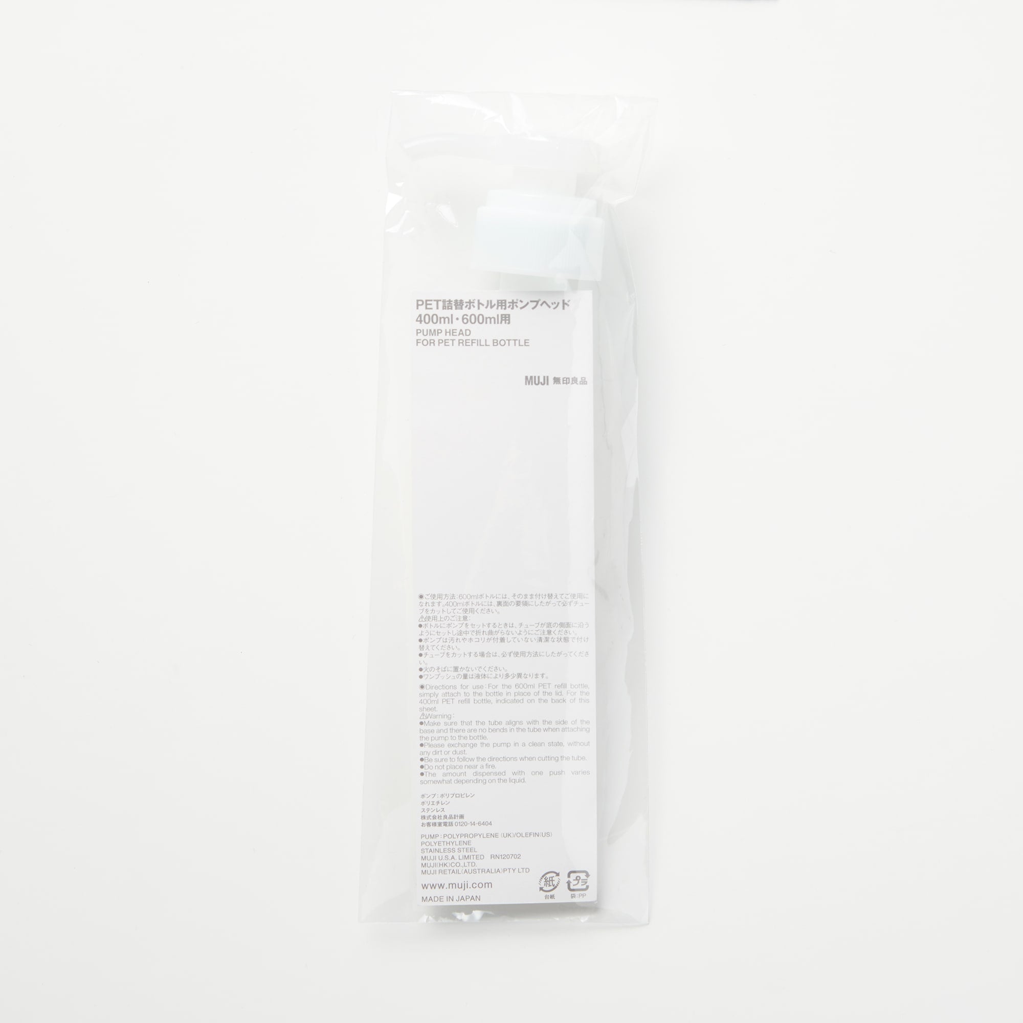 無印良品のPET詰替ボトル400ml・600ml専用のポンプヘッドです。ワンプッシュで約3cc(3ml)出ます。ヘッド部の汚れが気になる時や破損した時などに付け替えてご使用ください。