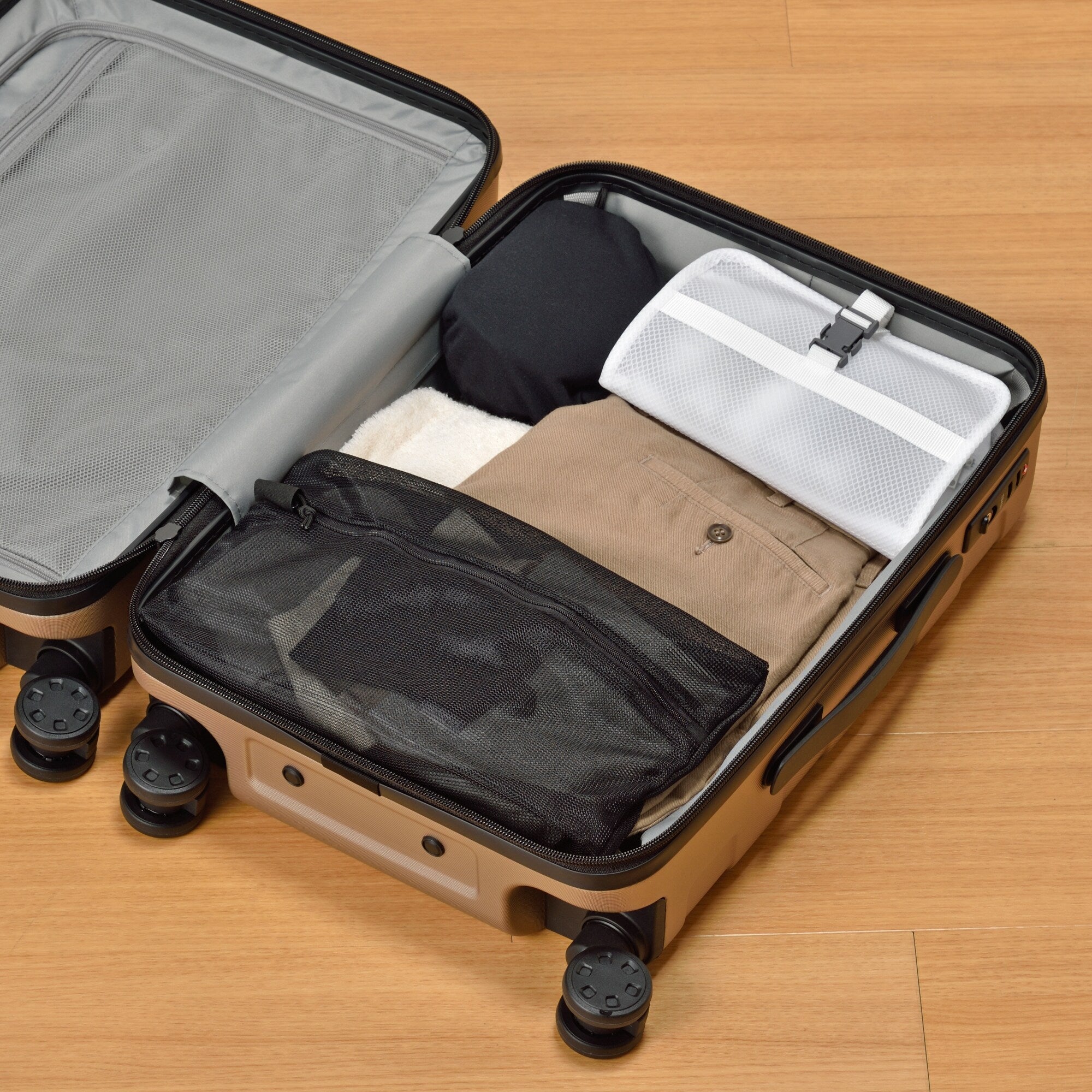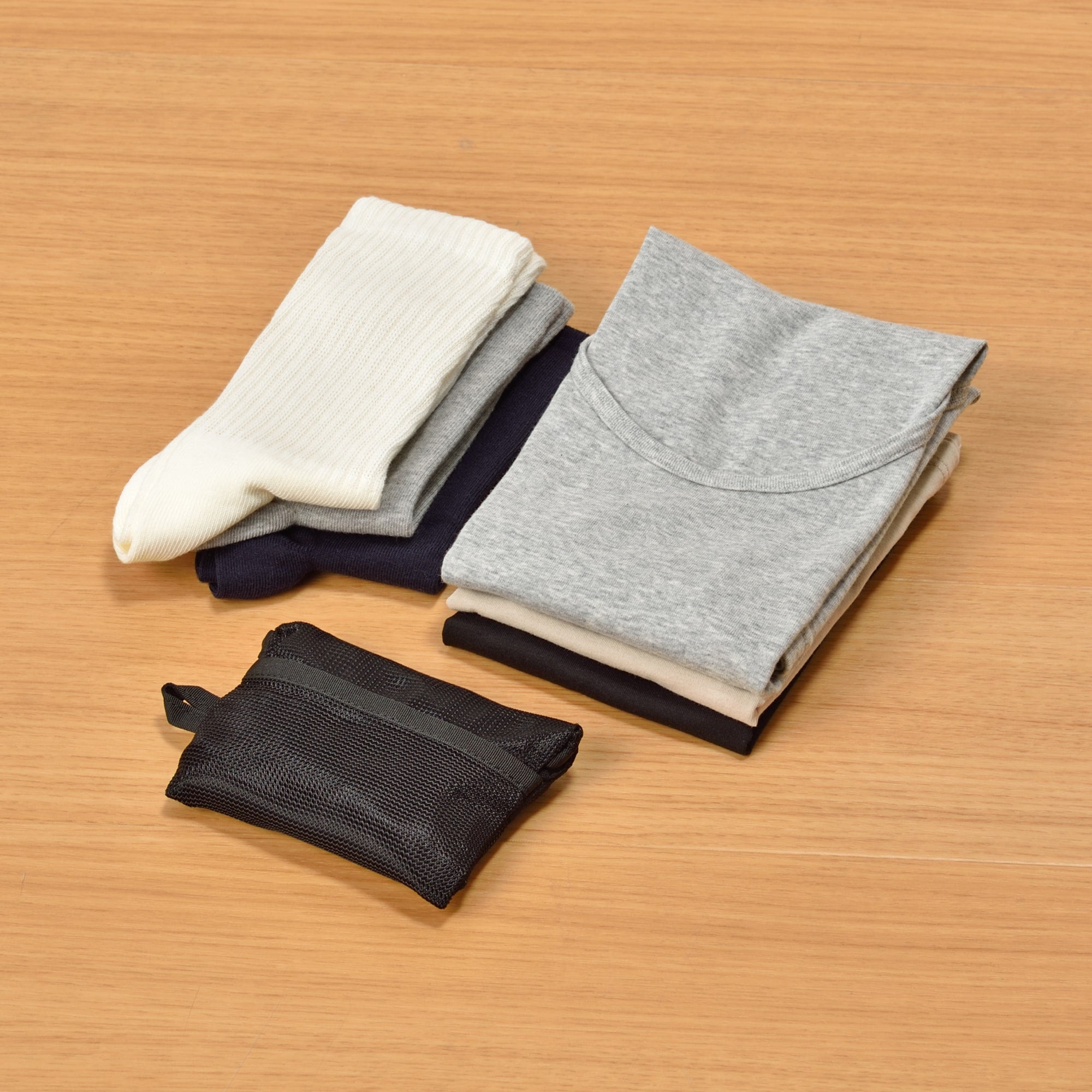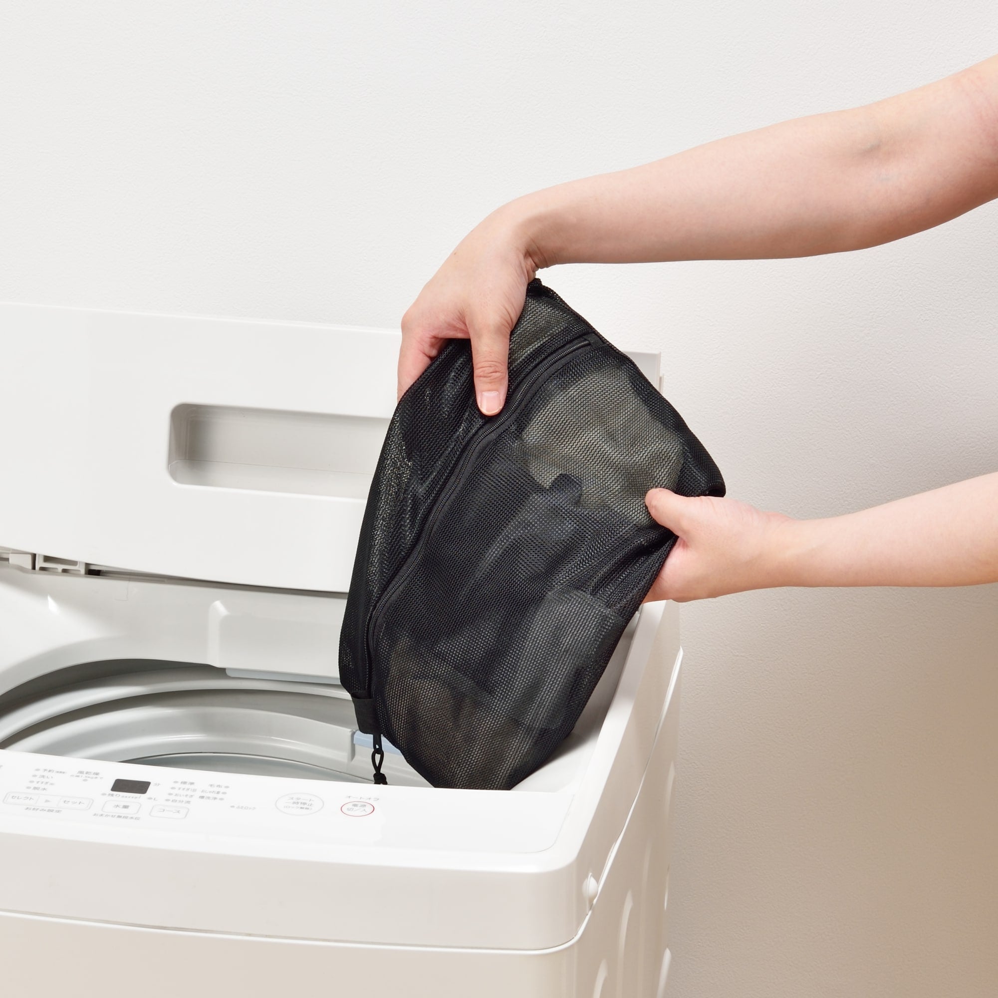 洗濯ネットの素材を使用した衣類用ケース。収納した衣類をそのまま洗濯できます。