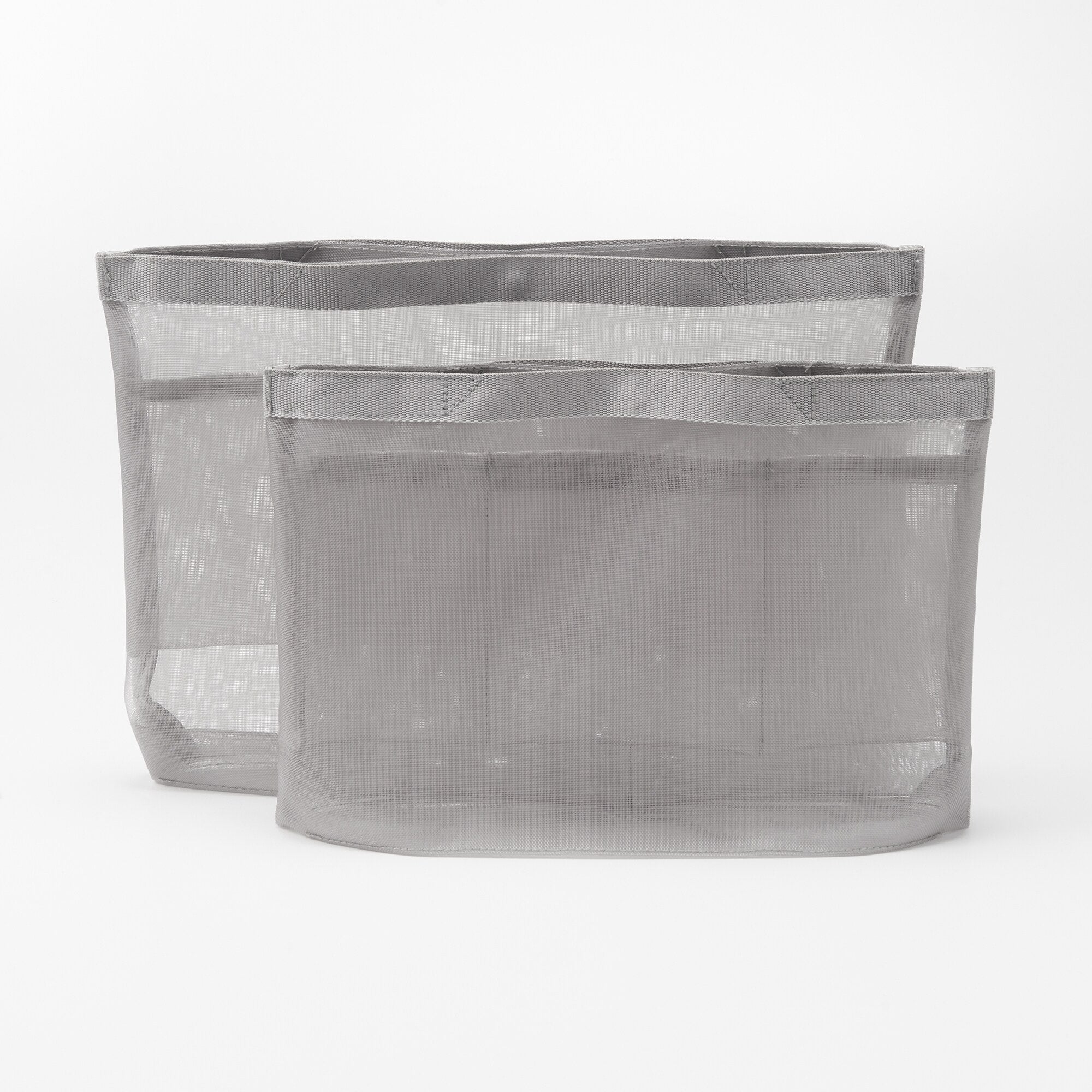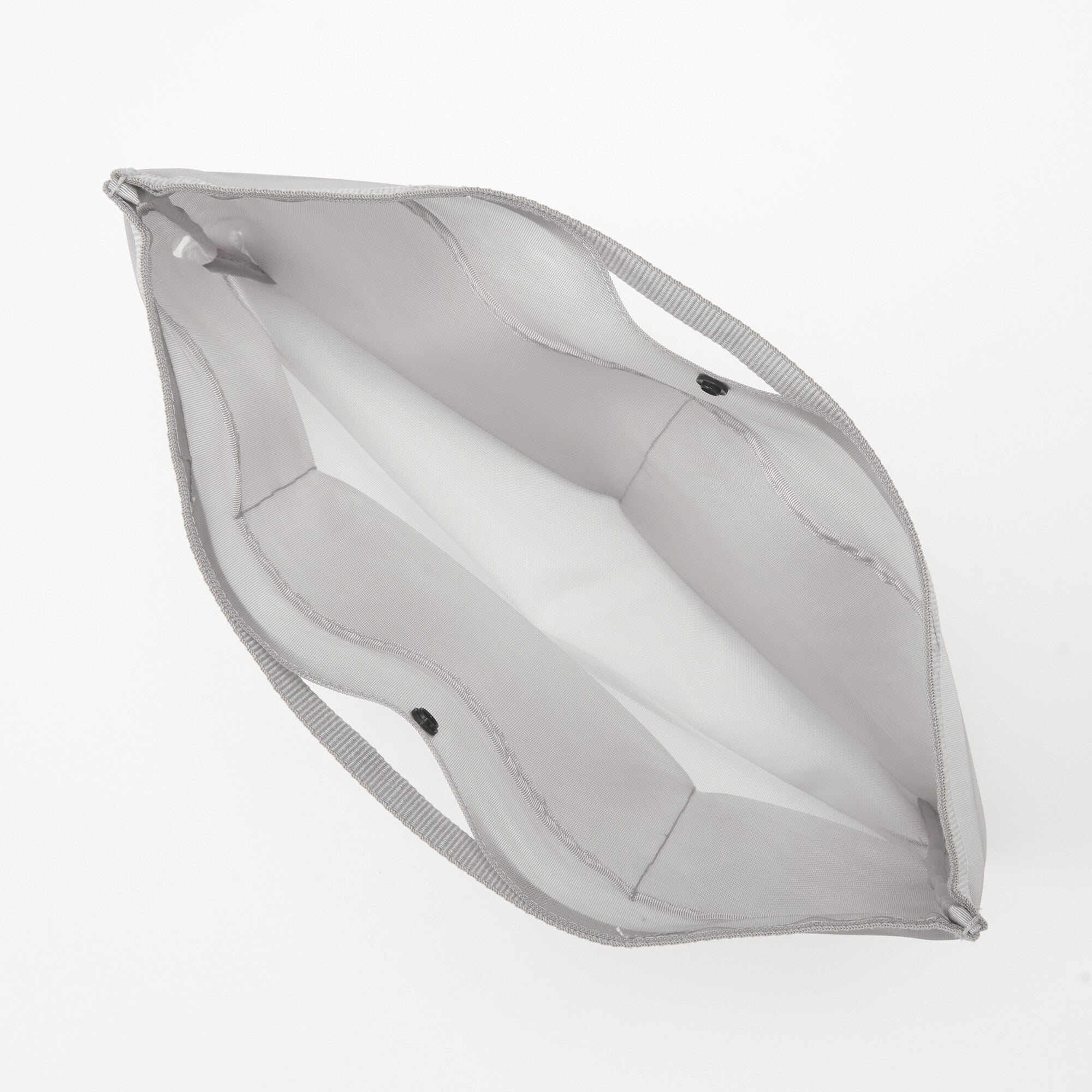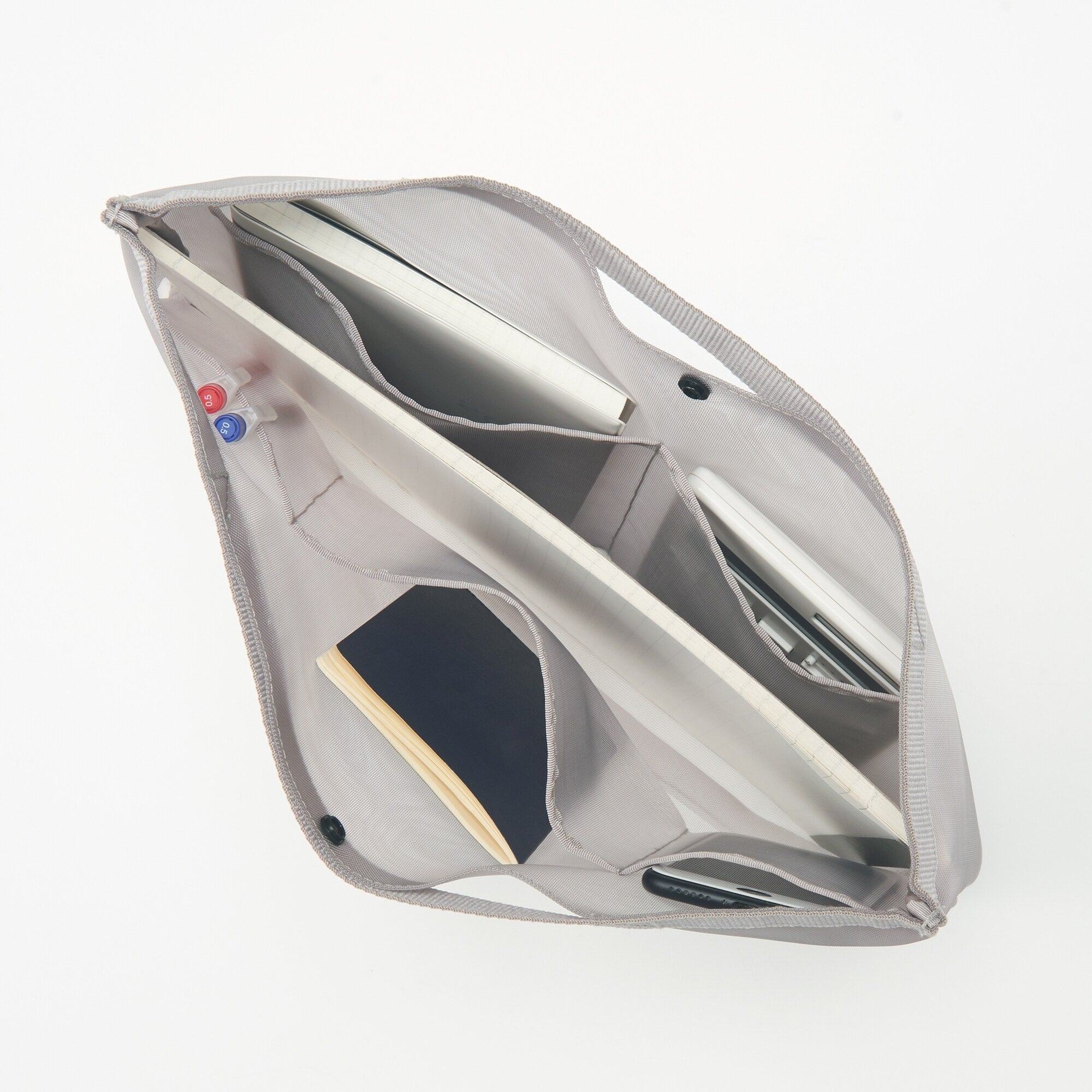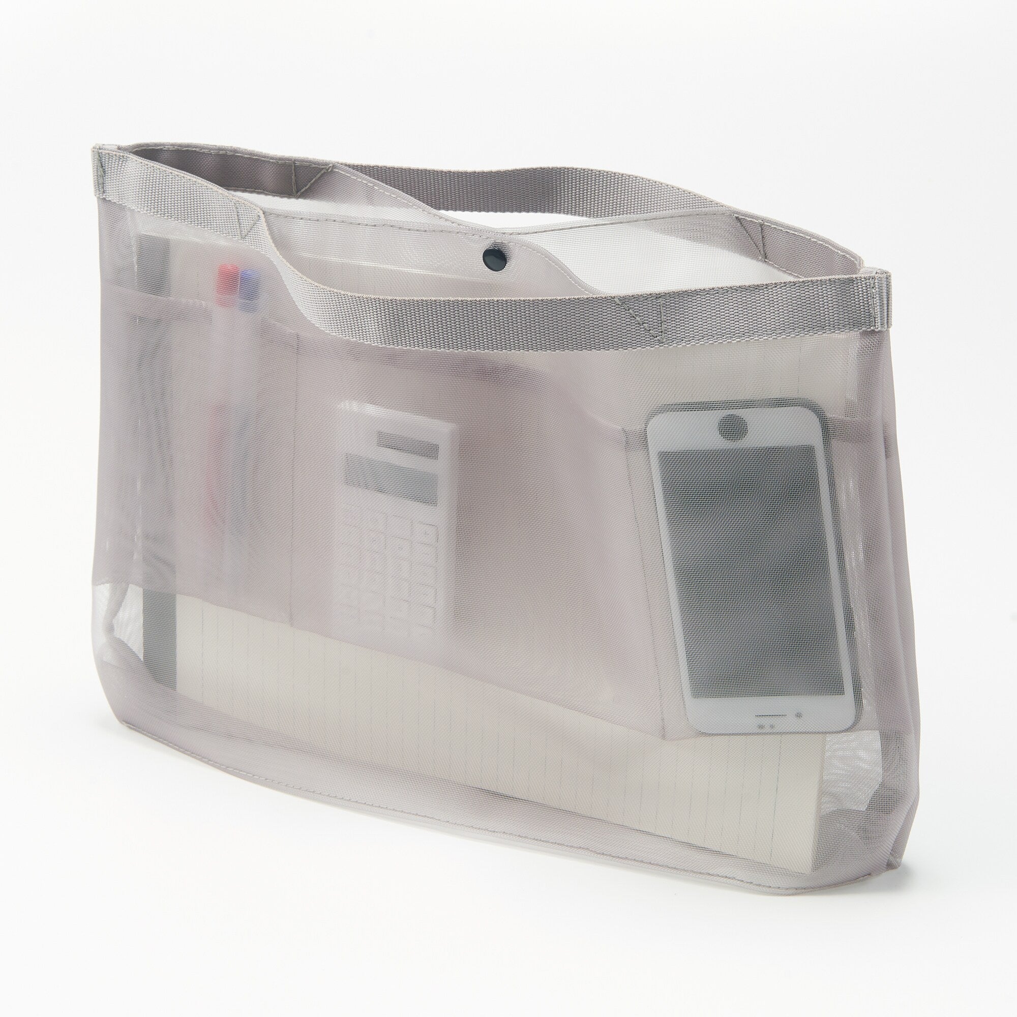 軽くて丈夫なナイロンメッシュ生地で作りました。A4サイズのノートやクリアファイルが入るサイズです。外寸:約25×37×3cm