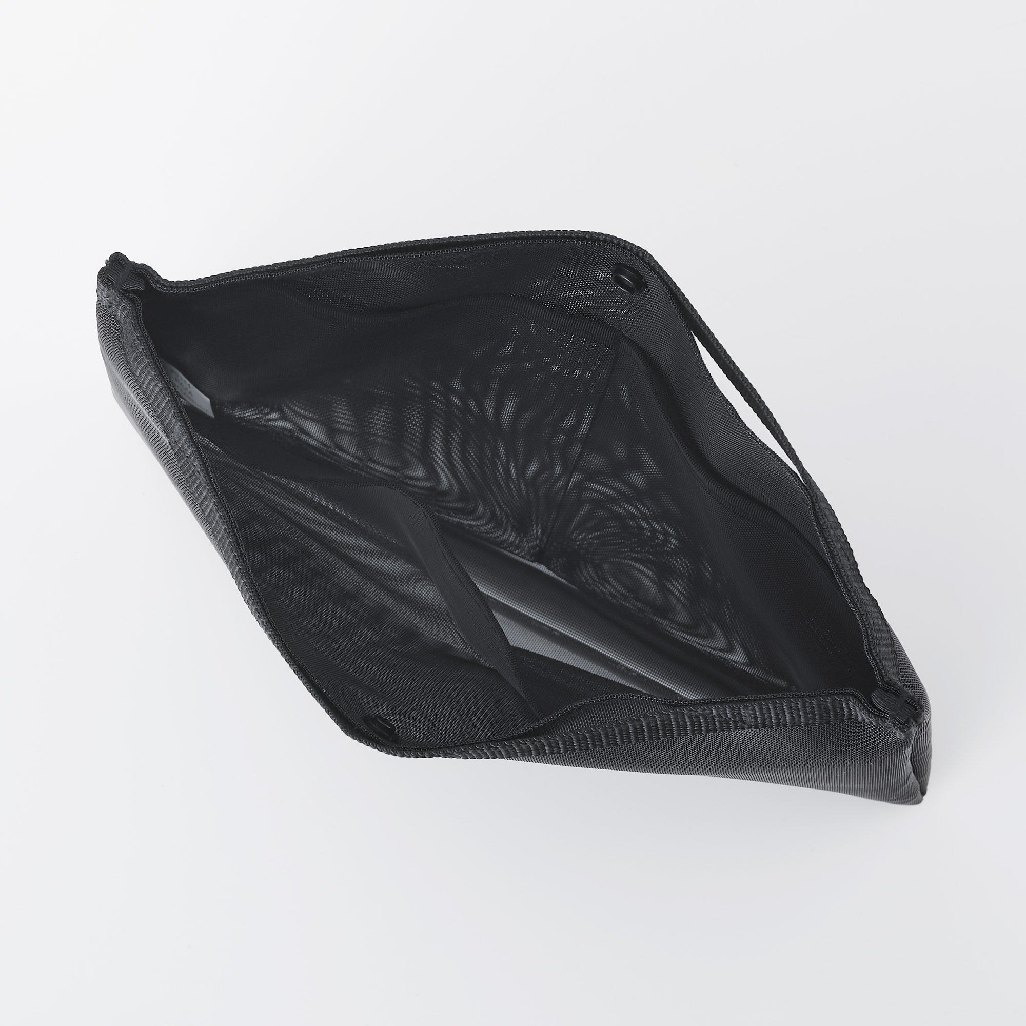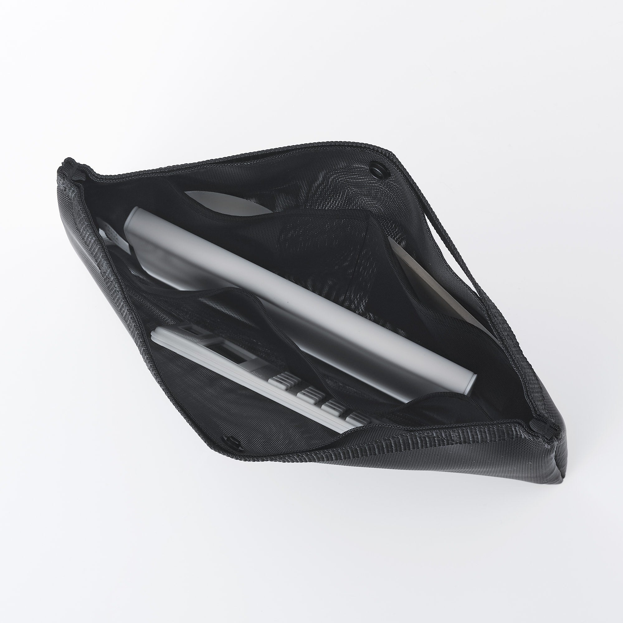 軽くて丈夫なナイロンメッシュ生地で作りました。A5サイズのノートが入るサイズです。外寸:約18×25×3cm