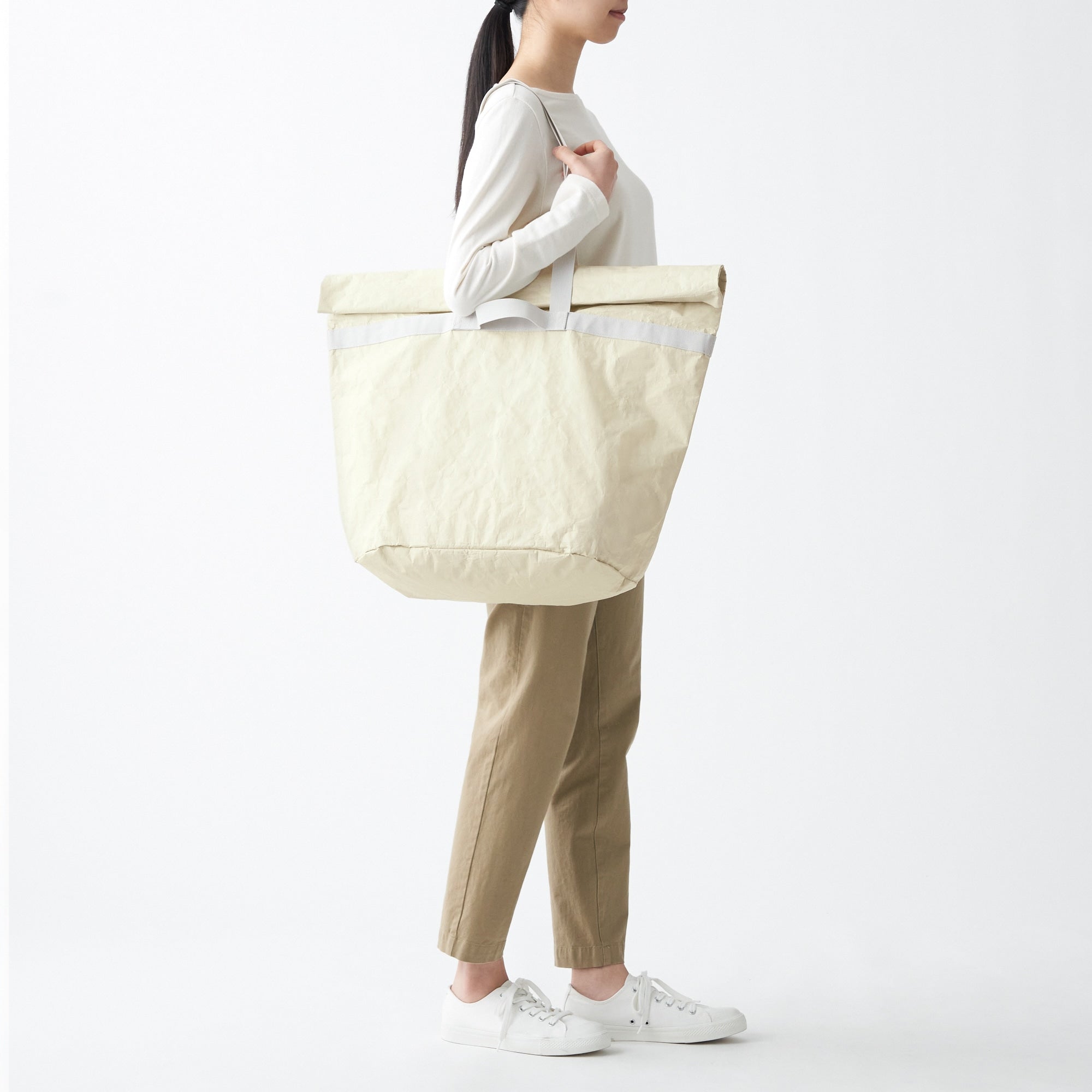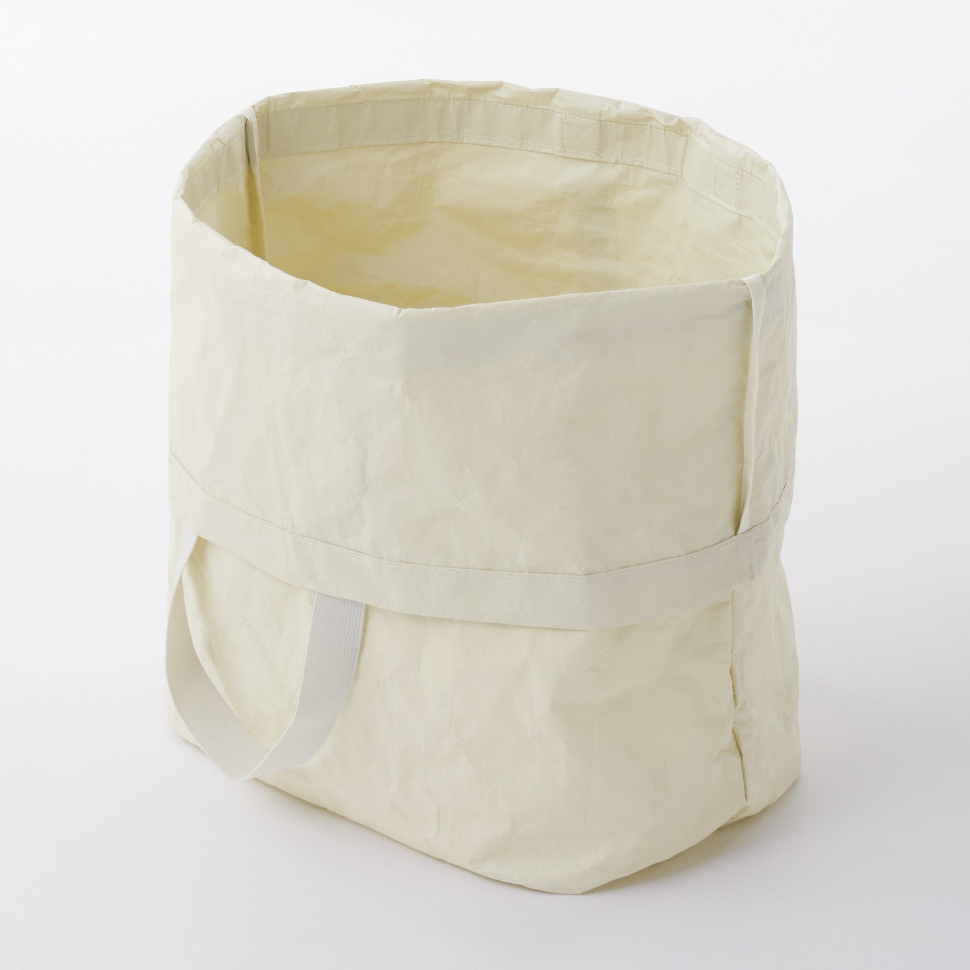 口を外に折り返して使えます。持ち出すときに中の洗濯物が見えにくいよう上部を長くしました。