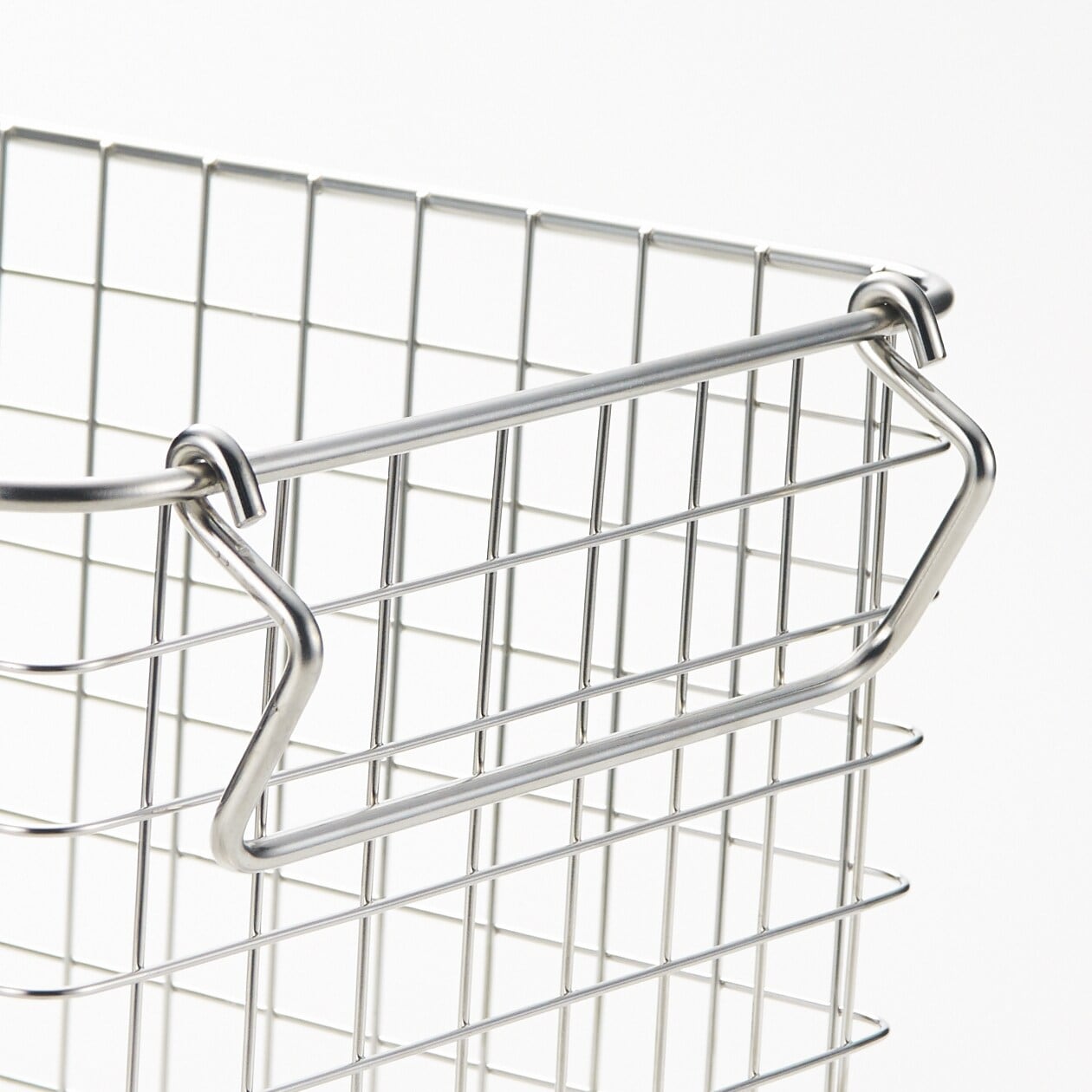 錆びにくいステンレスを使用したバスケットです。持ち手を内側におさめると積み重ねもできます。