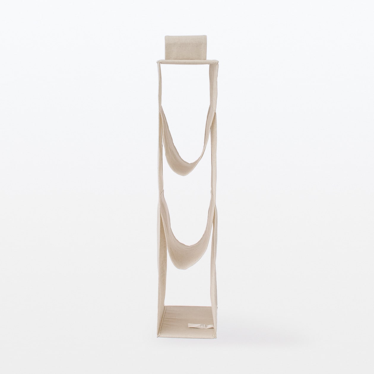 麻の風合いとポリエステルの丈夫さを生かしたバッグ収納ラックです。バッグを収納しやすいように前後の仕切がなく、1段あたり1.3kgまでの物を収納することができます。