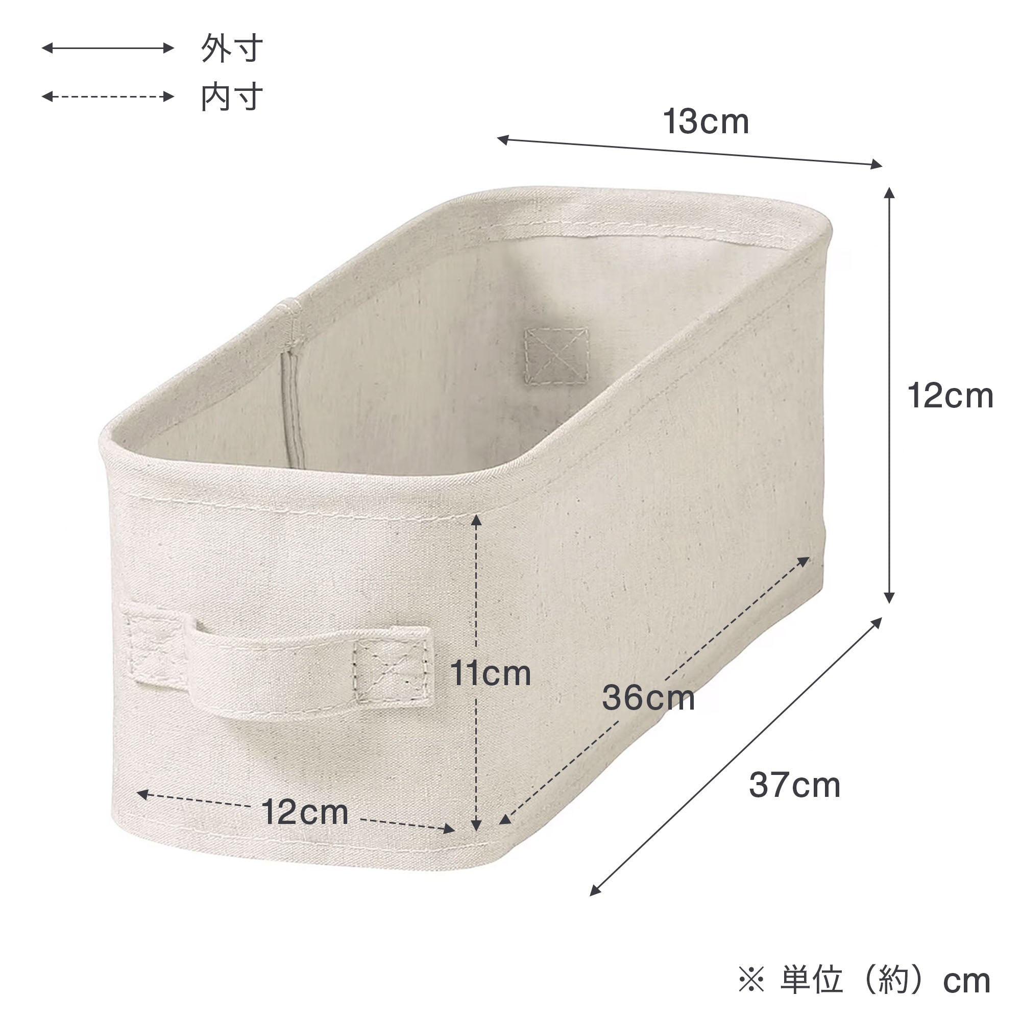 生地の内面をコーティングしたコンパクトにたためる布製ボックスです。整理しにくい小物やおもちゃなどをまとめて収納するのに便利です。耐荷重10kg、内寸約幅12.3×奥行36.3×高さ11cm