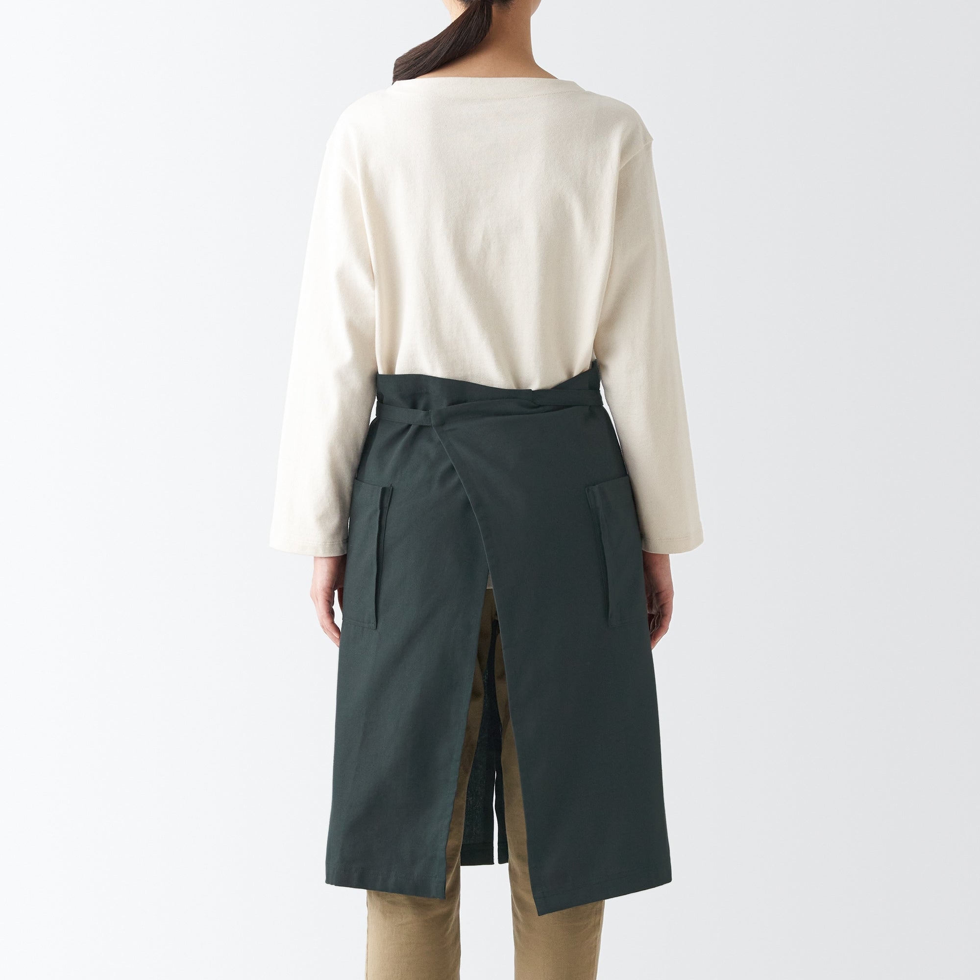 気軽に使える前掛けタイプのエプロンです。足さばきが良くしゃがみやすいスリット入りで、ポケットは動きやすい位置についています。腰にフィットして着用しても、ものが取り出しやすいように、ポケットの後ろにだけマチをつけました。男女兼用のフリーサイズです。