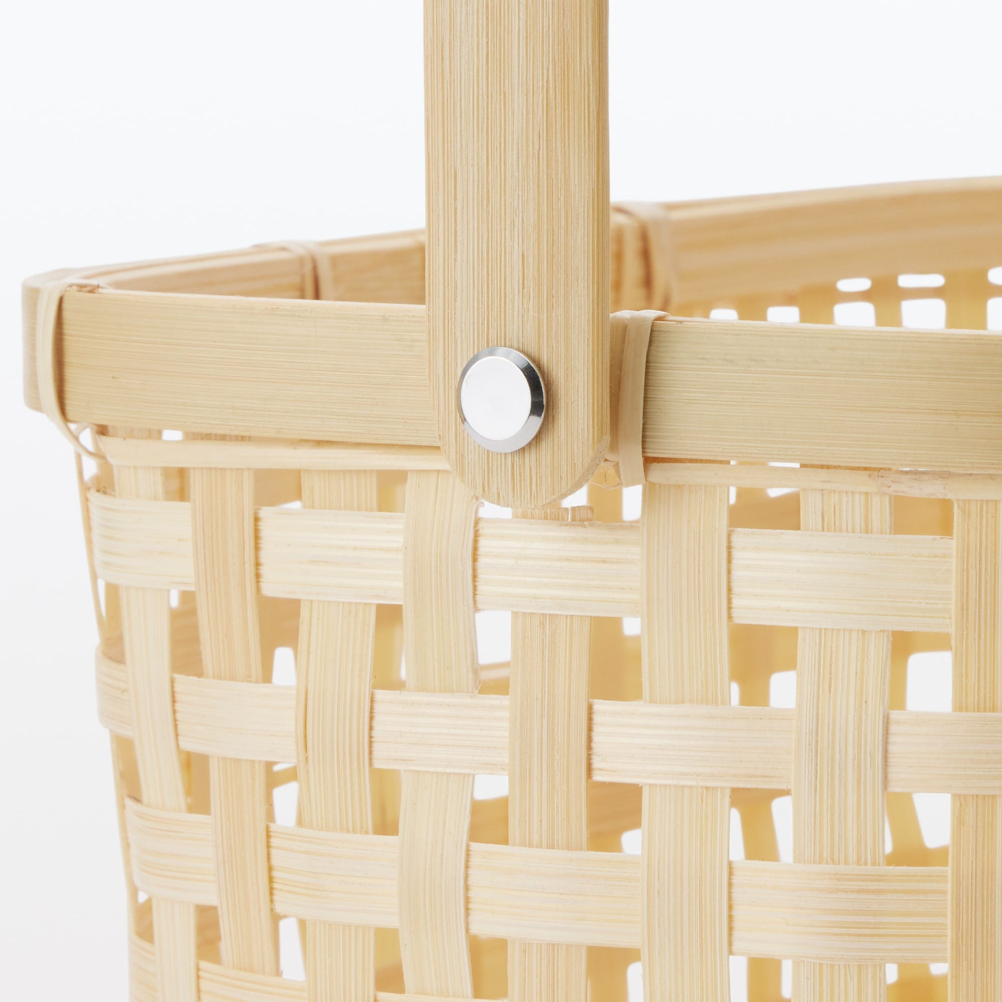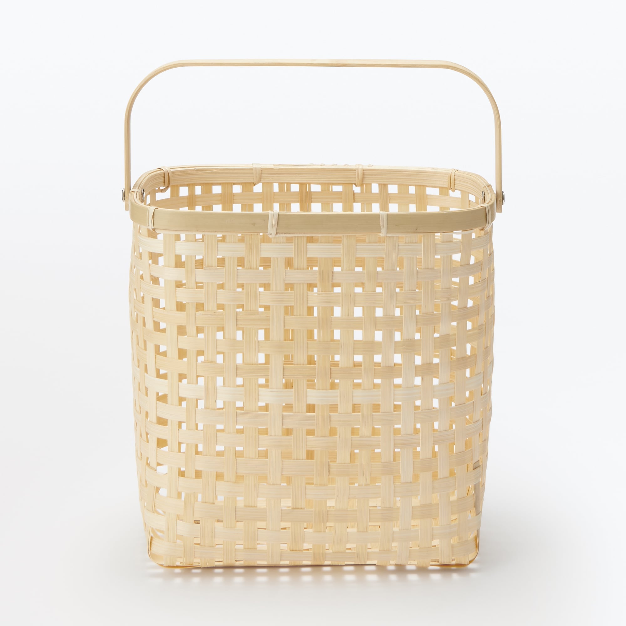 軽くて丈夫な竹を使い手編みしたかごです。程よく中身を隠してくれる編み目が特徴です。持ち手は可動式で使わない時はたためるので余計なスペースをとりません。