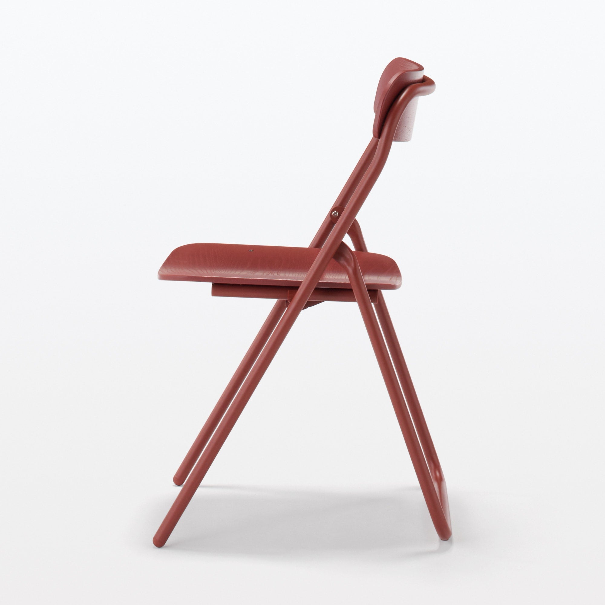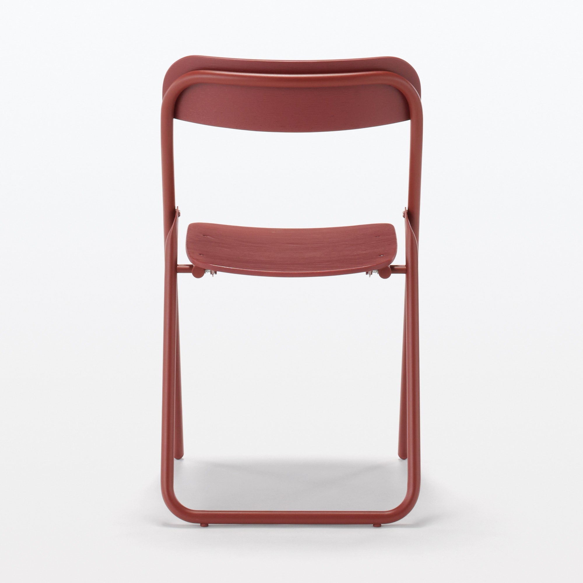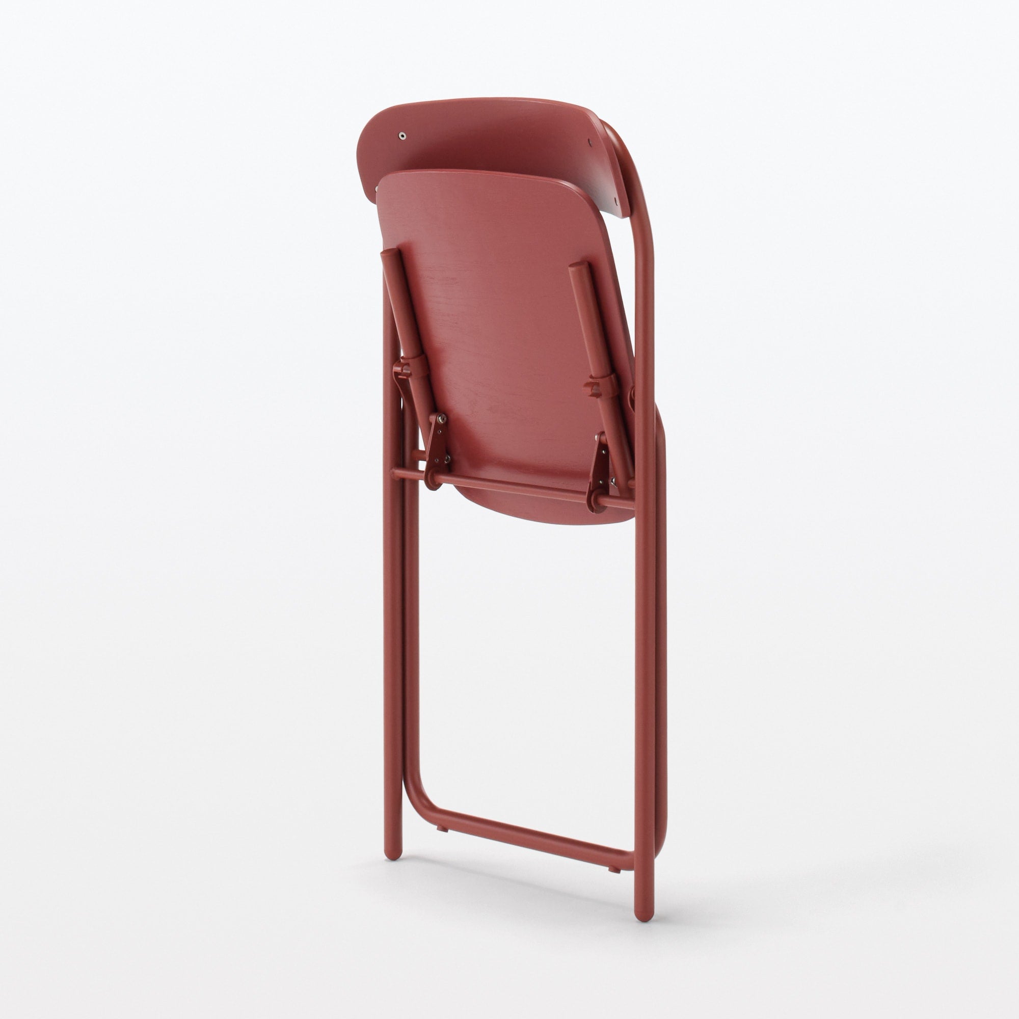 曲げたスチールパイプに板を取り付けたシンプルな折りたたみチェアです。使わないときはたたむことで、省スペースで保管ができます。同シリーズのテーブルと色を合わせて使えます。