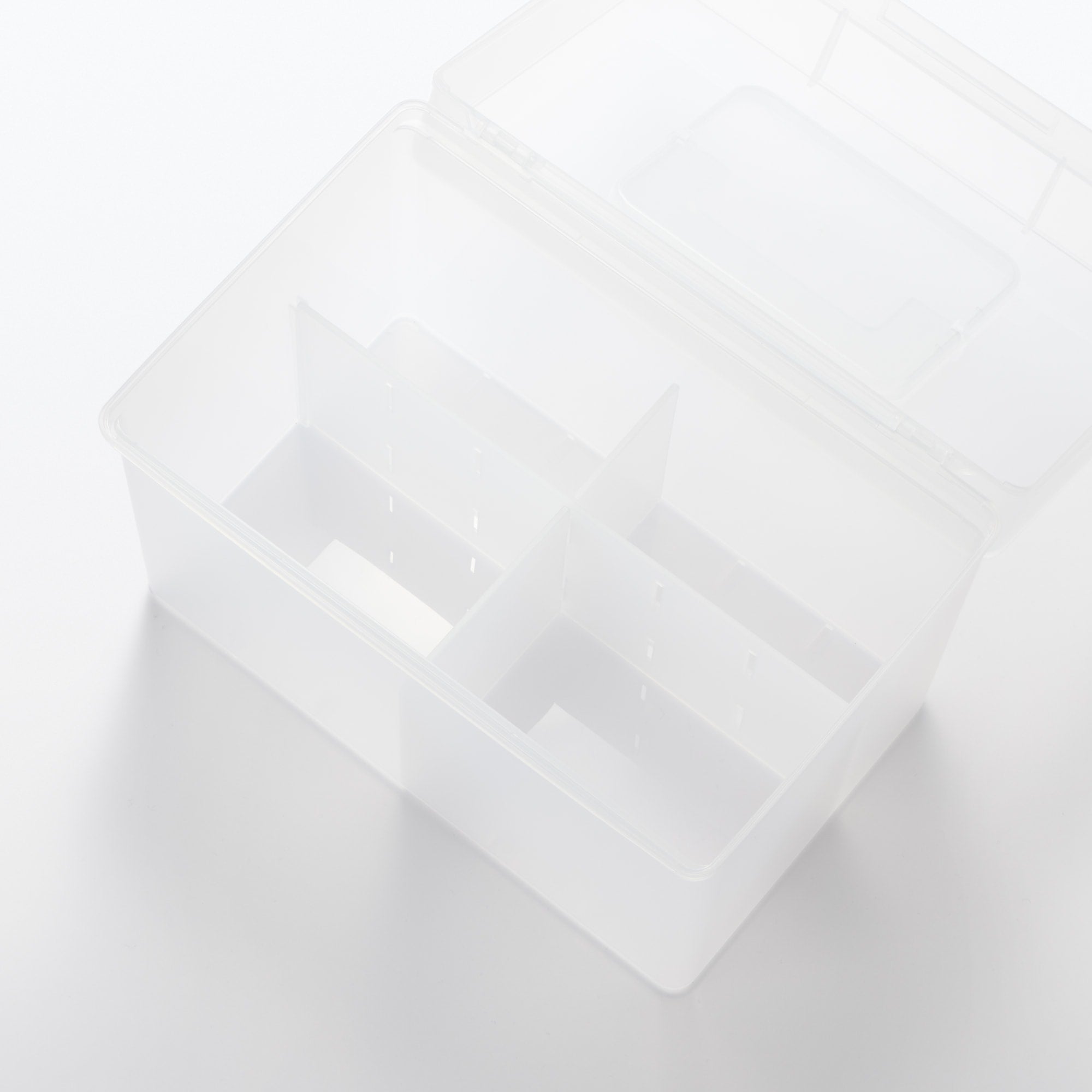 持ち運びしやすいハンドル付きの収納ボックスです。仕切りとトレーの位置を調整できます。