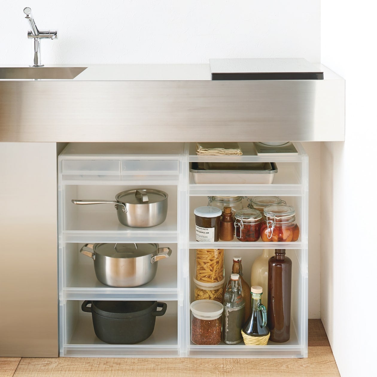 ポリプロピレンでオープン型の収納ラックです。積み重ねもでき、シンク下などの隙間の収納をきれいに整理できます。