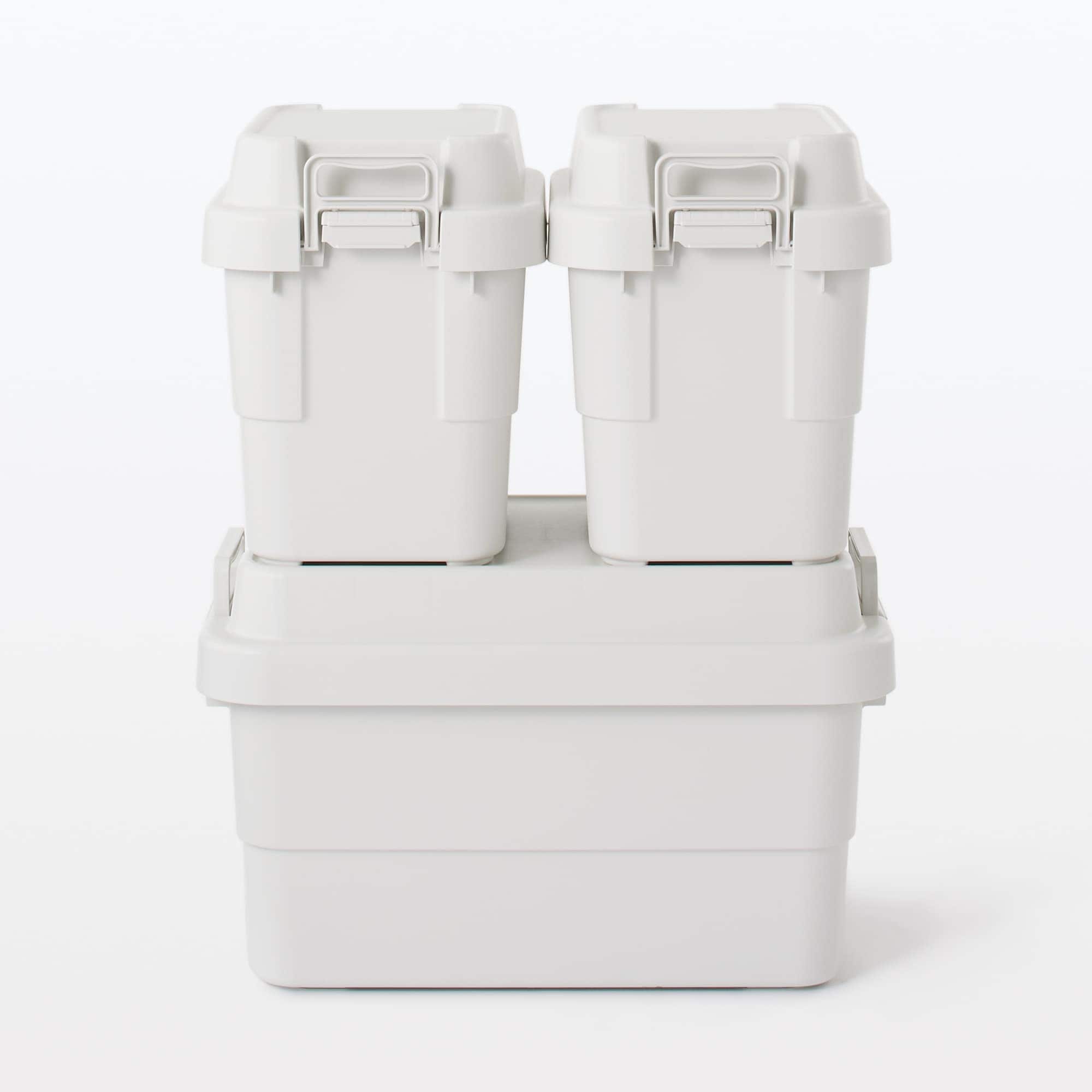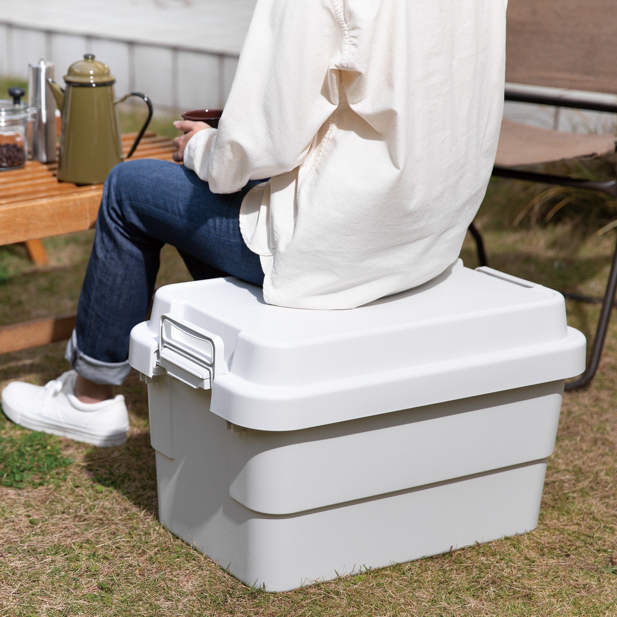 ベランダなどの屋外でも使用できる収納ボックスです。簡易的な腰掛けとしてもご使用頂けます。再生ポリプロピレン30%以上活用しています。