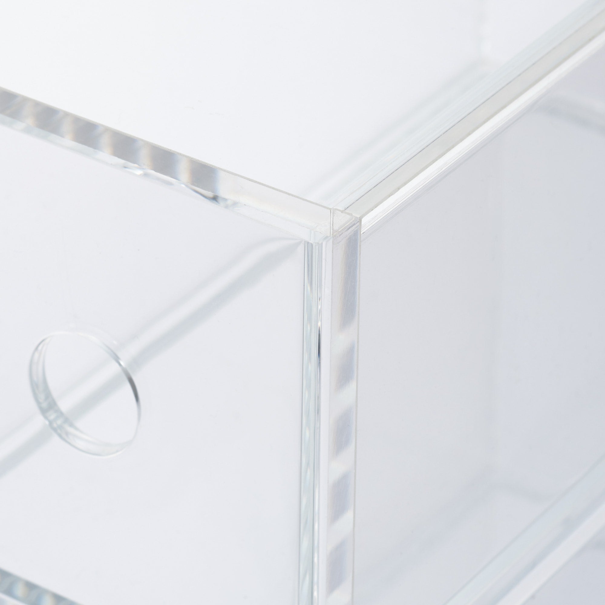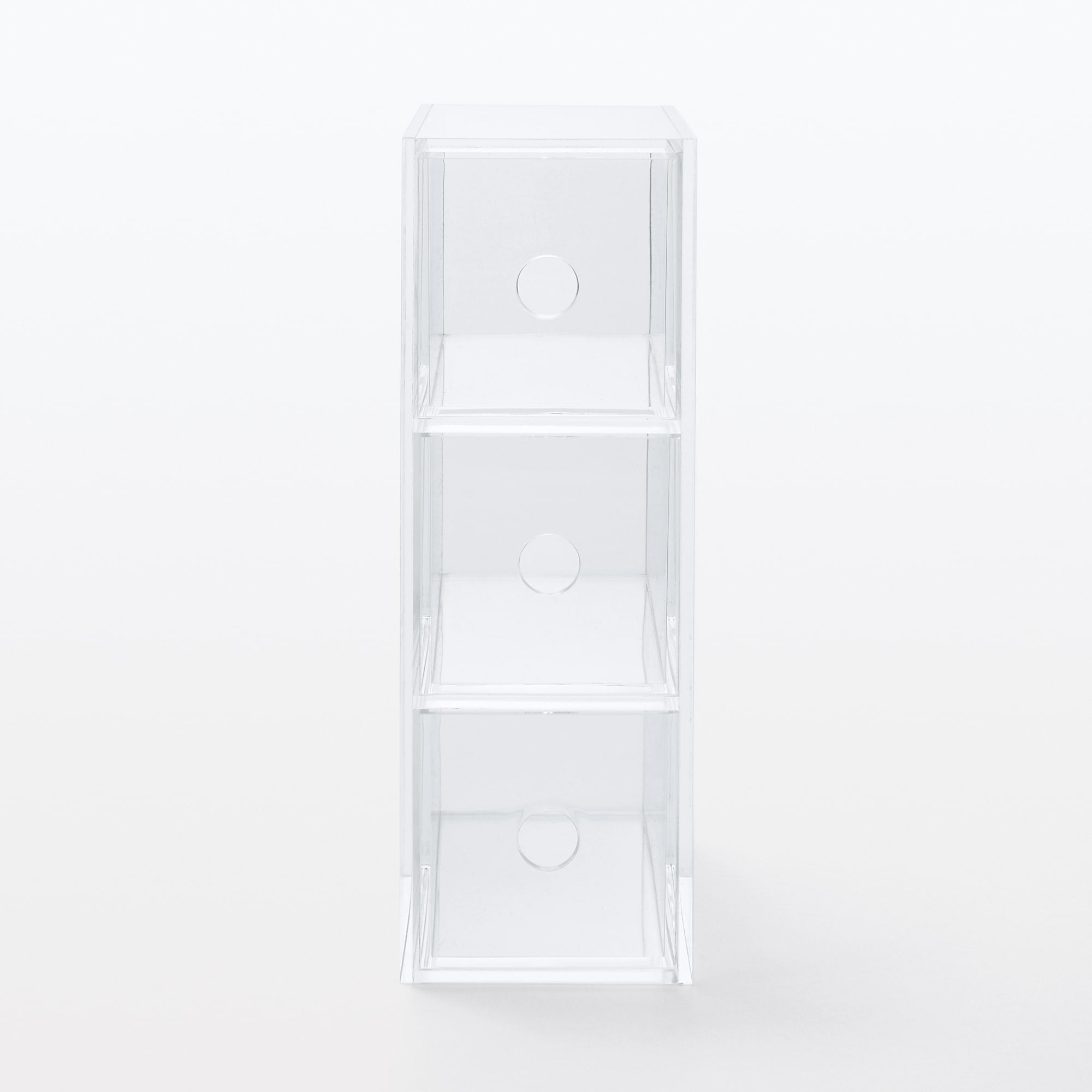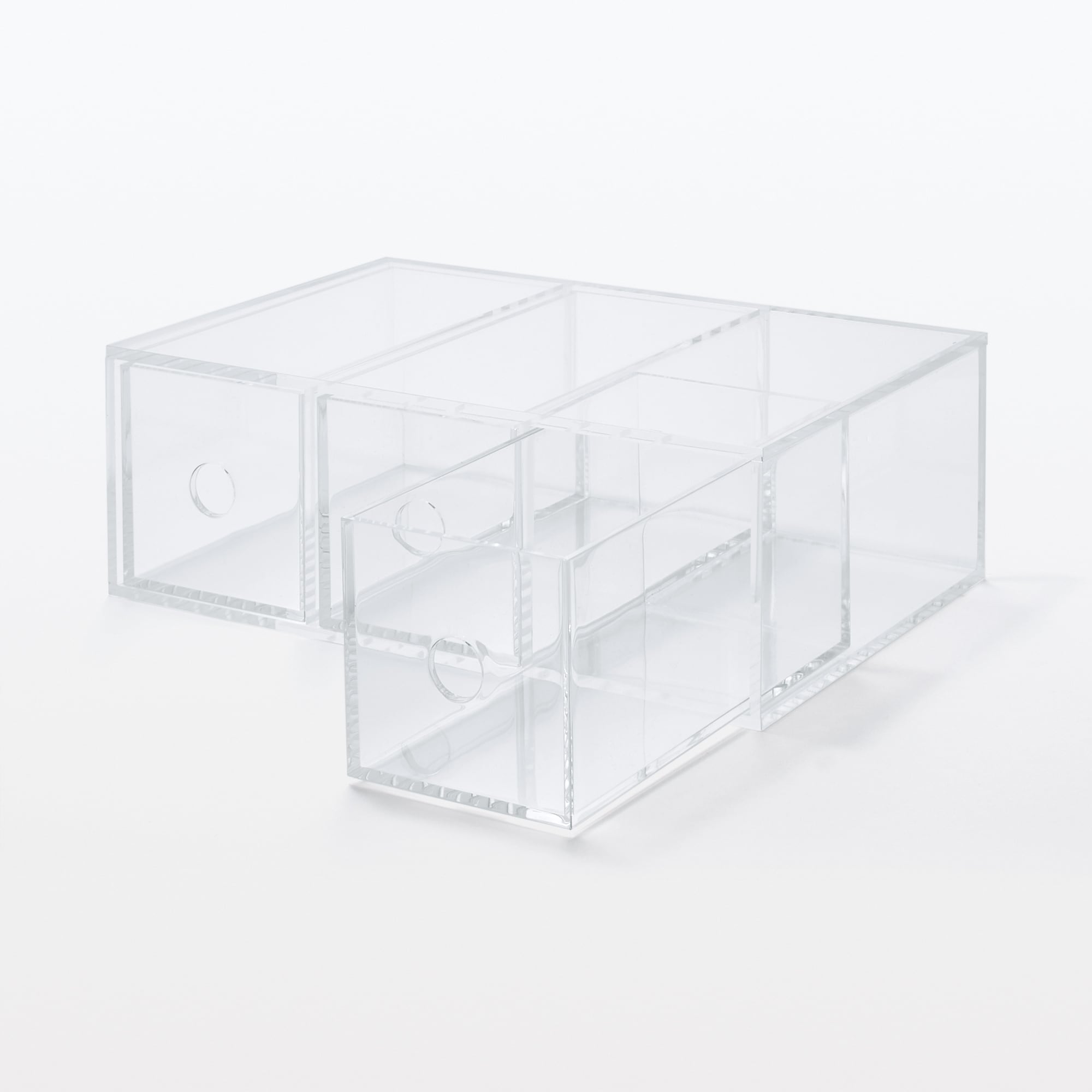見える収納に便利なアクリル素材です。MDFボックスや収納ボックス6段と並べて置けるよう、高さを同じにしました。引き出しの向きを入れ替えれば縦・横どちらでも置いて使えます。