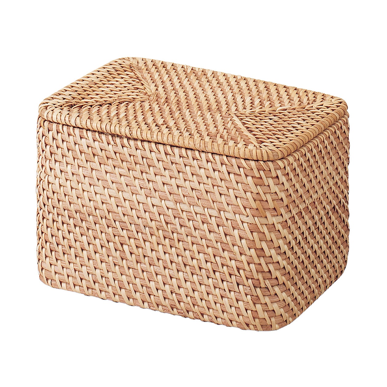 積み重ねができるフタ付きのラタンバスケットです。曲げやすく肌合いが滑らかな長所を生かし、やさしさのある手編みの商品にしました。