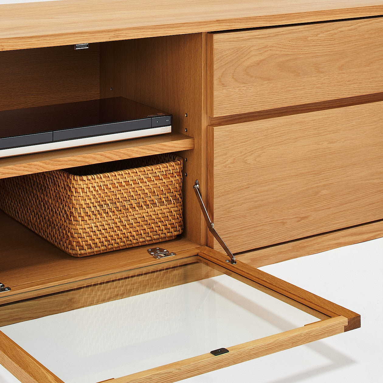 ベーシックなデザインの木製収納です。扉内に収納用品がぴったりと収まります。出しにはメディアなどを収納できます。扉内棚は可動式です。台輪式で、商品下にほこりがたまらず掃除が楽です。