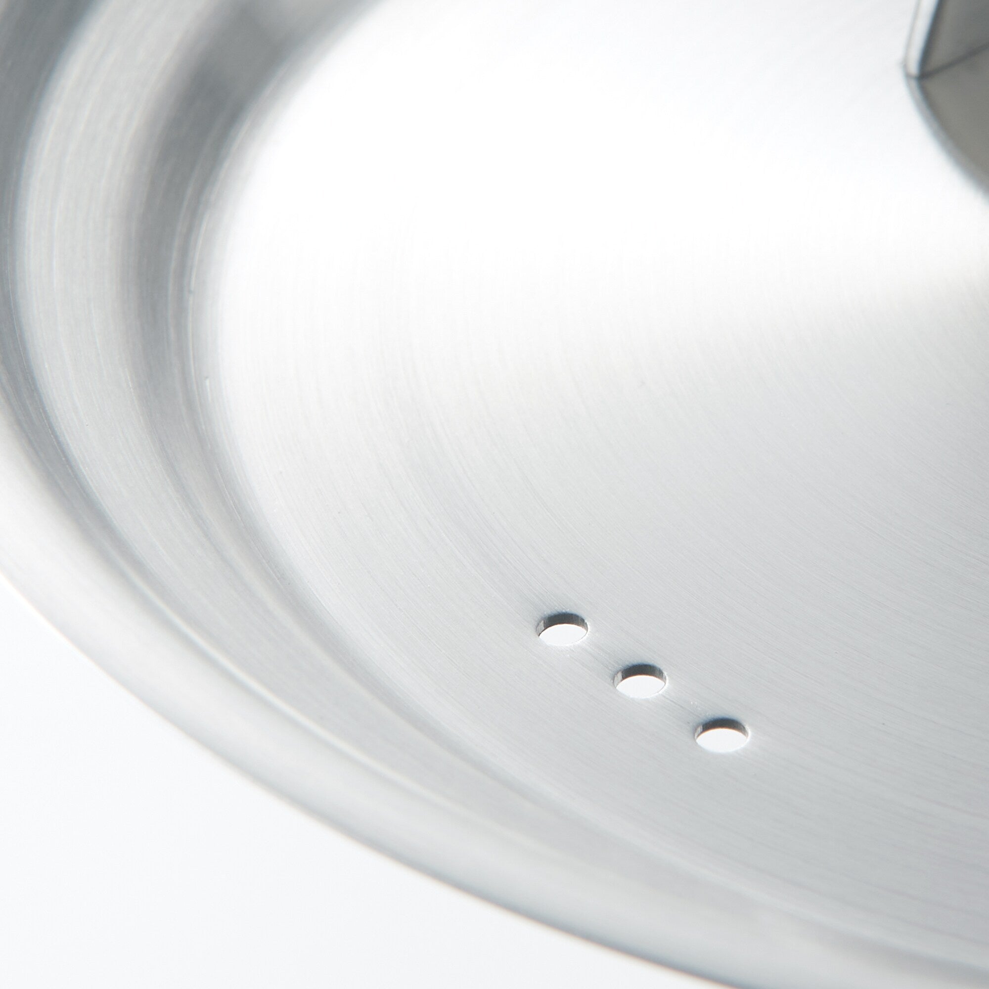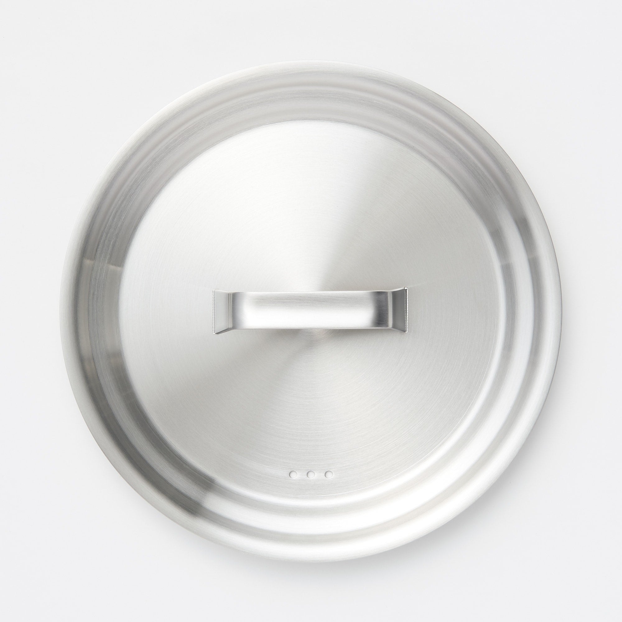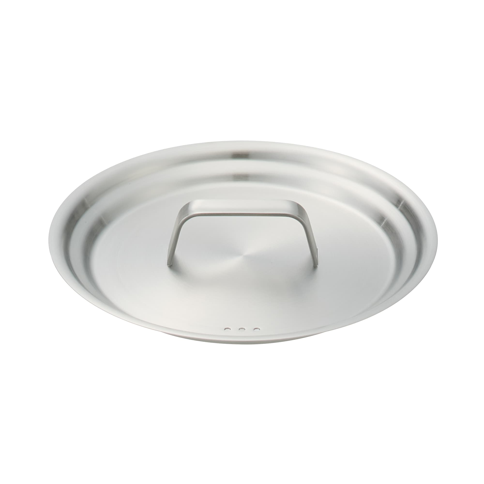 ステンレスアルミ三層鋼片手鍋用兼用フタです。収納しやすいようできるだけ平たくしました。さびに強い18-8ステンレスを使用しています。
