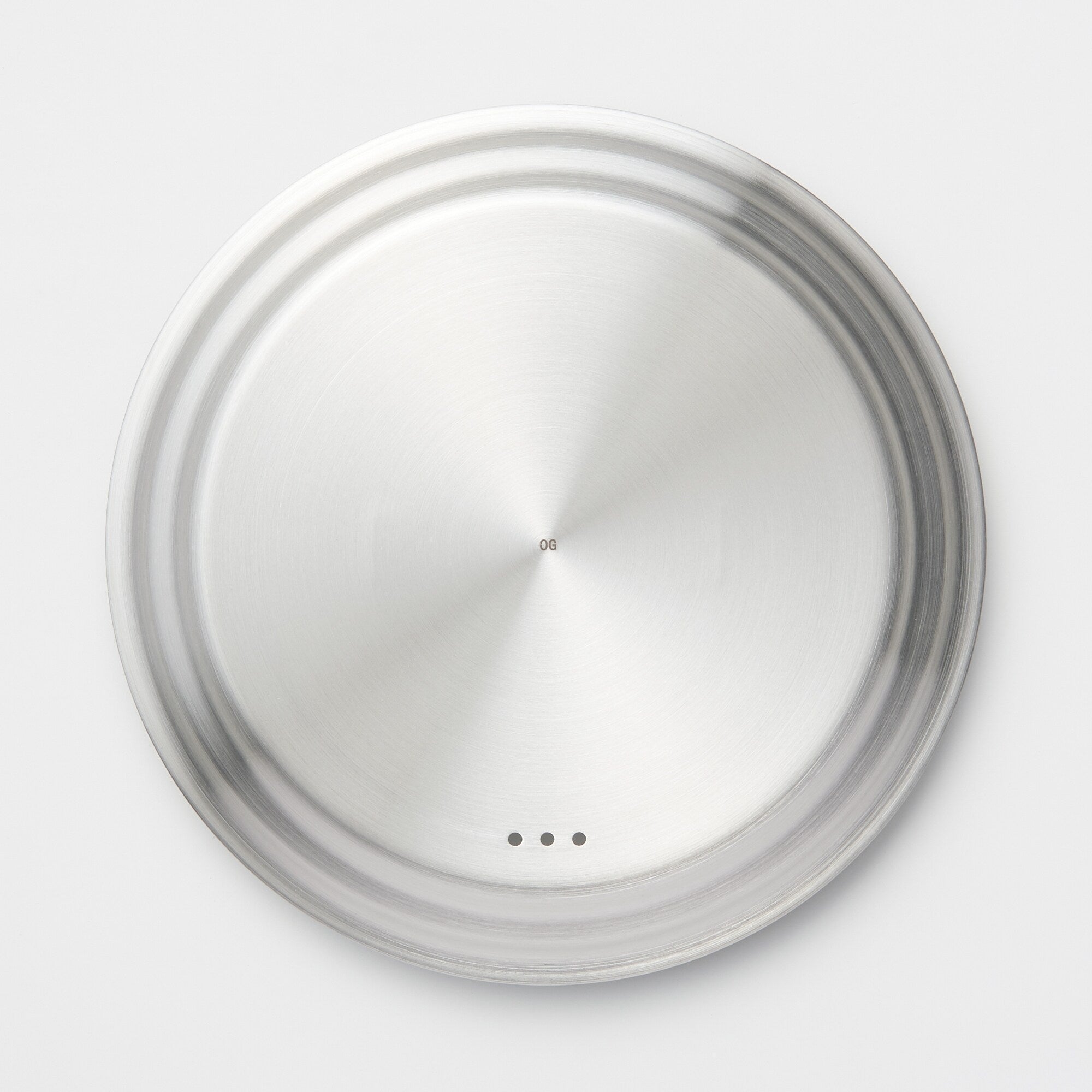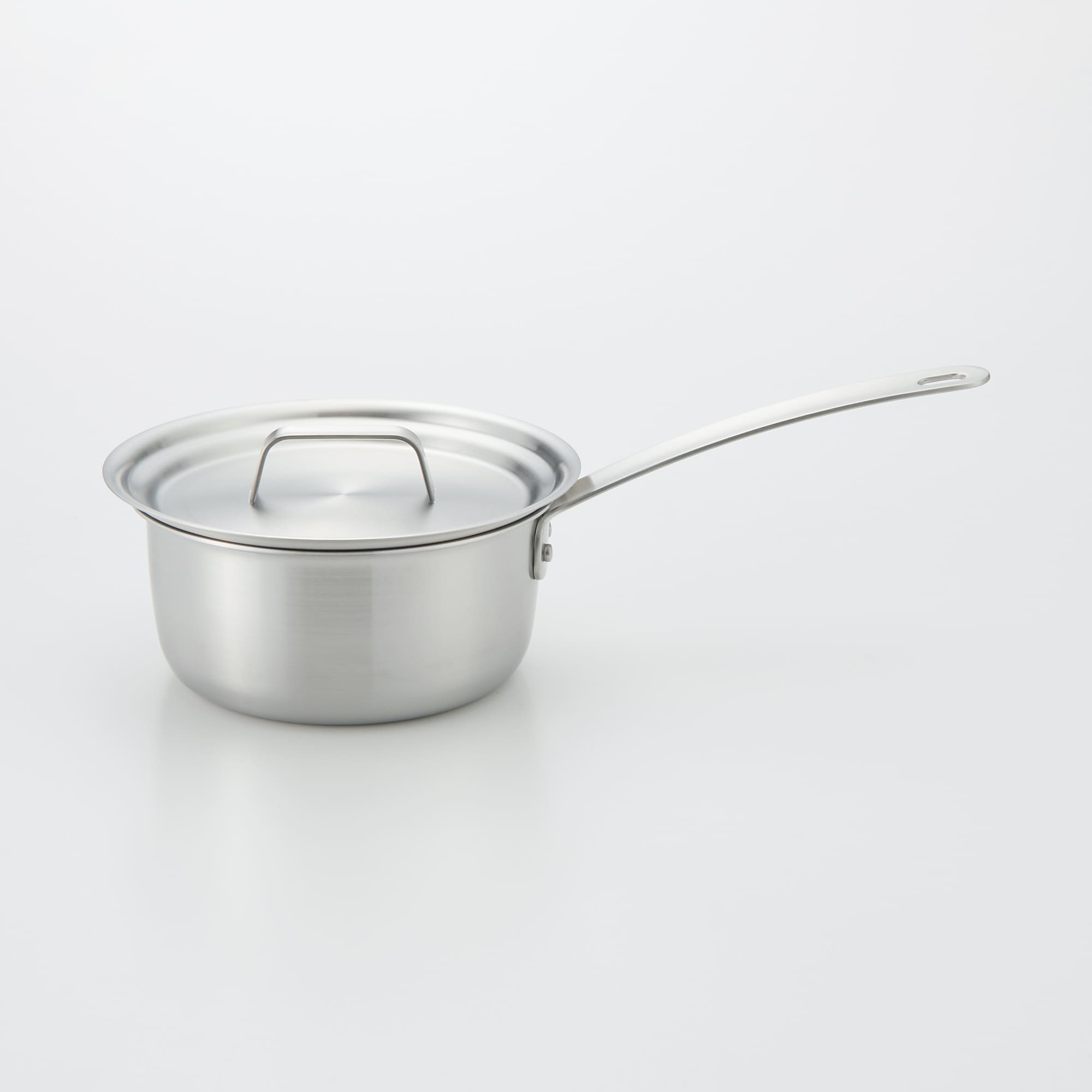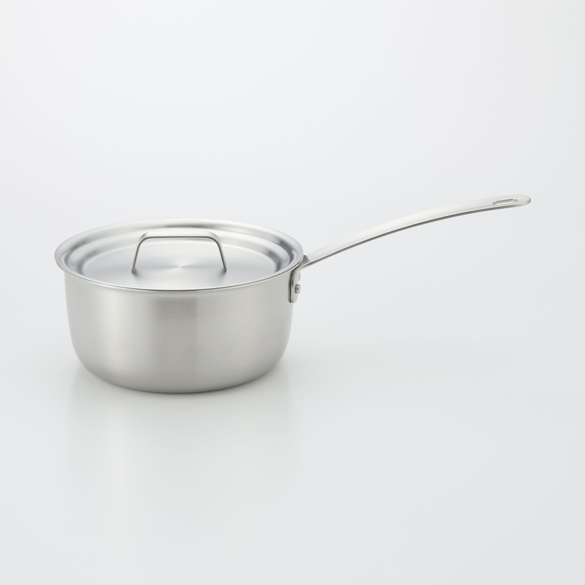 ステンレスアルミ三層鋼片手鍋用兼用フタです。収納しやすいようできるだけ平たくしました。さびに強い18-8ステンレスを使用しています。