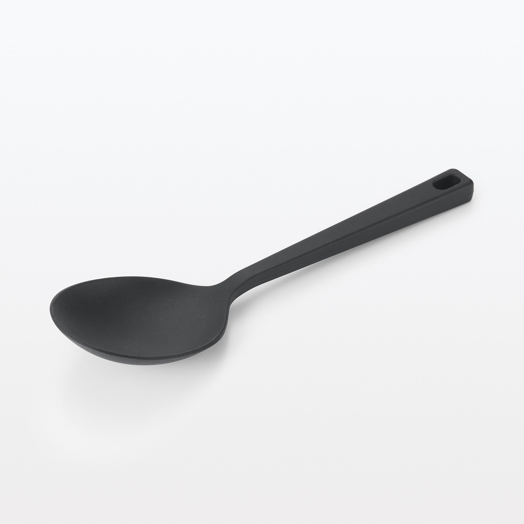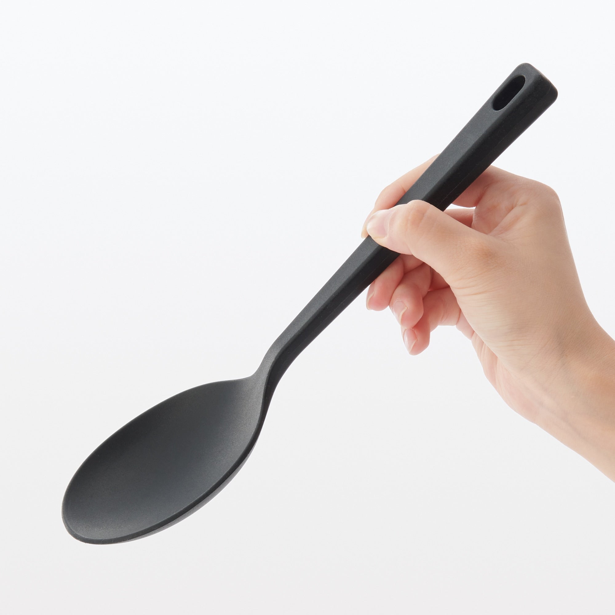 耐熱温度の高いシリコーン素材を使った、調理や取り分け時に役立つ調理スプーンです。先端の適度なしなりが鍋肌に沿い、食材を無駄なくすくい取ります。色は食材による色移りが目立ちにくいよう黒色にしています。