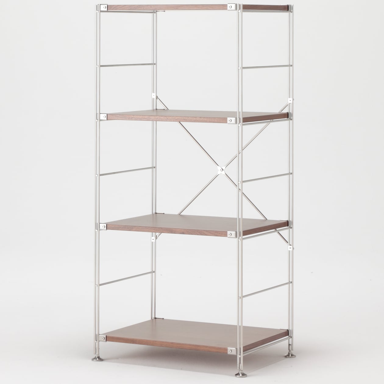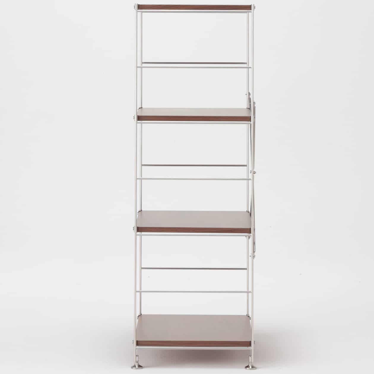 ステンレスとウォールナット材を組み合わせたオープンシェルフです。ユニット式なので、くらしの変化や好みに合わせて、帆立、棚、ワードローブバーなどオプションパーツの組み換えができます。※この商品には突板を使用しています。