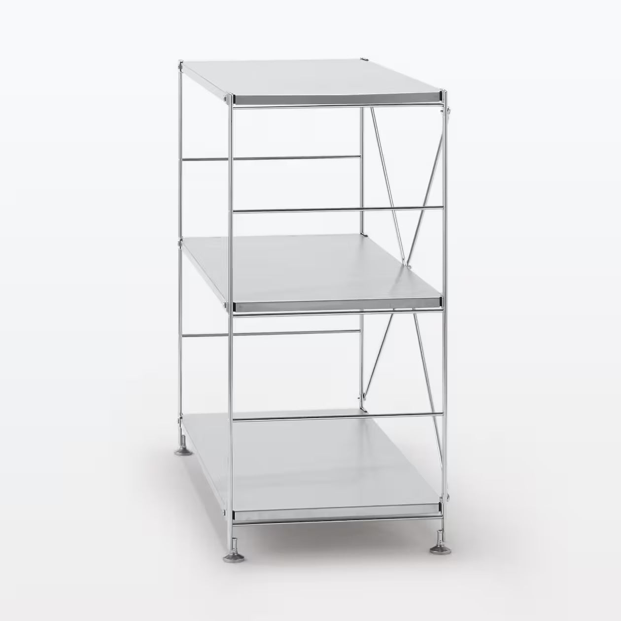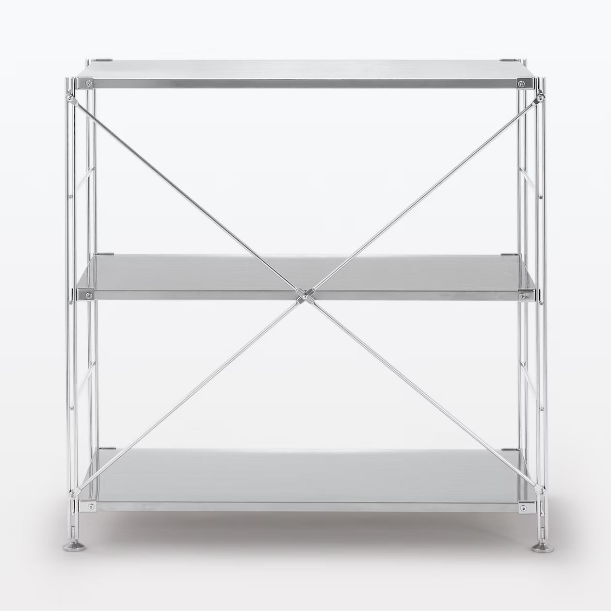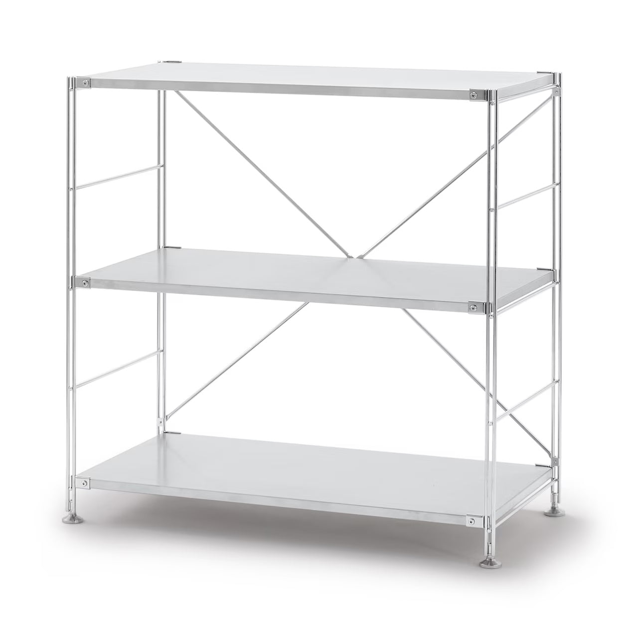 ステンレス製のオープンシェルフです。ユニット式なので、くらしの変化や好みに合わせて、帆立、棚、ワードローブバーなどオプションパーツの組み換えができます。
