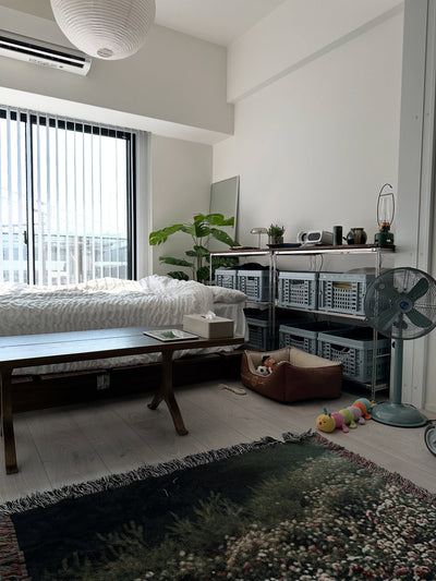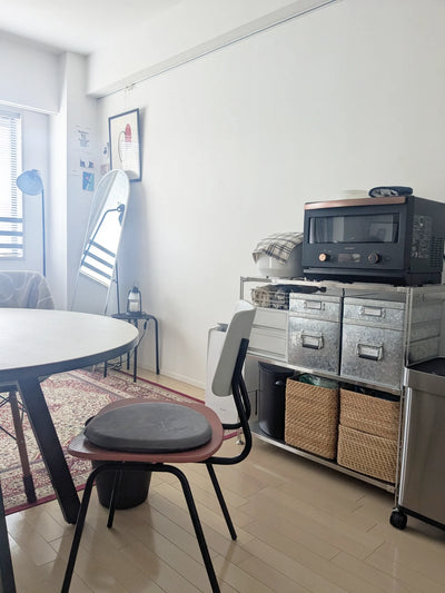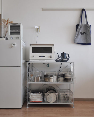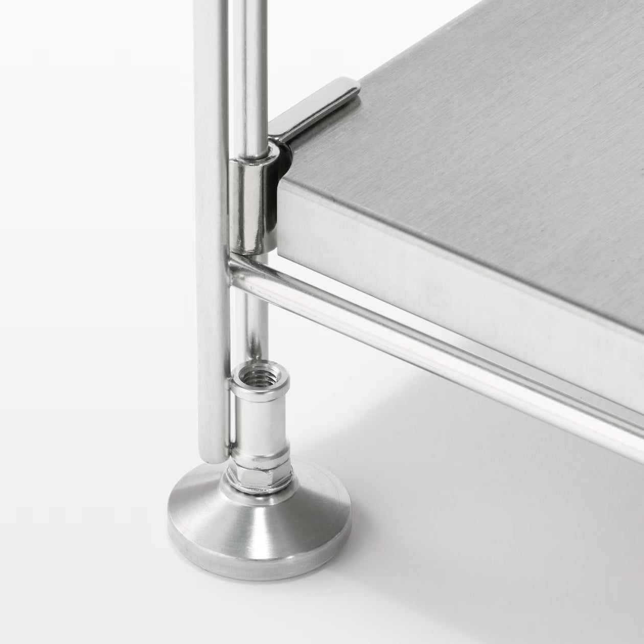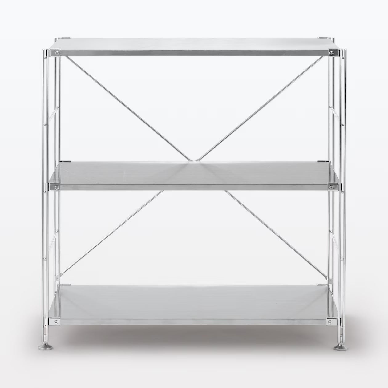 ステンレス製のオープンシェルフです。ユニット式なので、くらしの変化や好みに合わせて、帆立、棚、ワードローブバーなどオプションパーツの組み換えができます。